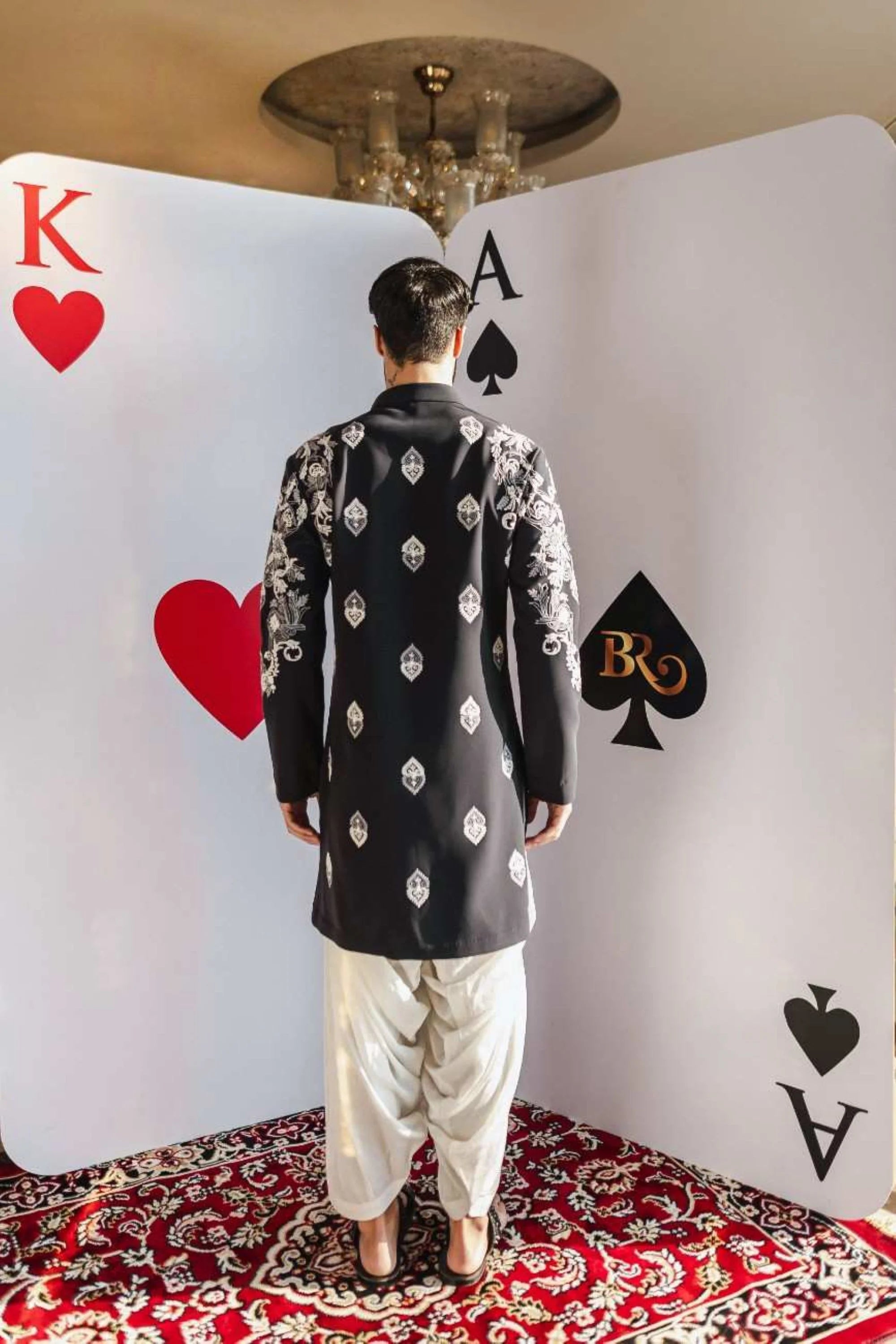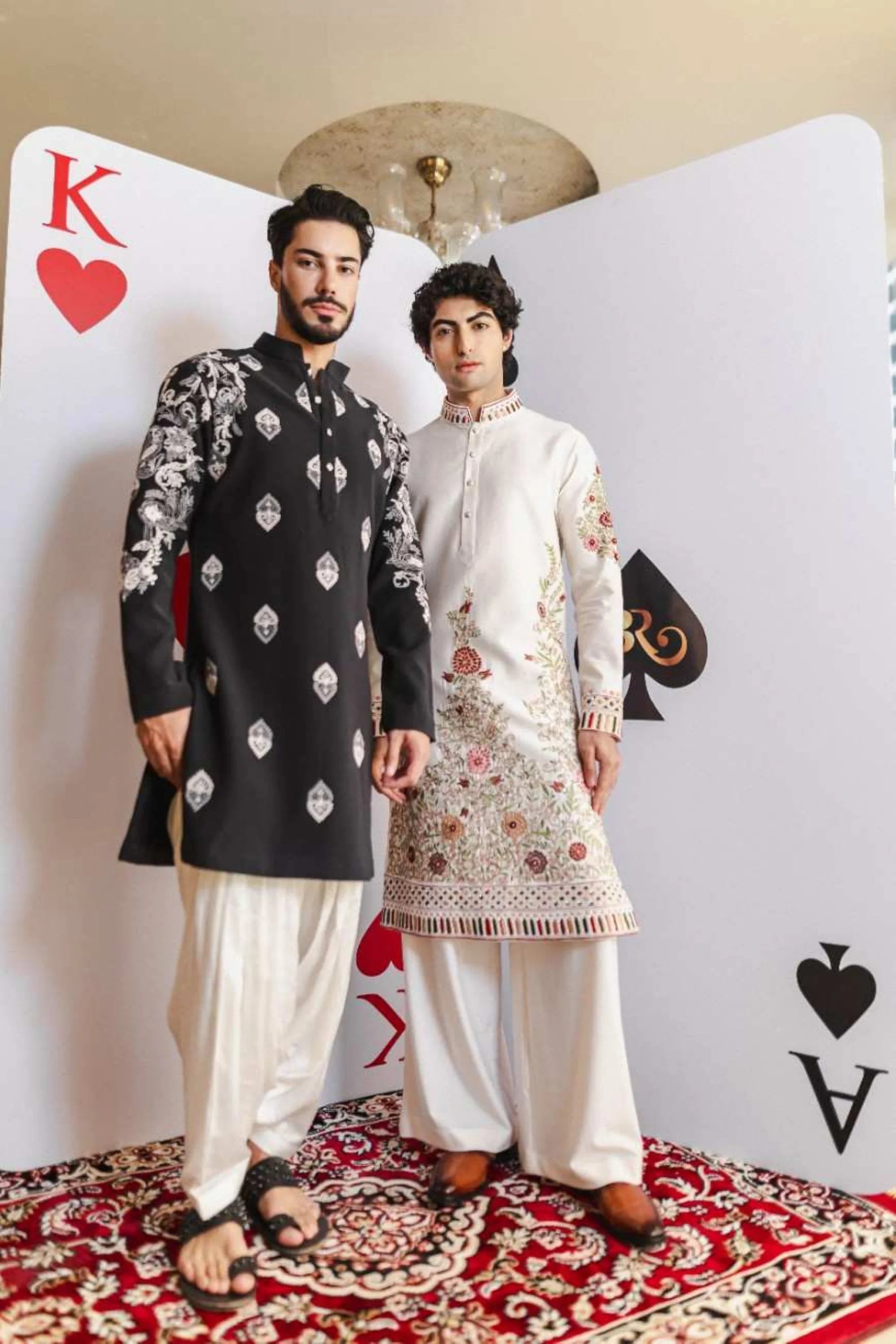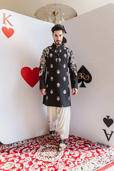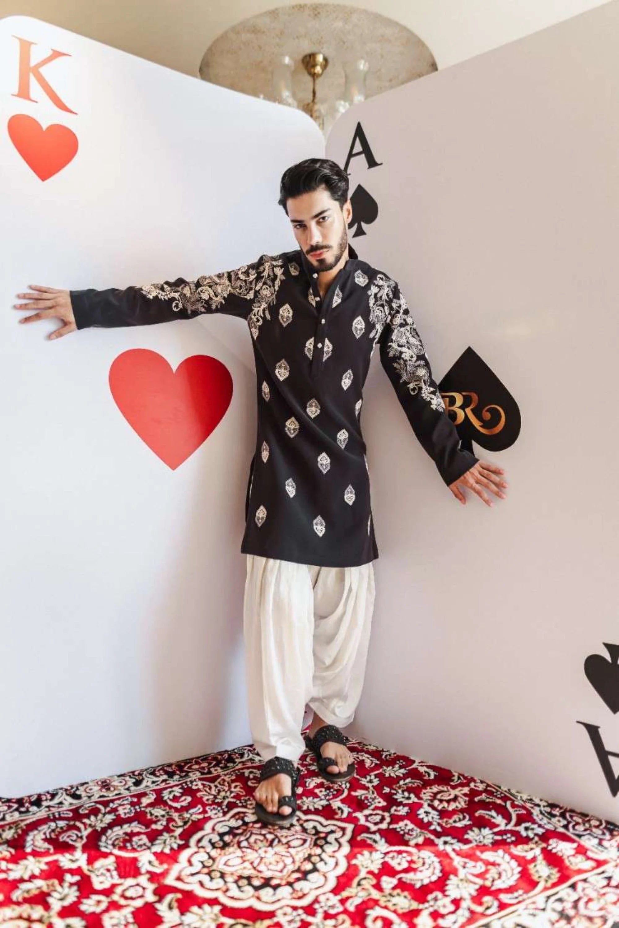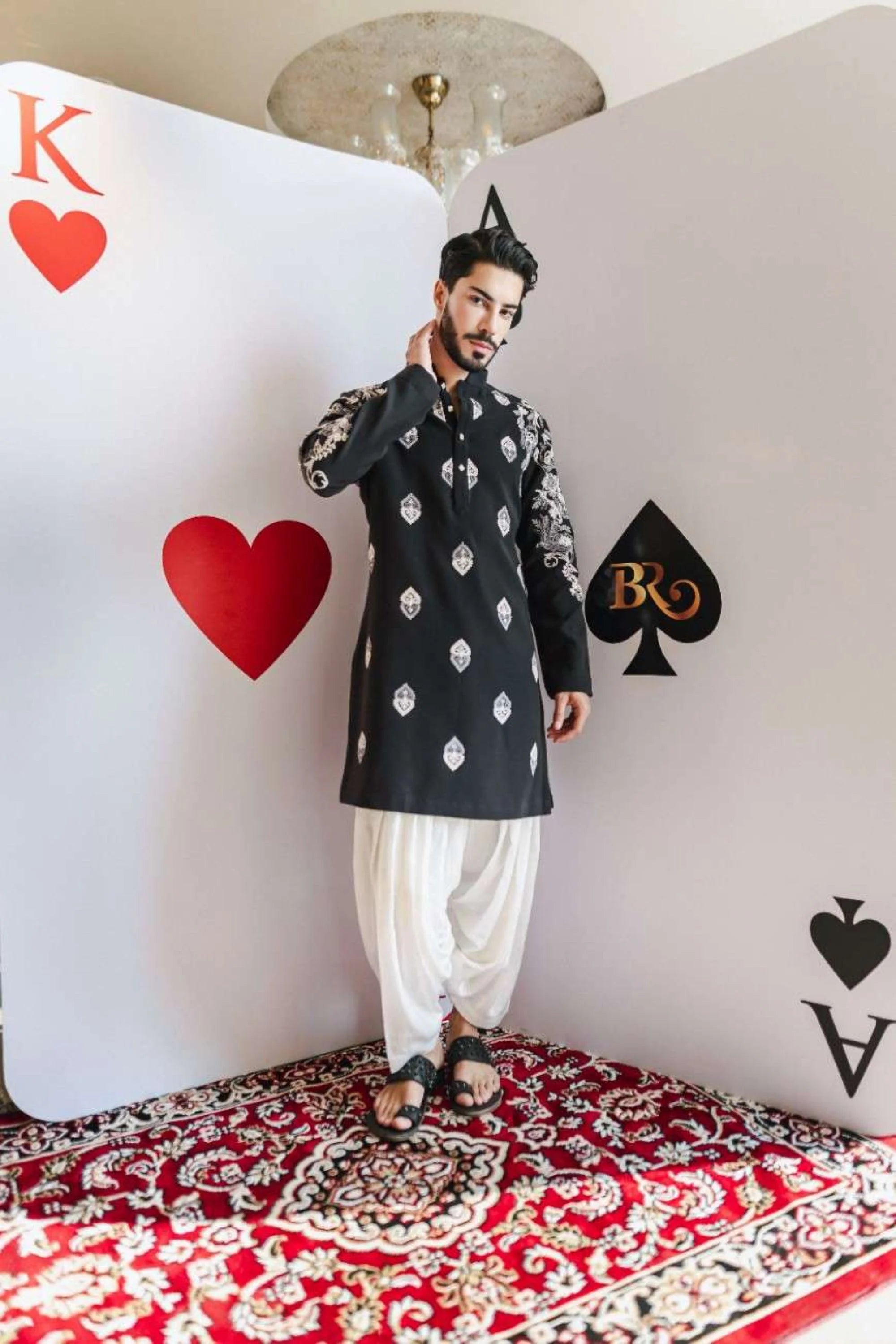 Elevate your festive wardrobe with the Ashen Motifs Kurta Set. This sophisticated dark grey kurta showcases intricate sleeve embroidery and all-over motif buttis arranged in a unique design placement. Paired with ivory dhoti pants, it creates a refined and elegant ensemble, perfect for weddings, Diwali, and festive occasions. Blend tradition with modern style effortlessly with this curated kurta set.