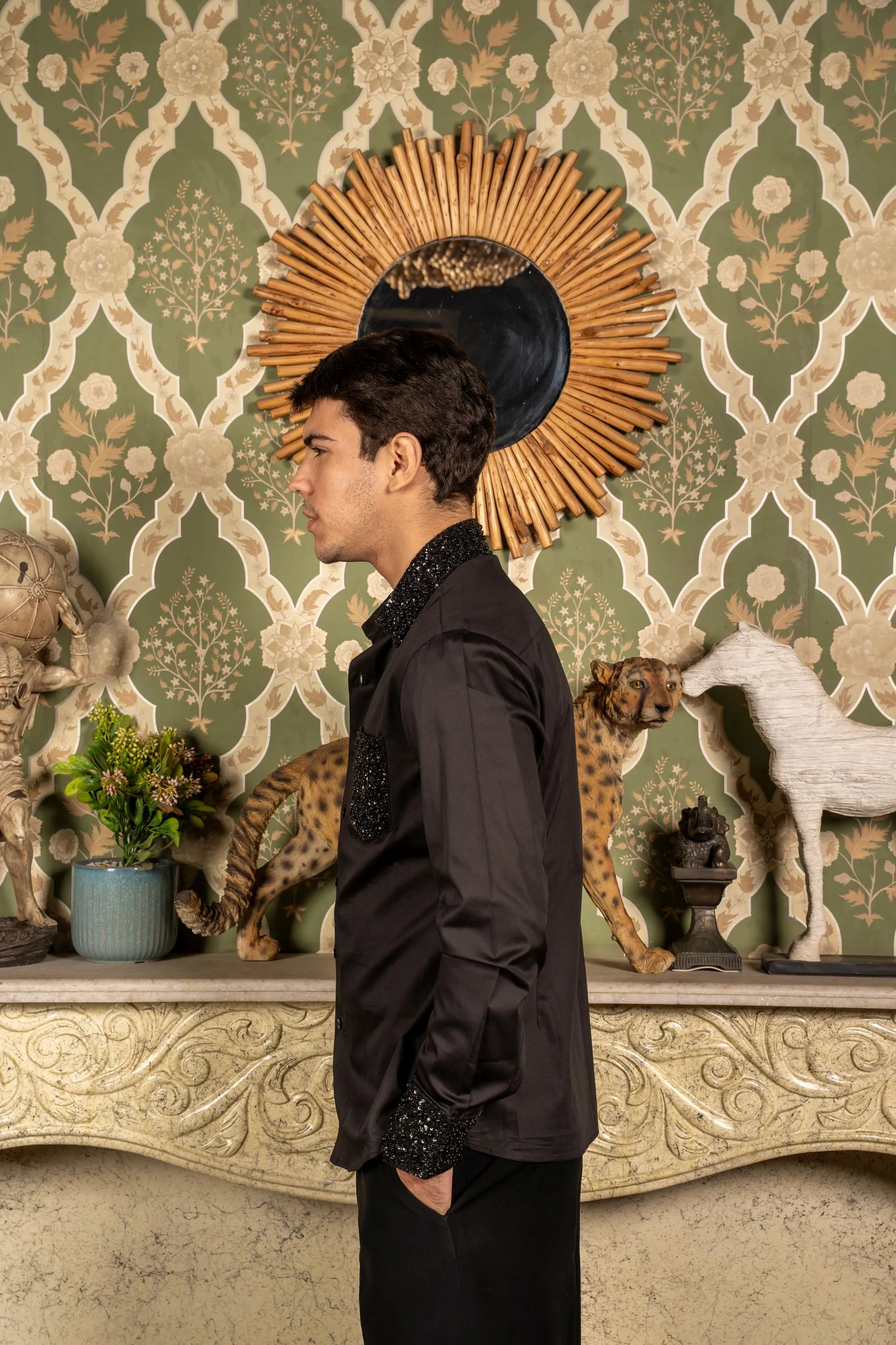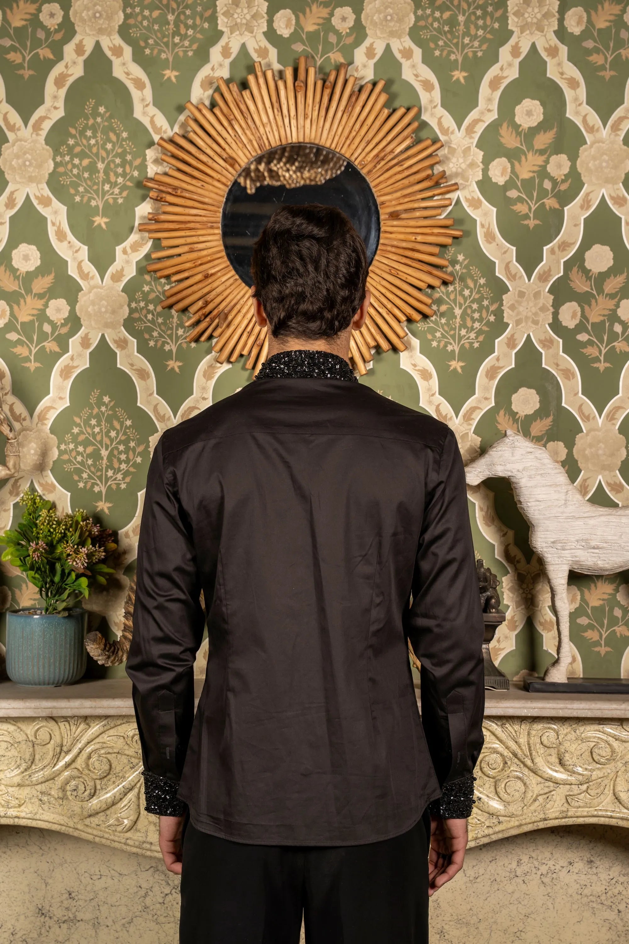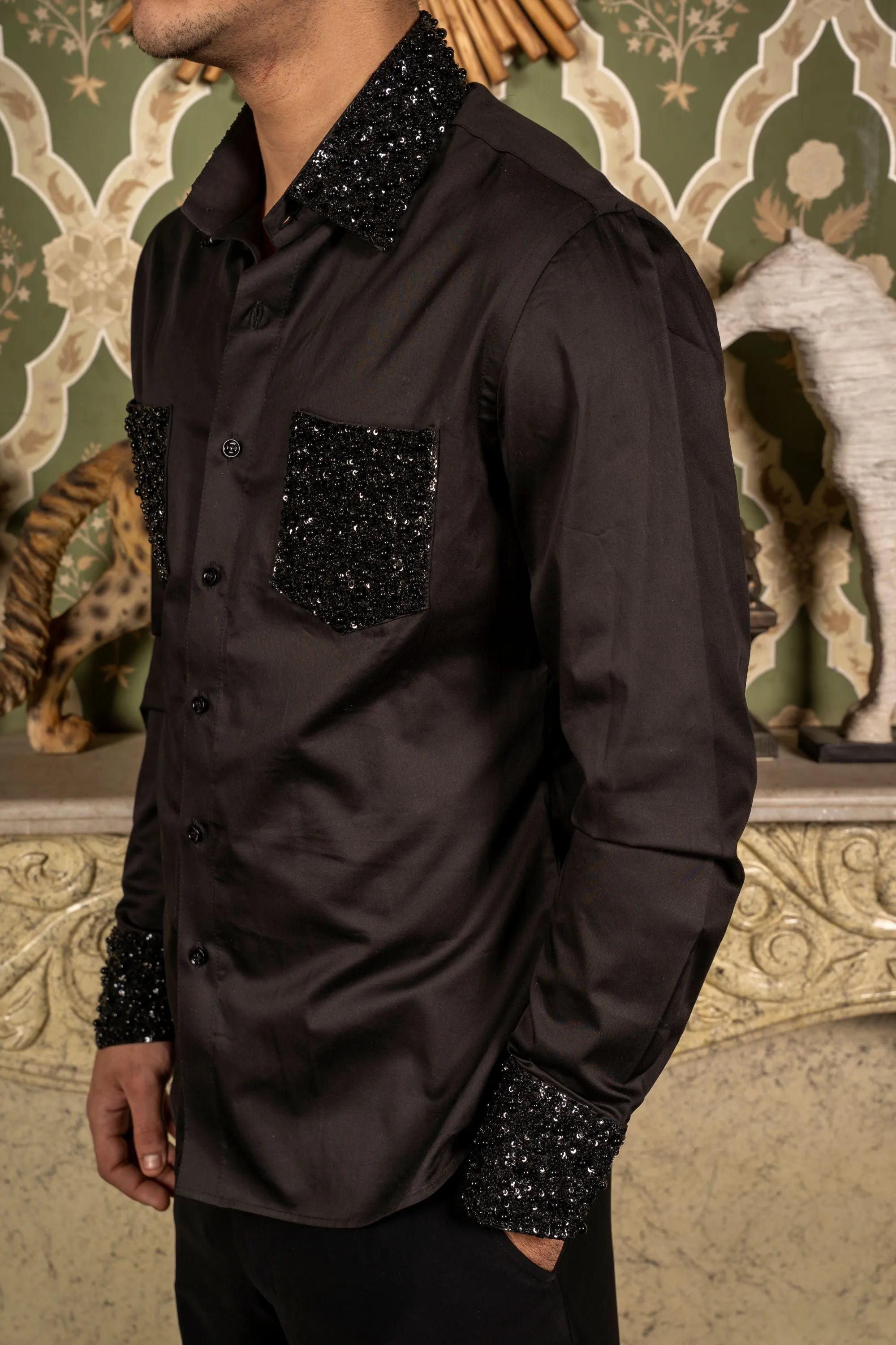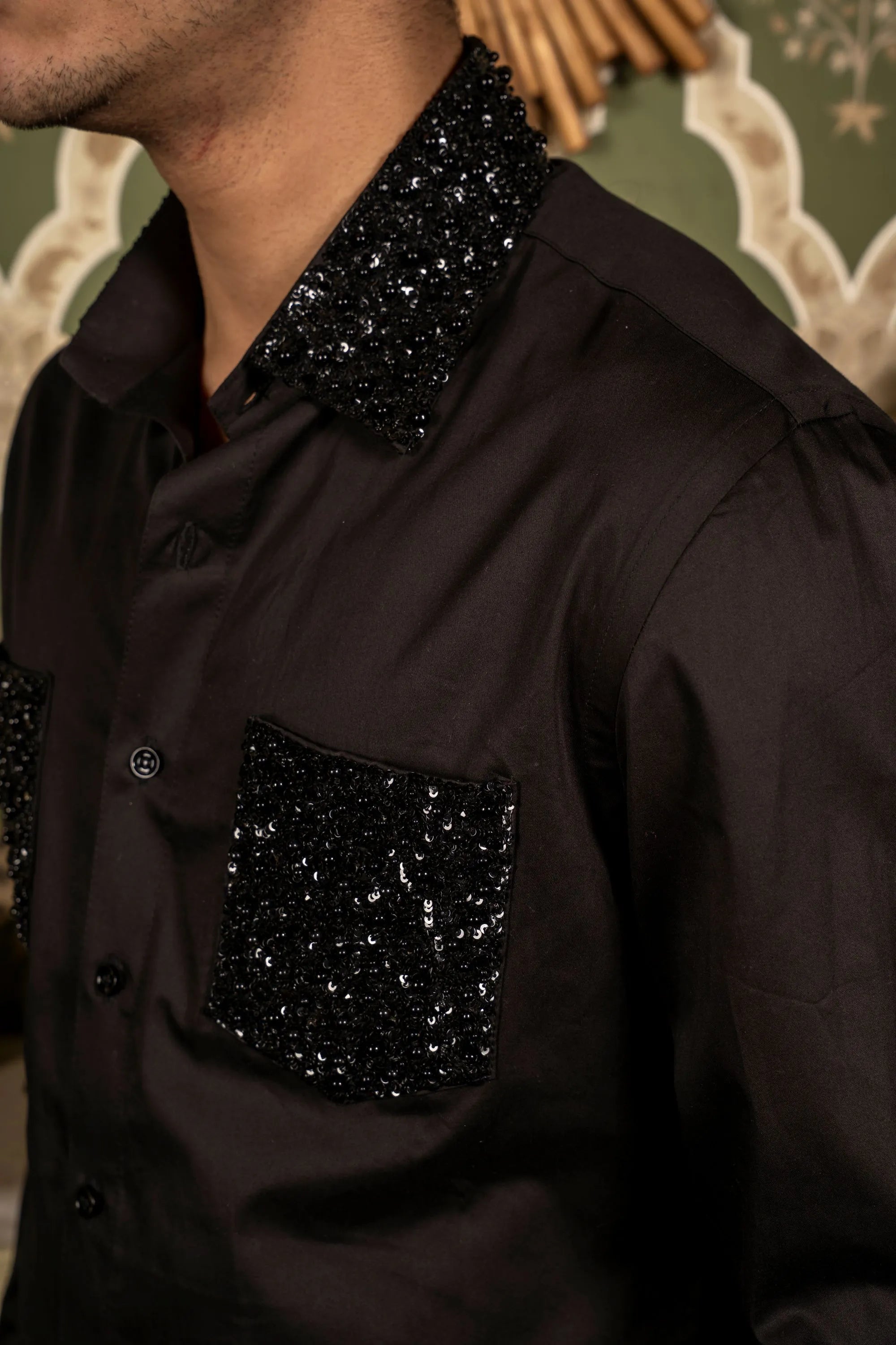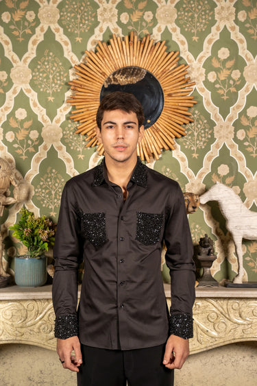 Black shirt featuring hand embroidery with subtle bling detailing on the pockets, cuffs, and collar for a stylish, modern touch.