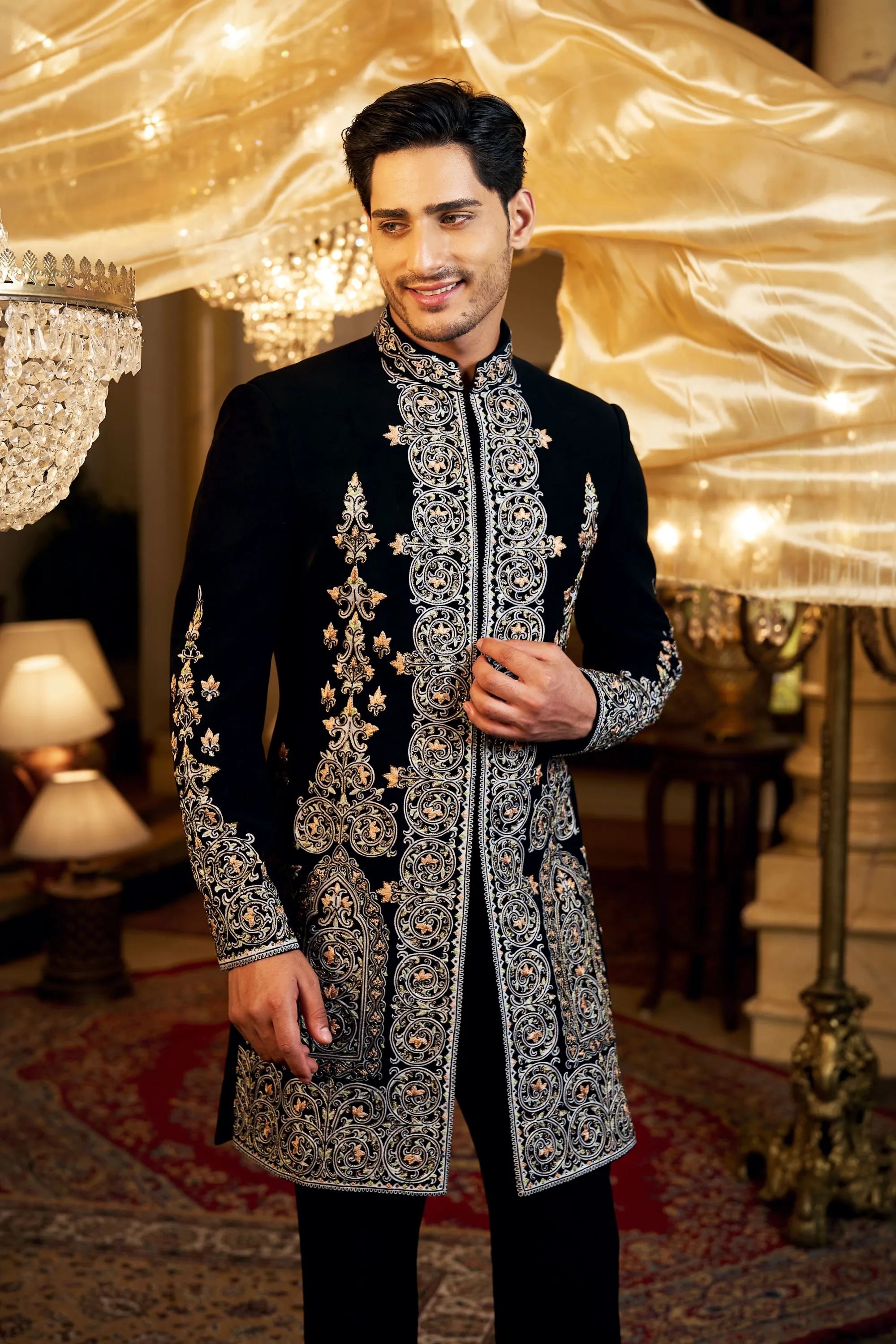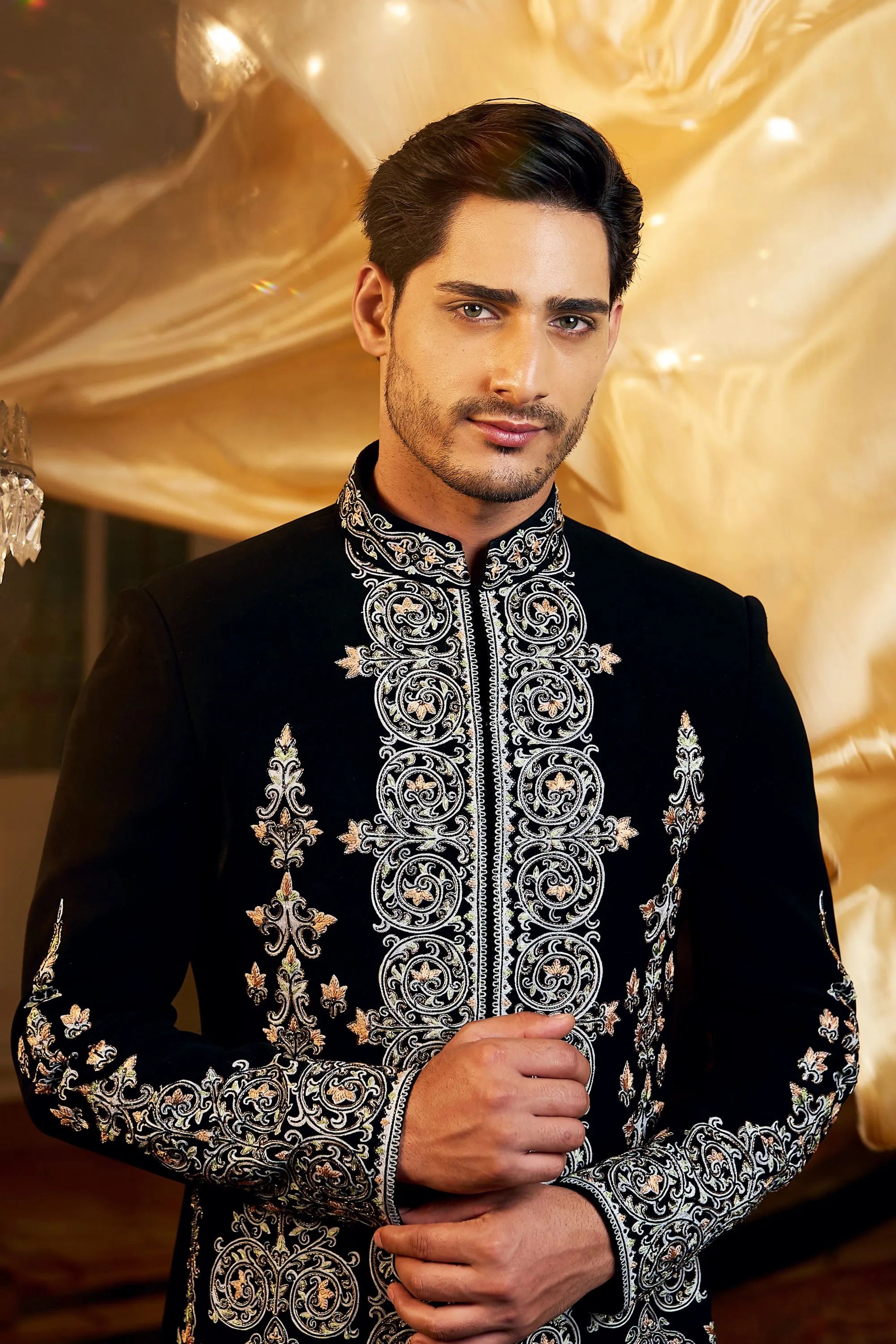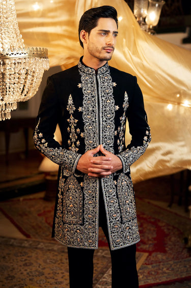Crafted from premium suiting Italian fabric, this black Indo-western features intricate Constantine thread and hand embroidery with a heavy floral border. Rich, structured, and regal, it’s designed for grand festive and wedding occasions.
