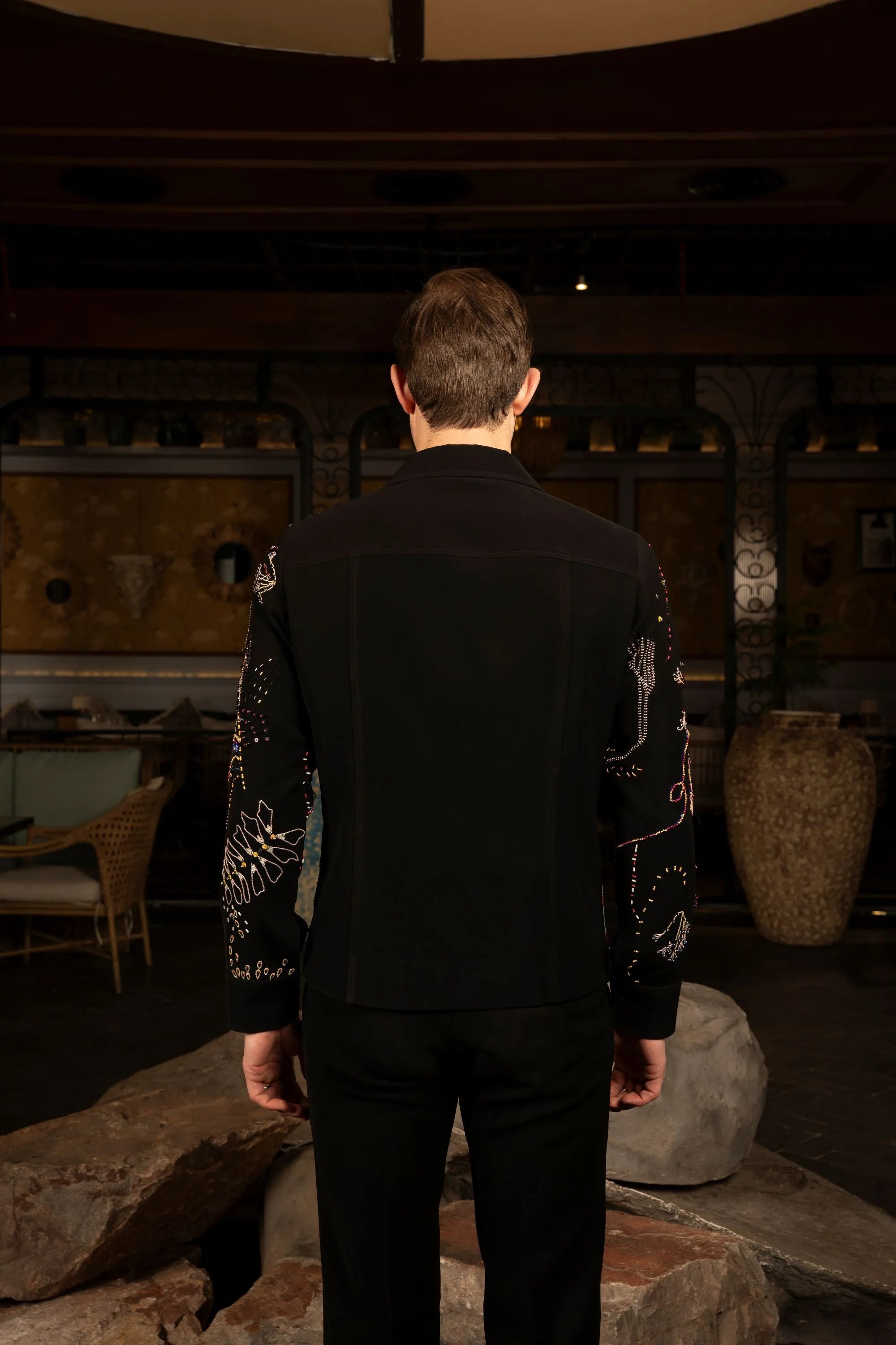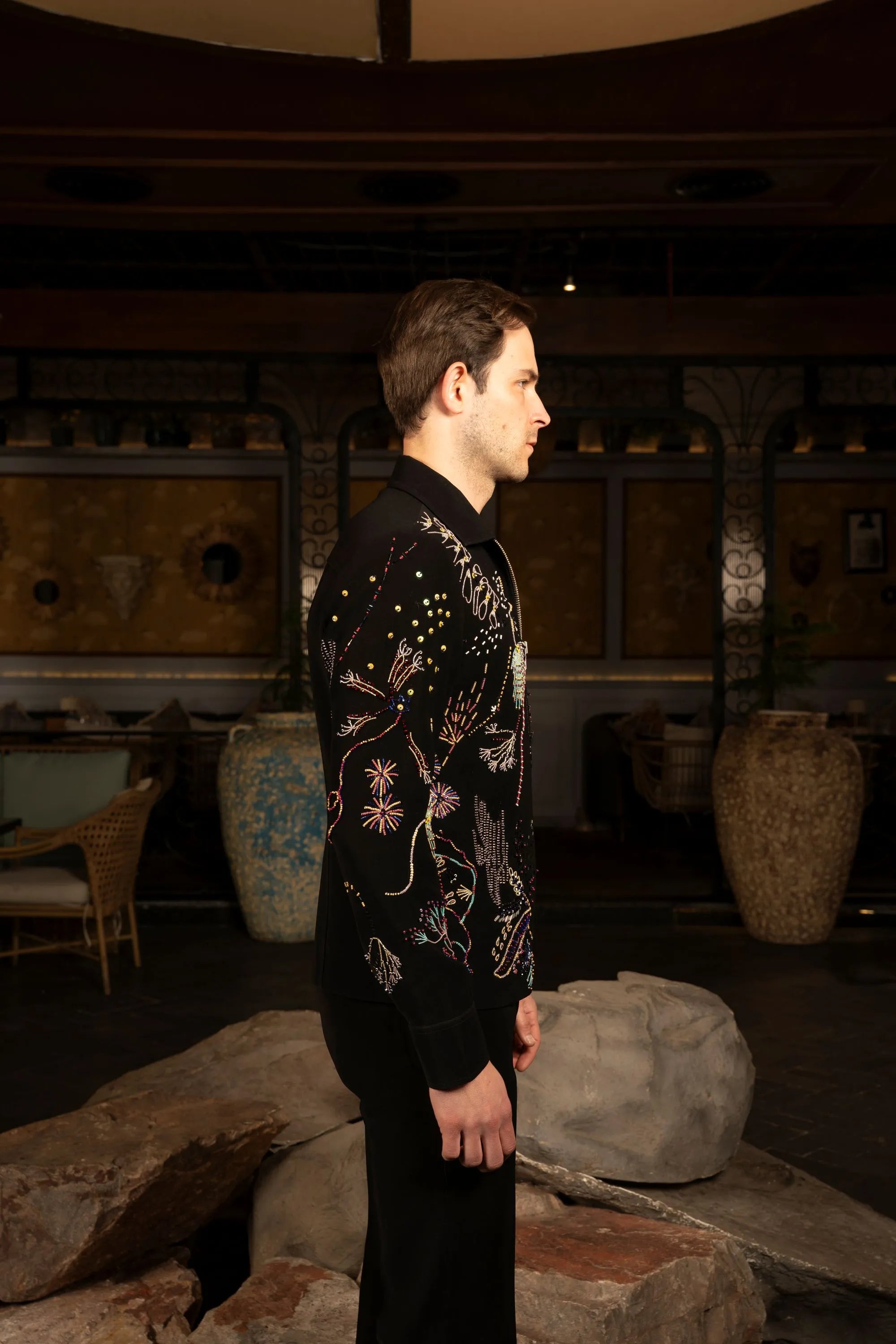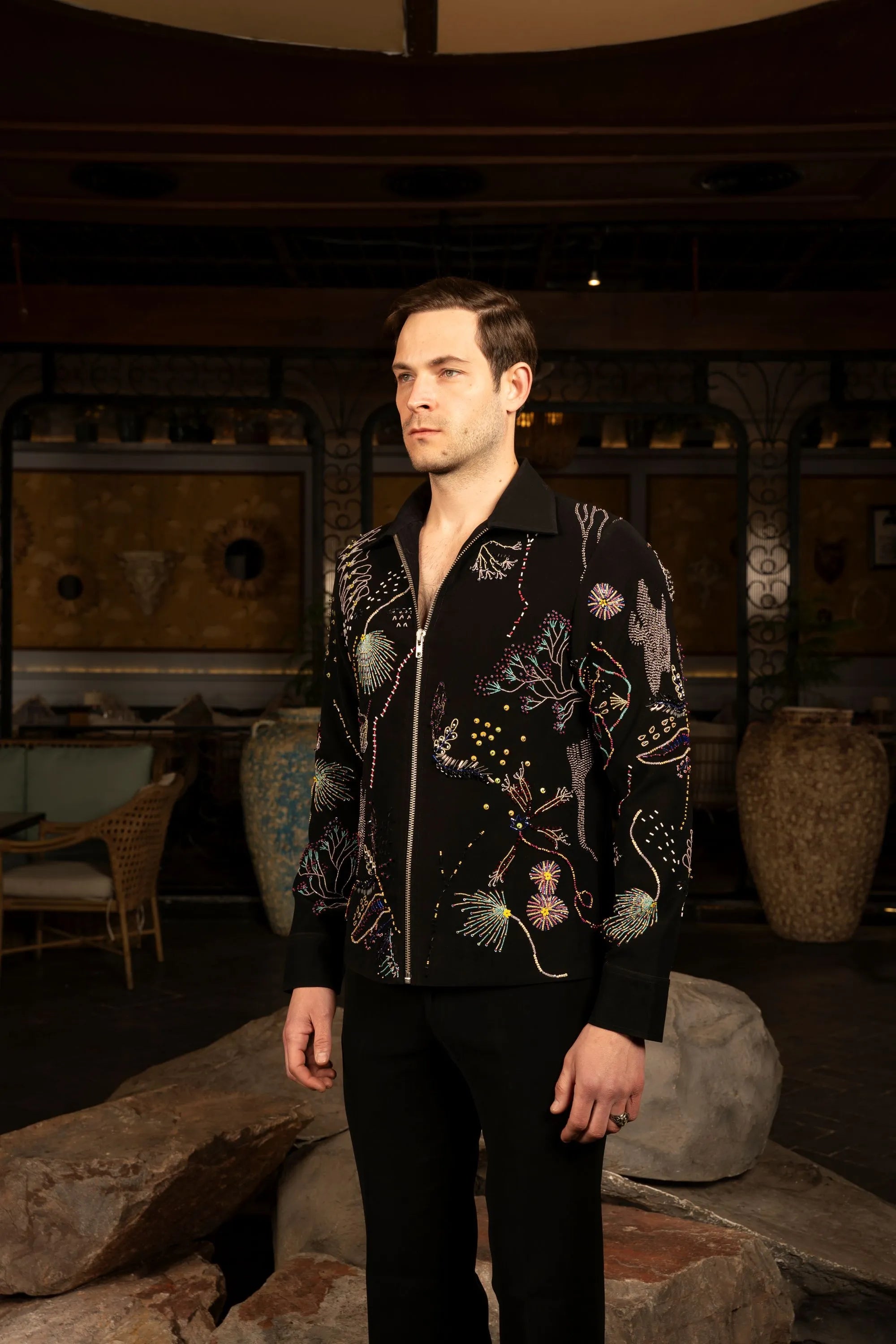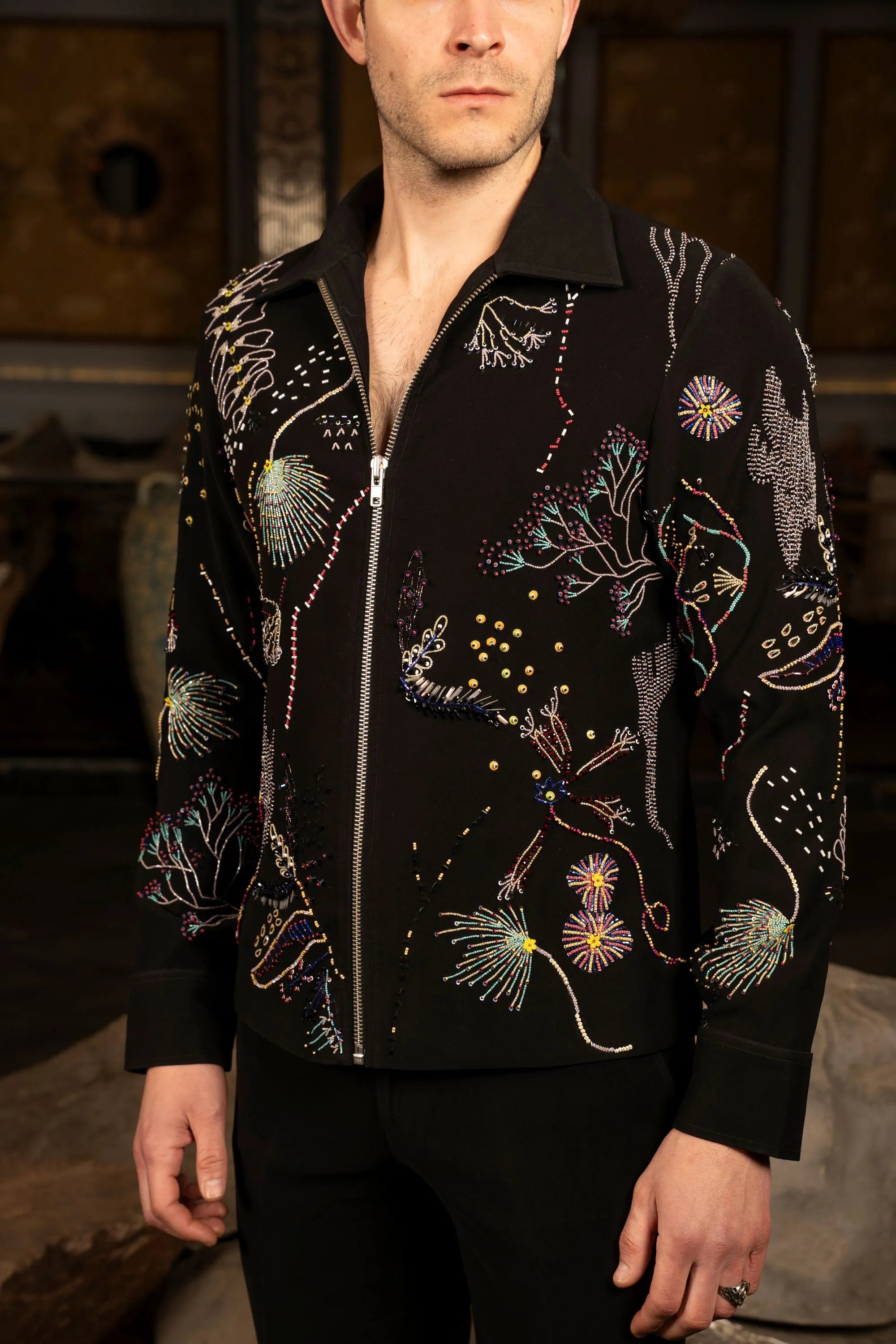 Light Magna fabric jacket in black, detailed with multicolor hand embroidery featuring abstract floral and fauna motifs for a bold, artistic statement.