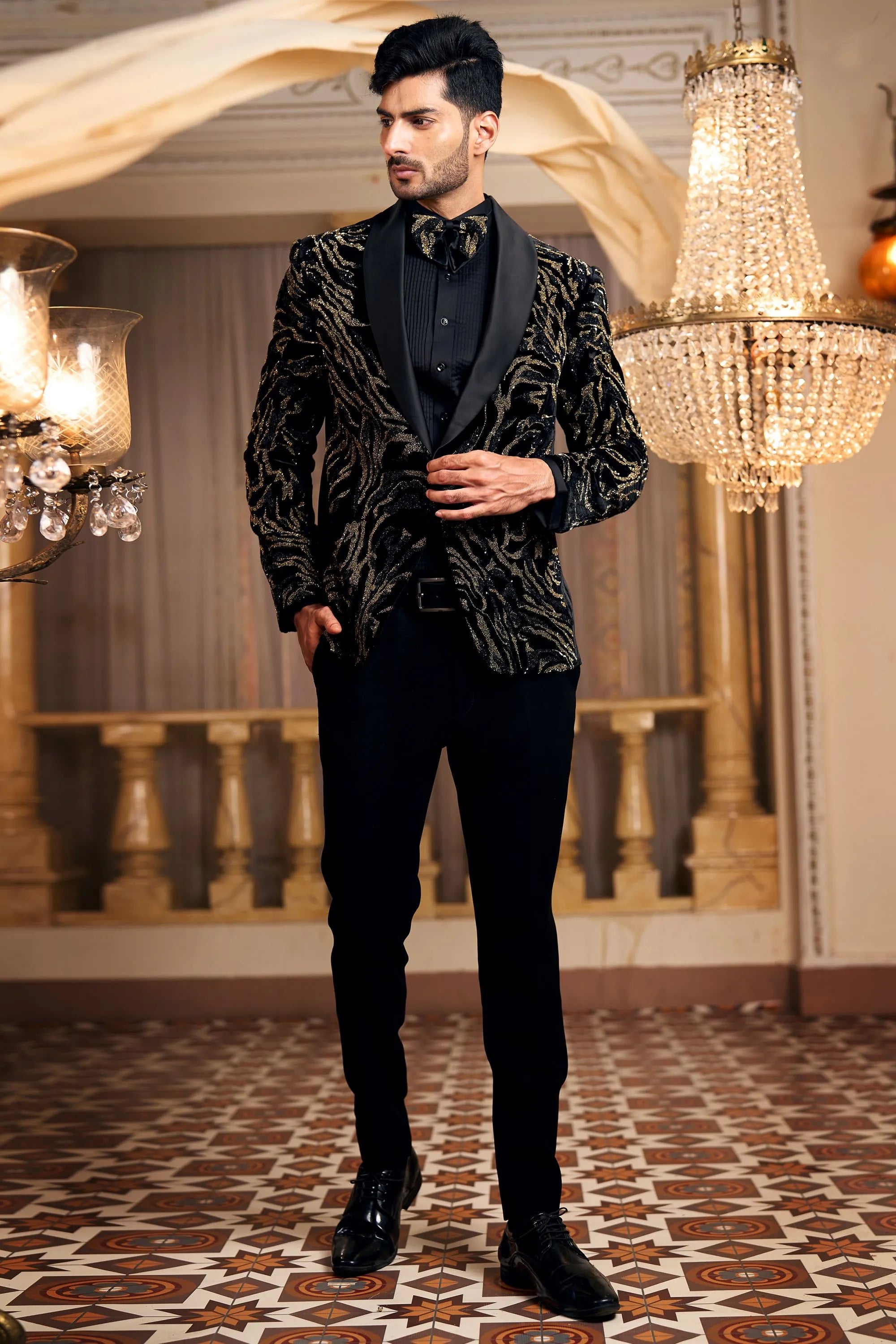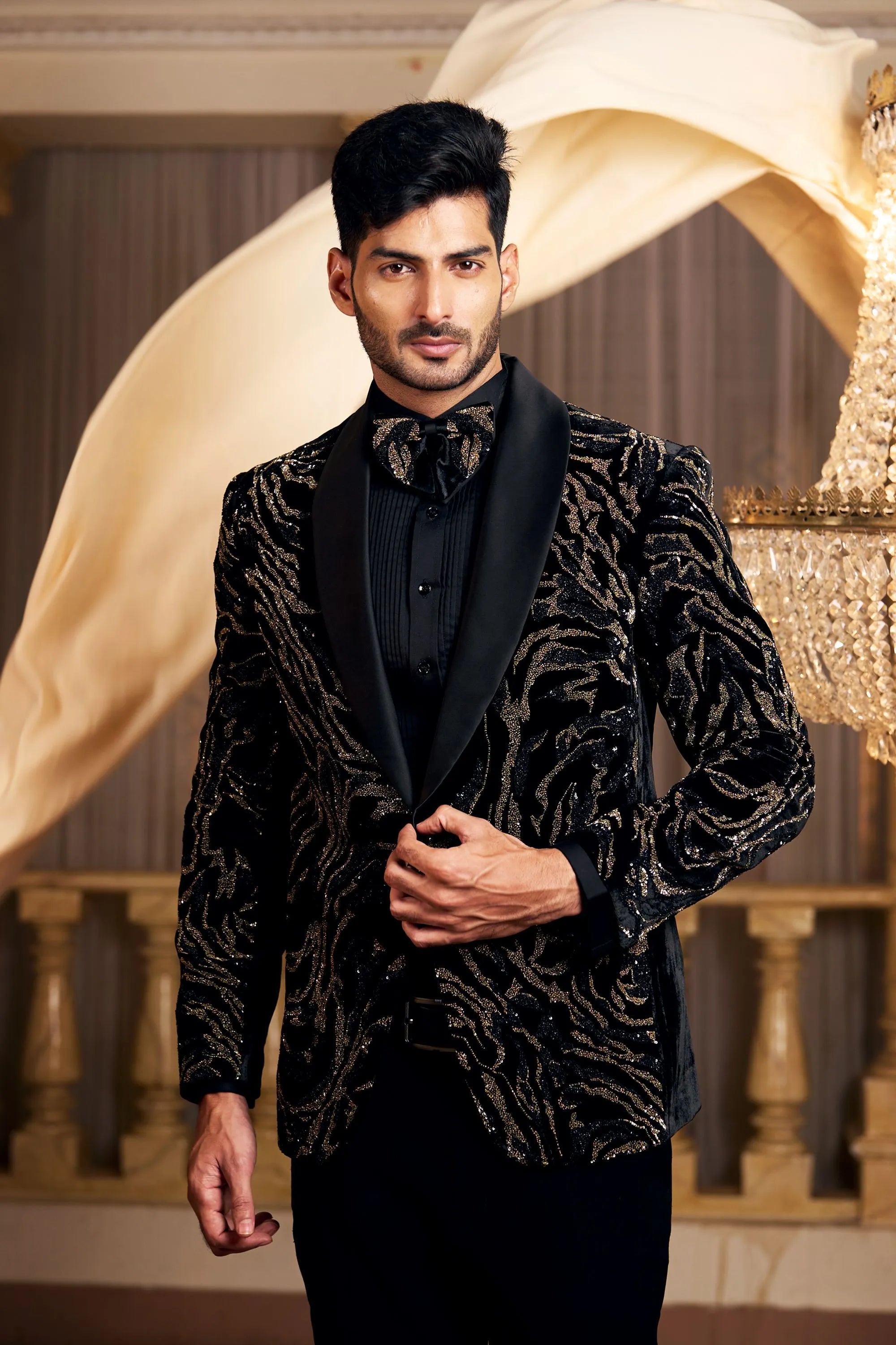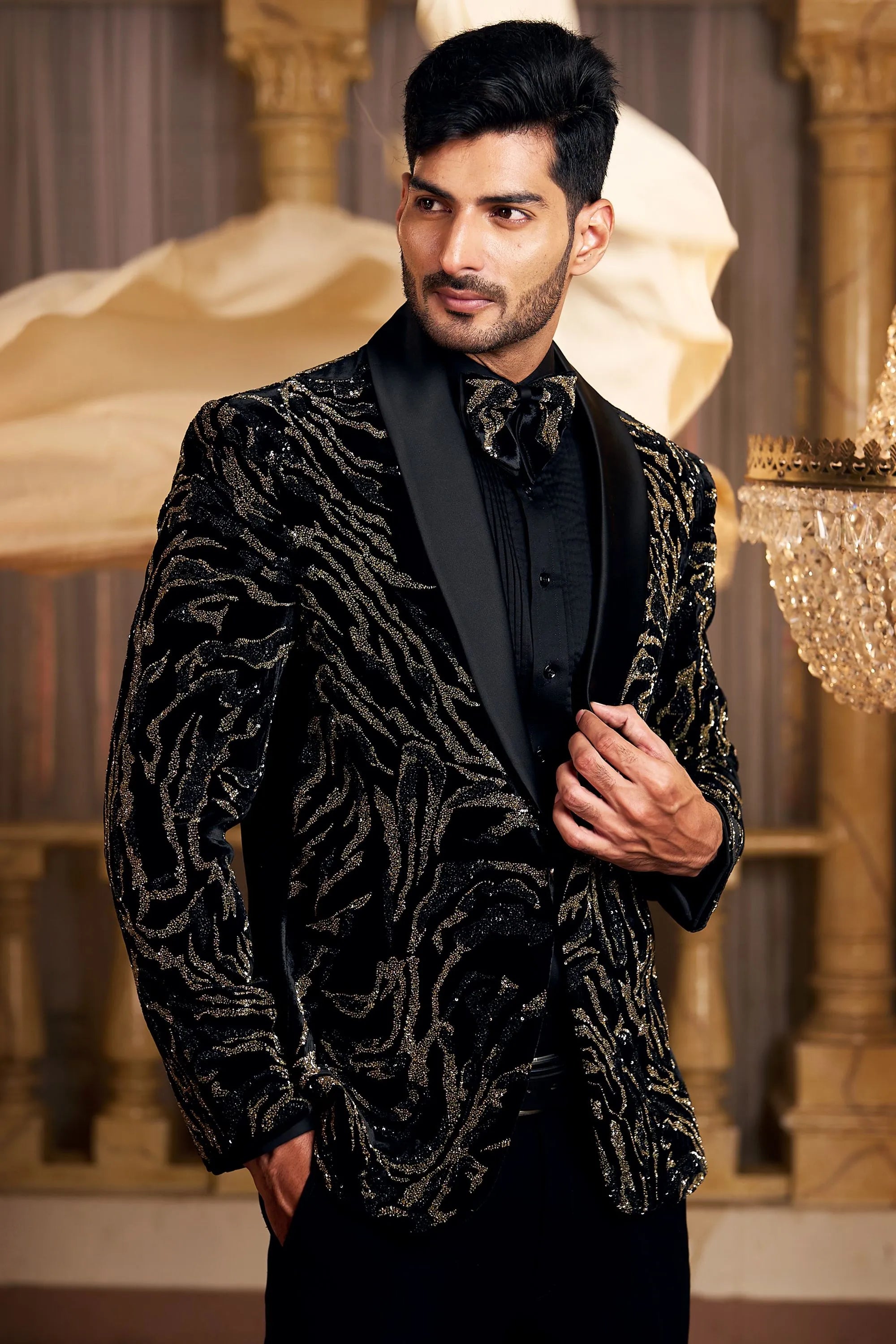 This black silk velvet tuxedo features a bold golden tiger-skin stroke pattern, elevated with 3D hand embroidery for a fierce, luxurious finish. Completed with a satin shawl-collar lapel, it delivers a powerful statement for high-impact evening wear. Paired with embroidered bow