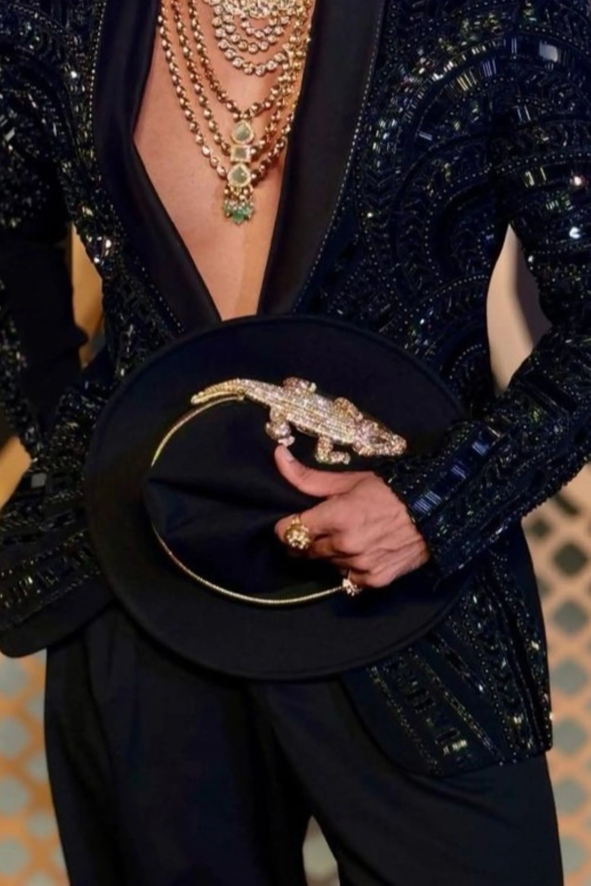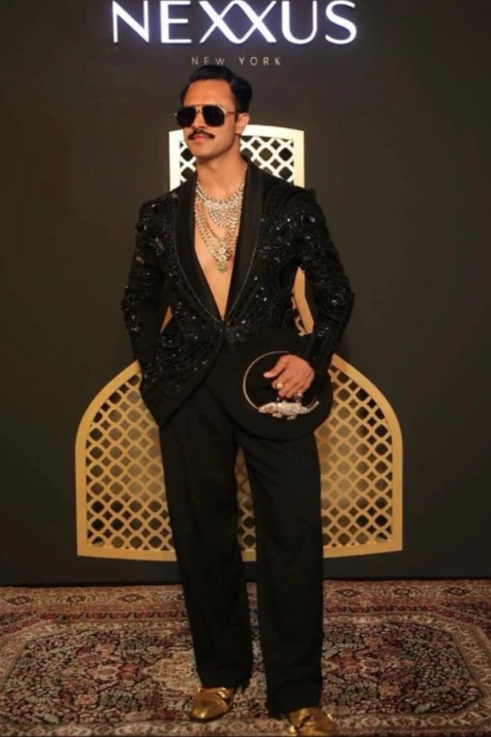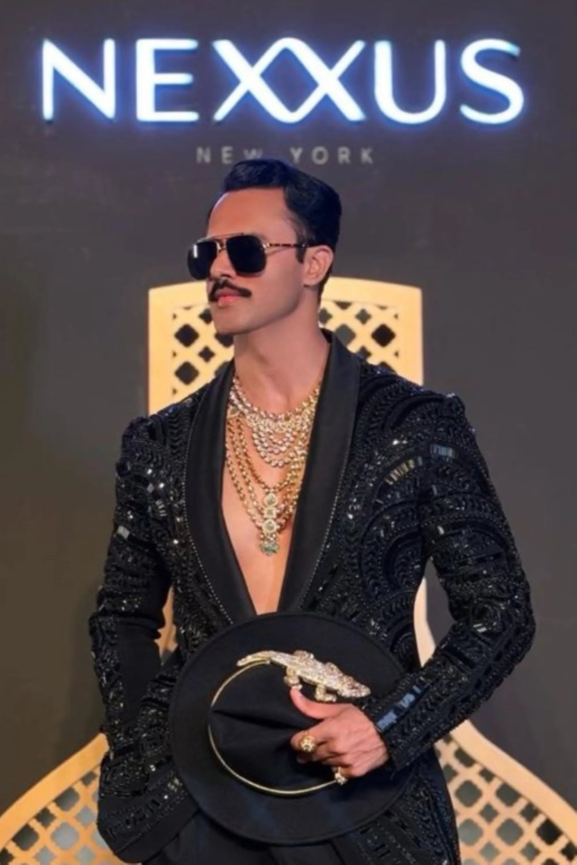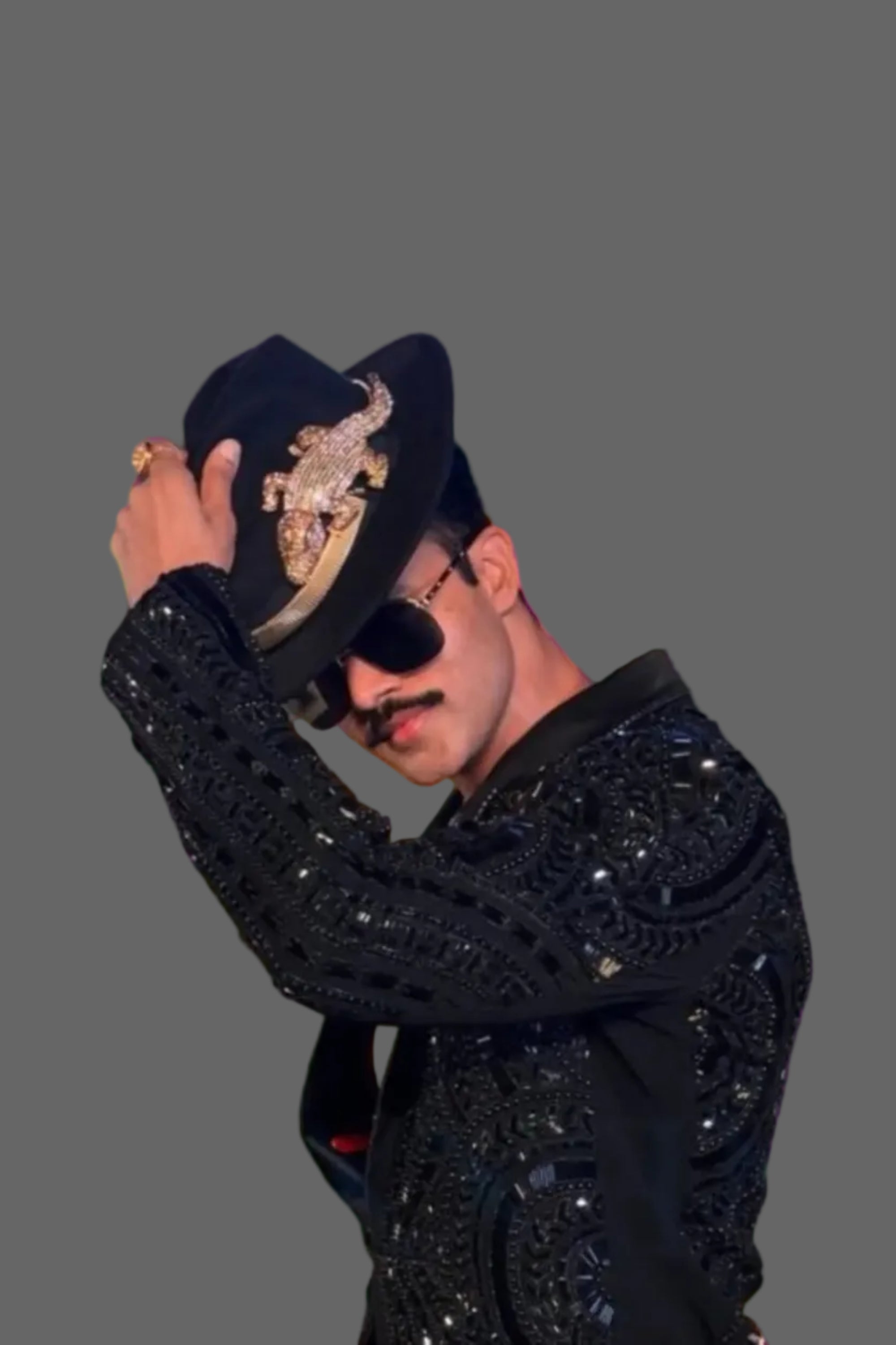 This luxurious black tuxedo is crafted with heavy stud, cut dana, and pearl handwork, creating an intense shine and sharp texture. With its sleek silhouette and high-gloss finish, it’s a bold statement piece—perfect for red carpet events, cocktail nights, and elite occasions.
