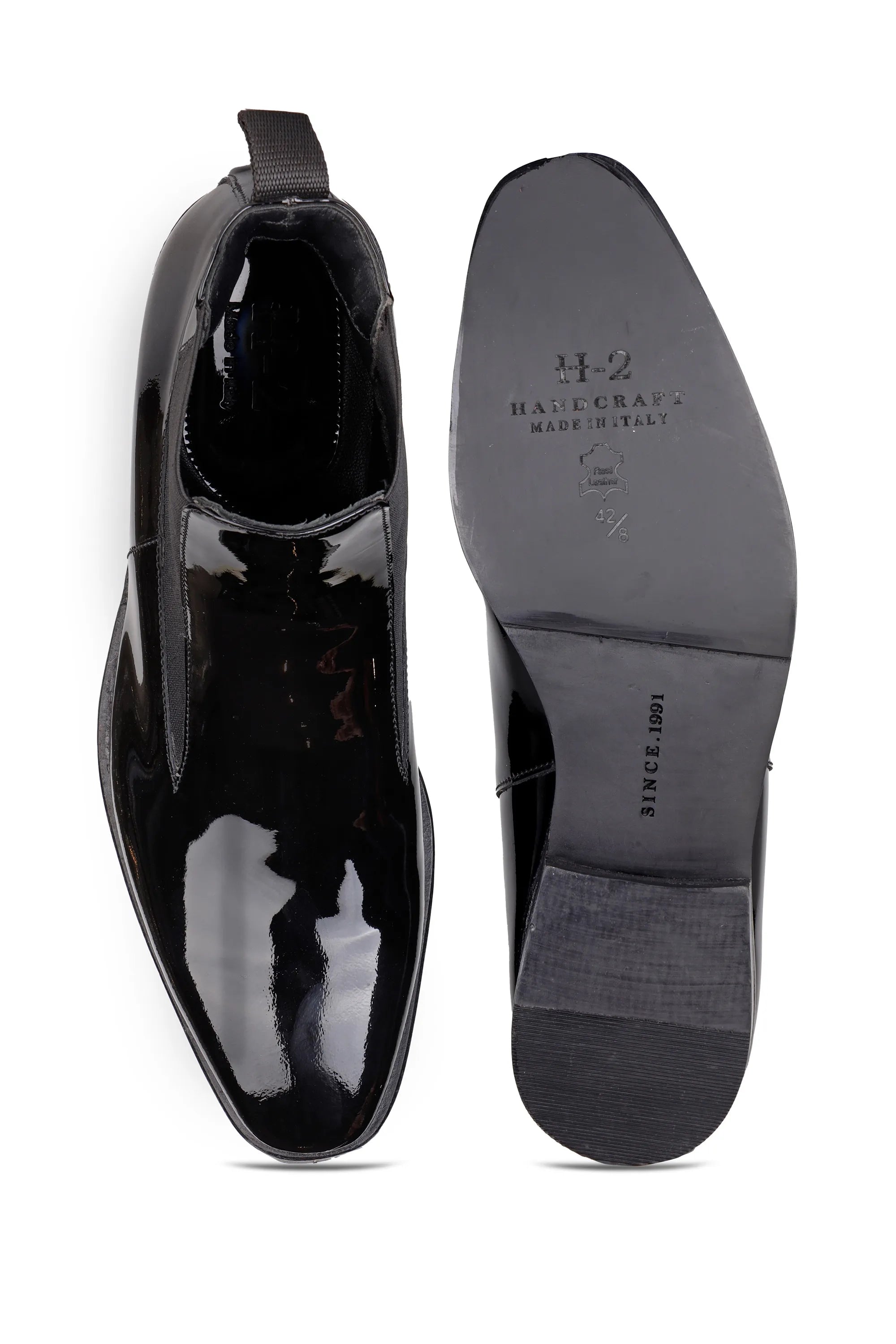 These Black Patent Leather Chelsea Boots feature a sleek high-gloss finish that delivers a sharp and modern look. Designed with elastic side panels for easy slip-on comfort and a secure fit, these boots combine timeless style with premium craftsmanship. The smooth patent leather, clean silhouette, and durable sole make them perfect for formal wear, parties, weddings, and luxury styling.