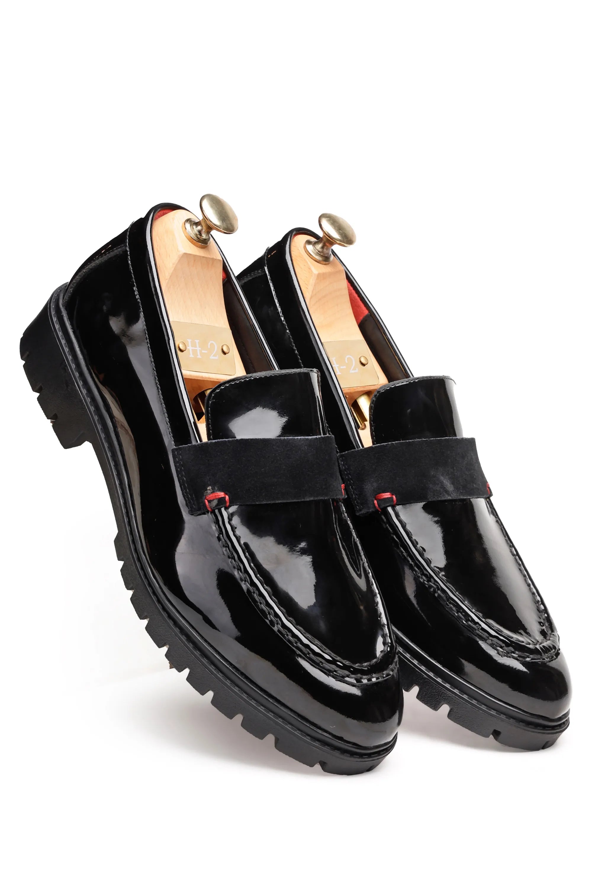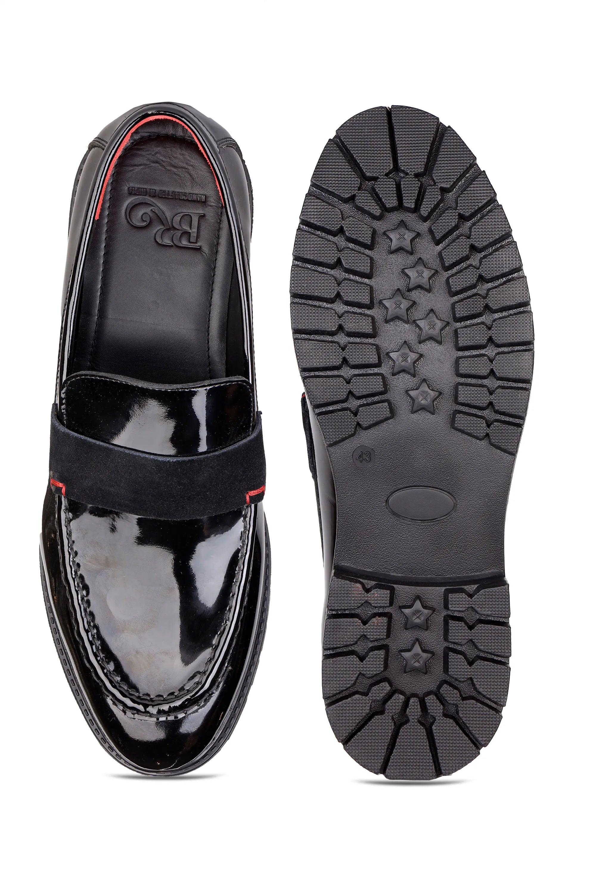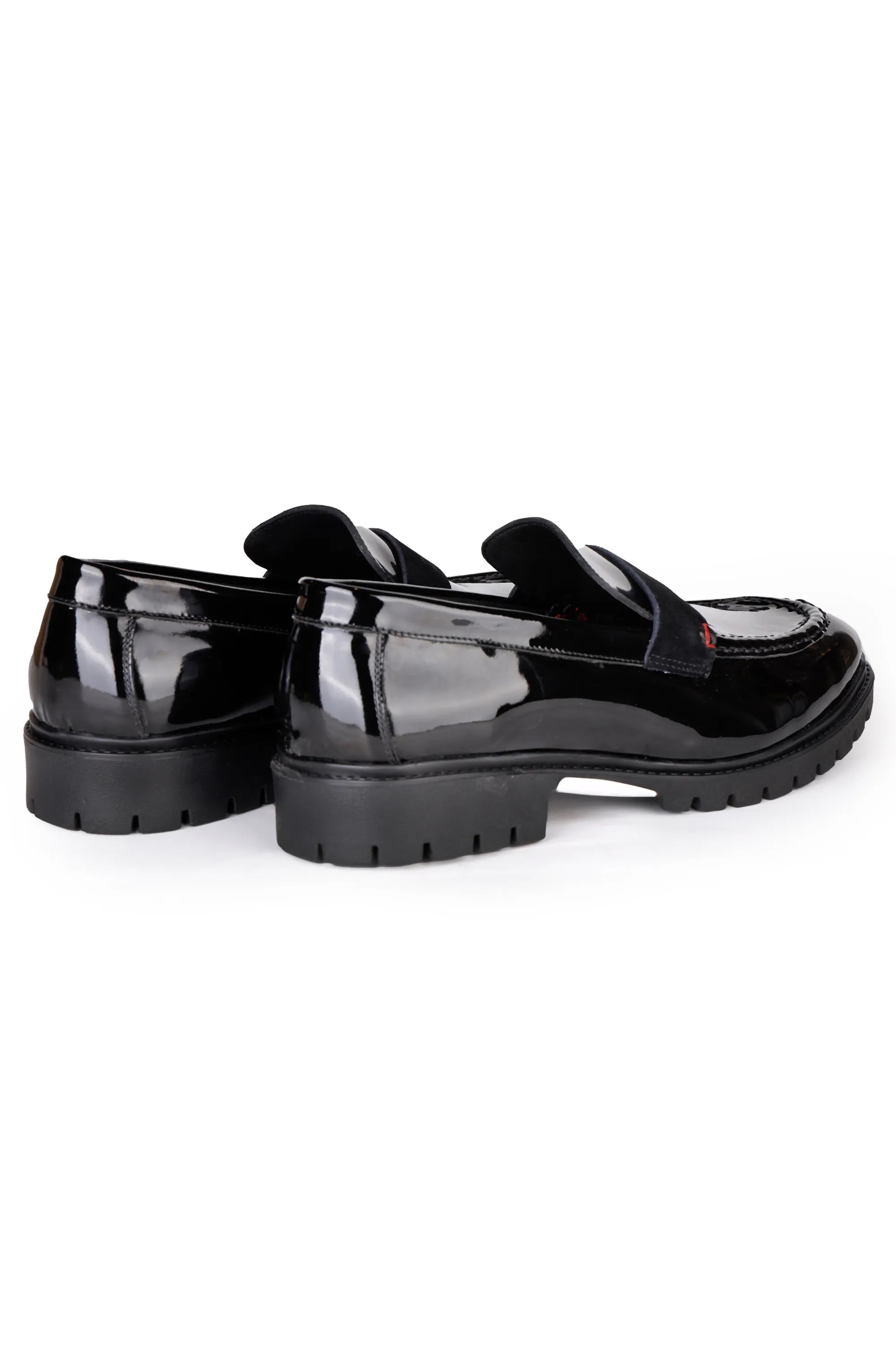 These Black Patent Leather Loafers combine a high-gloss premium finish with a soft black velvet strap for a modern, luxurious look. The contrast red stitching adds a stylish touch, while the rugged sole provides durability and all-day comfort. Perfect for parties, formal wear, and premium fashion styling, these loafers offer a refined blend of elegance and bold design.