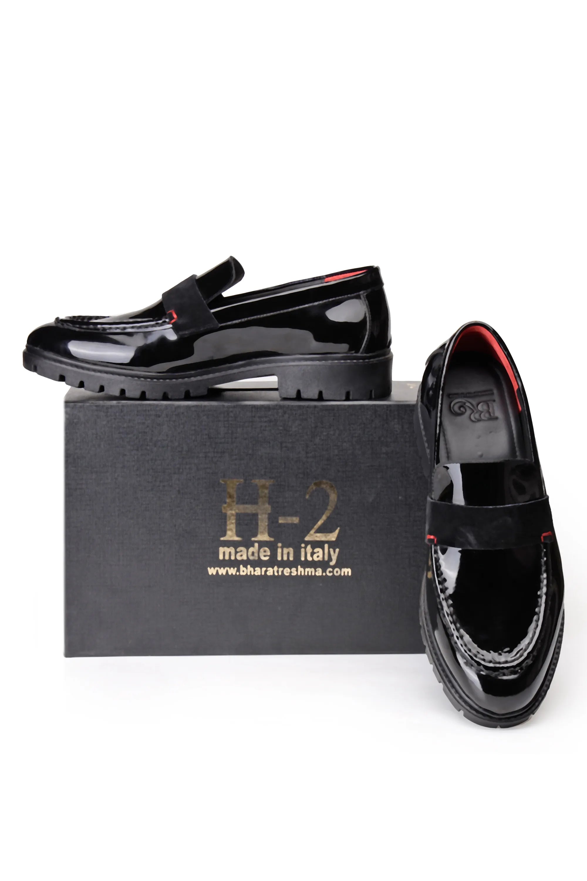 Black Patent Leather Loafers with Velvet Strap Detailing