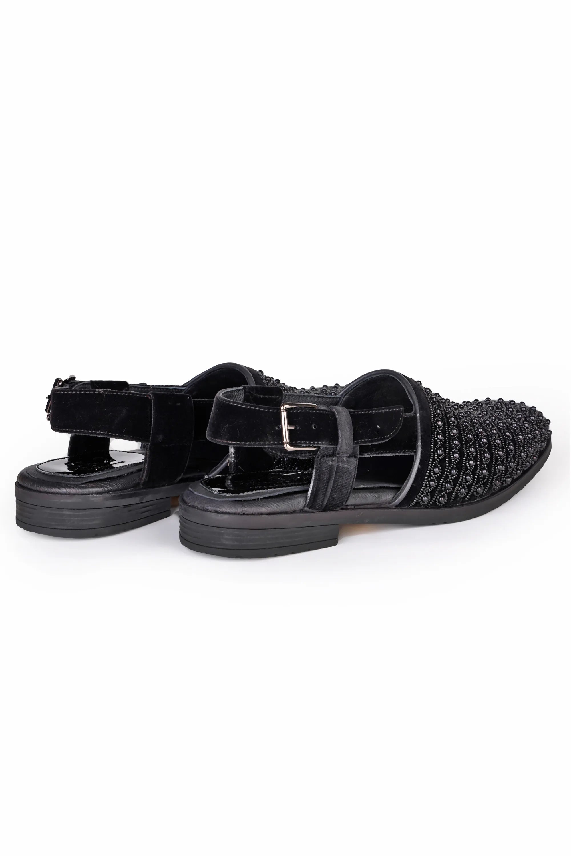 Black Velvet Low-Heel Sandals with Moti & Pearl Hand Embroidery