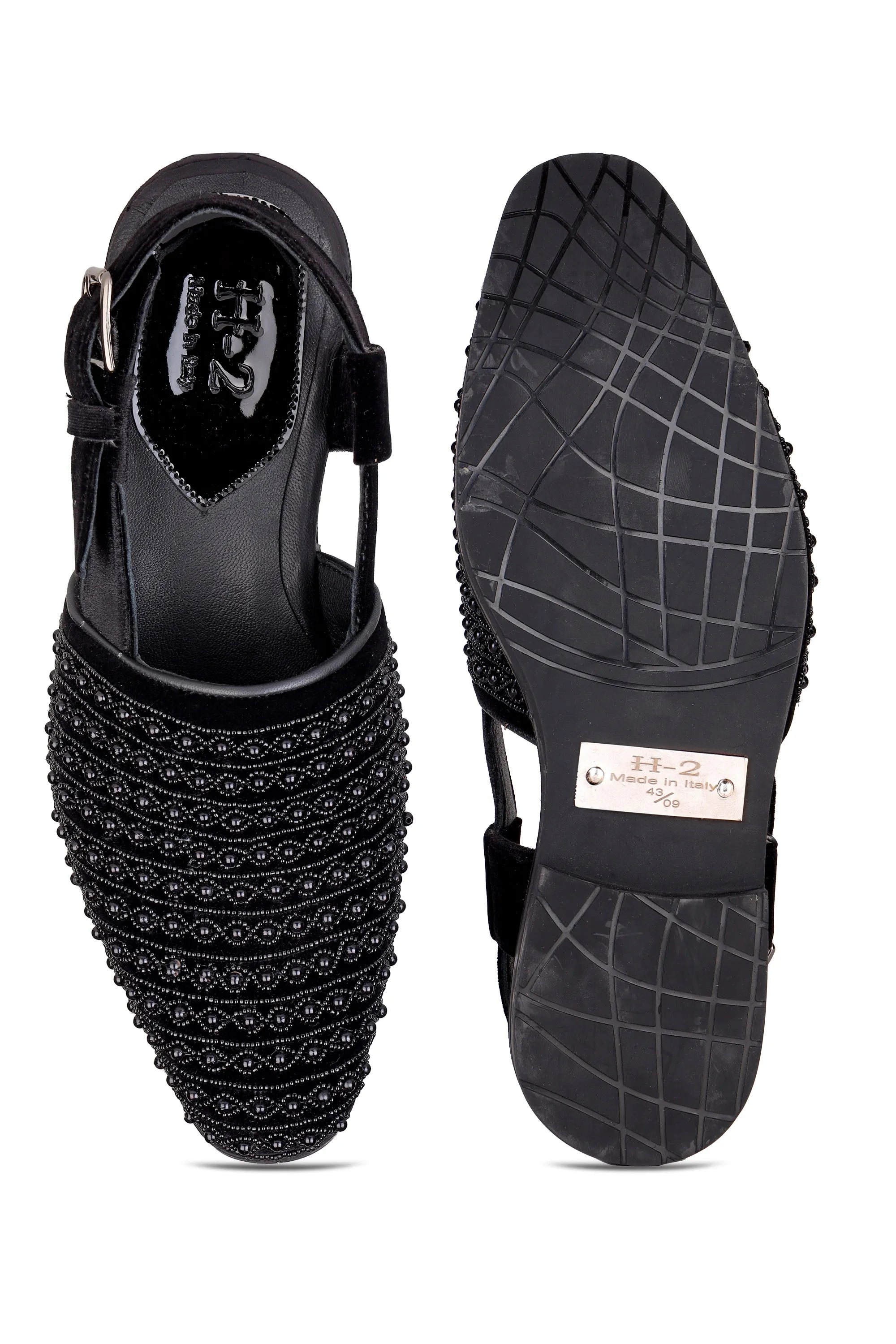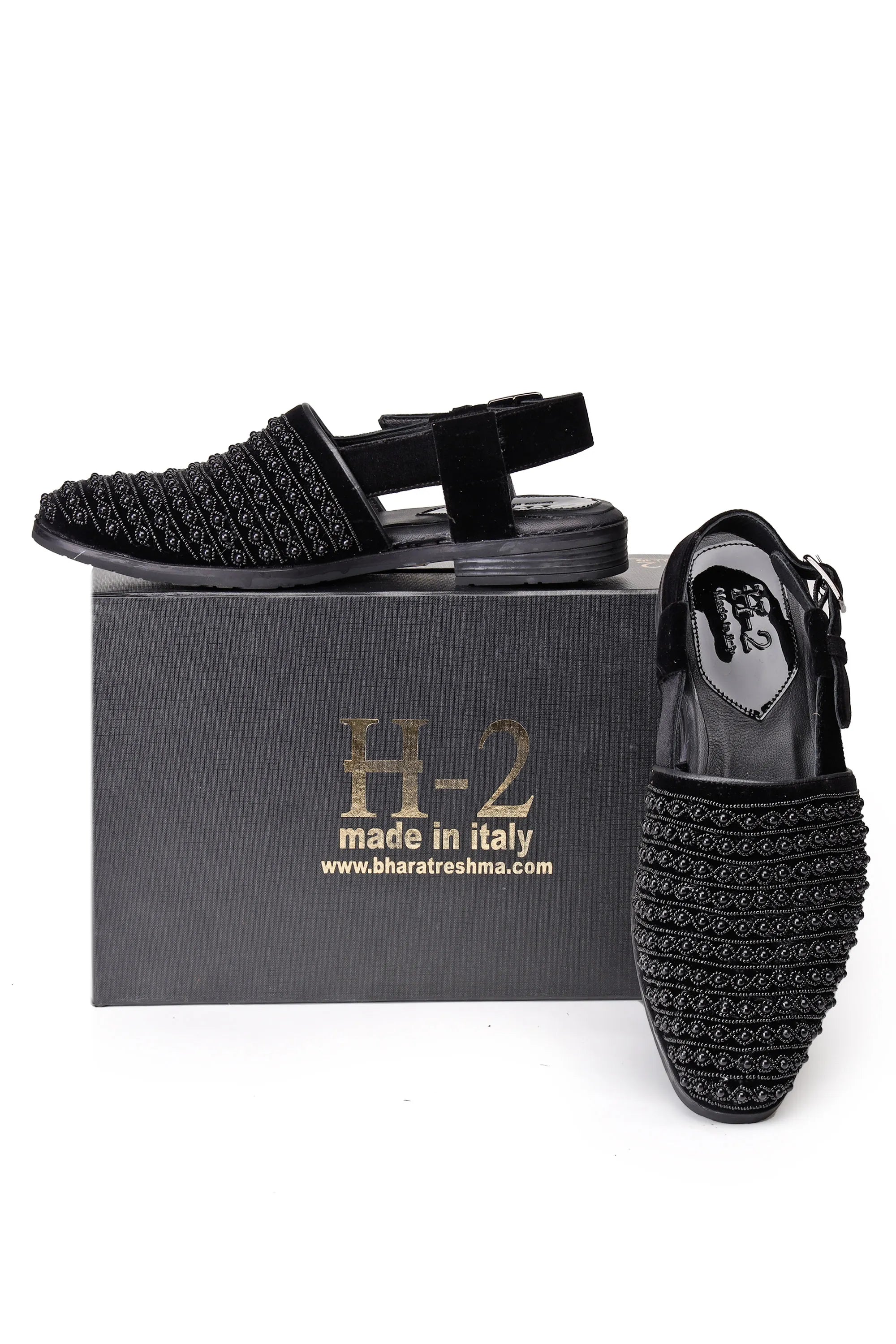 These elegant black velvet low-heel sandals feature intricate moti and pearl hand embroidery, adding a premium traditional touch. The soft velvet texture, detailed pattern work, and supportive back strap make them perfect for weddings, festive events, and ethnic outfits. Comfortable, stylish, and beautifully crafted for any special occasion.