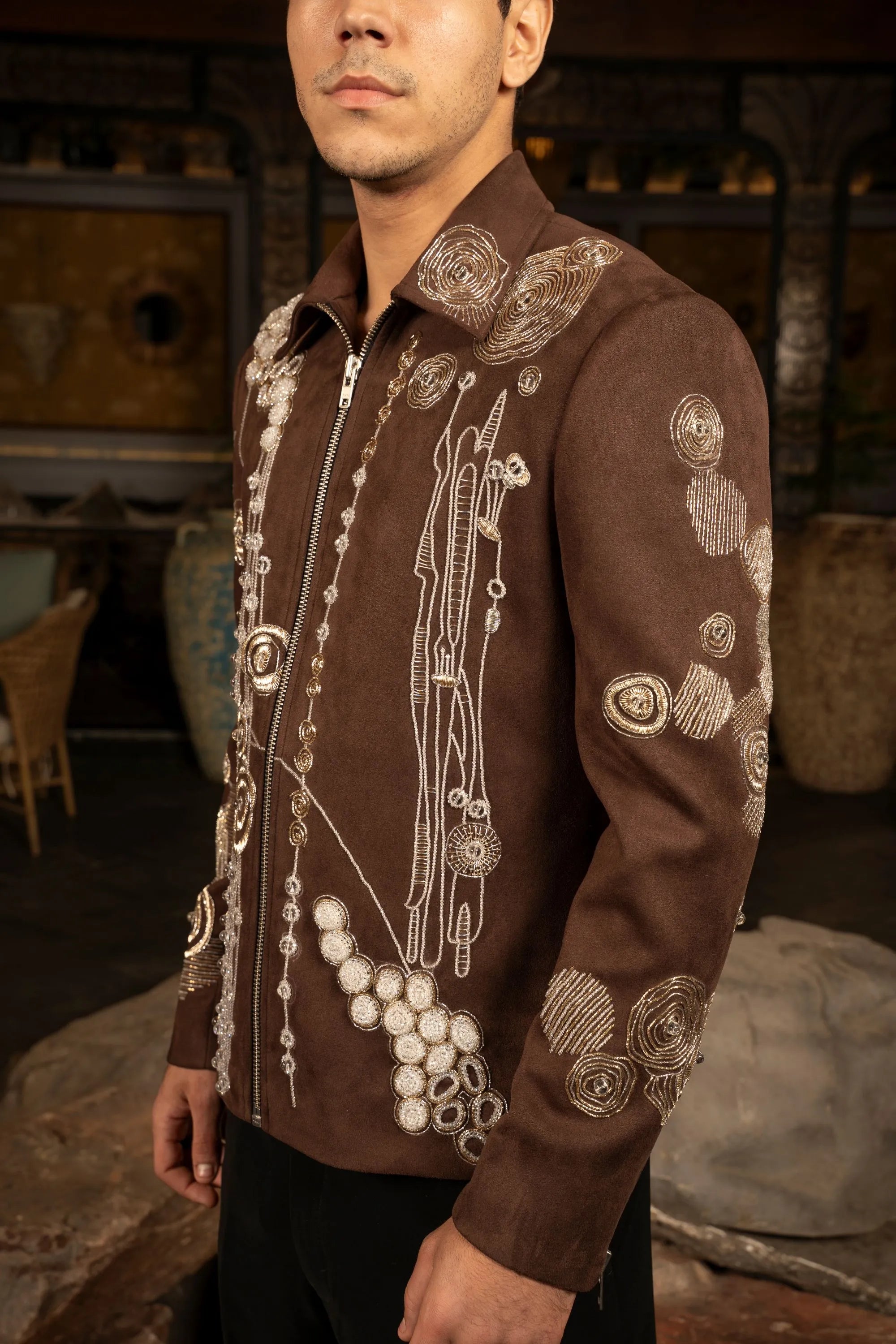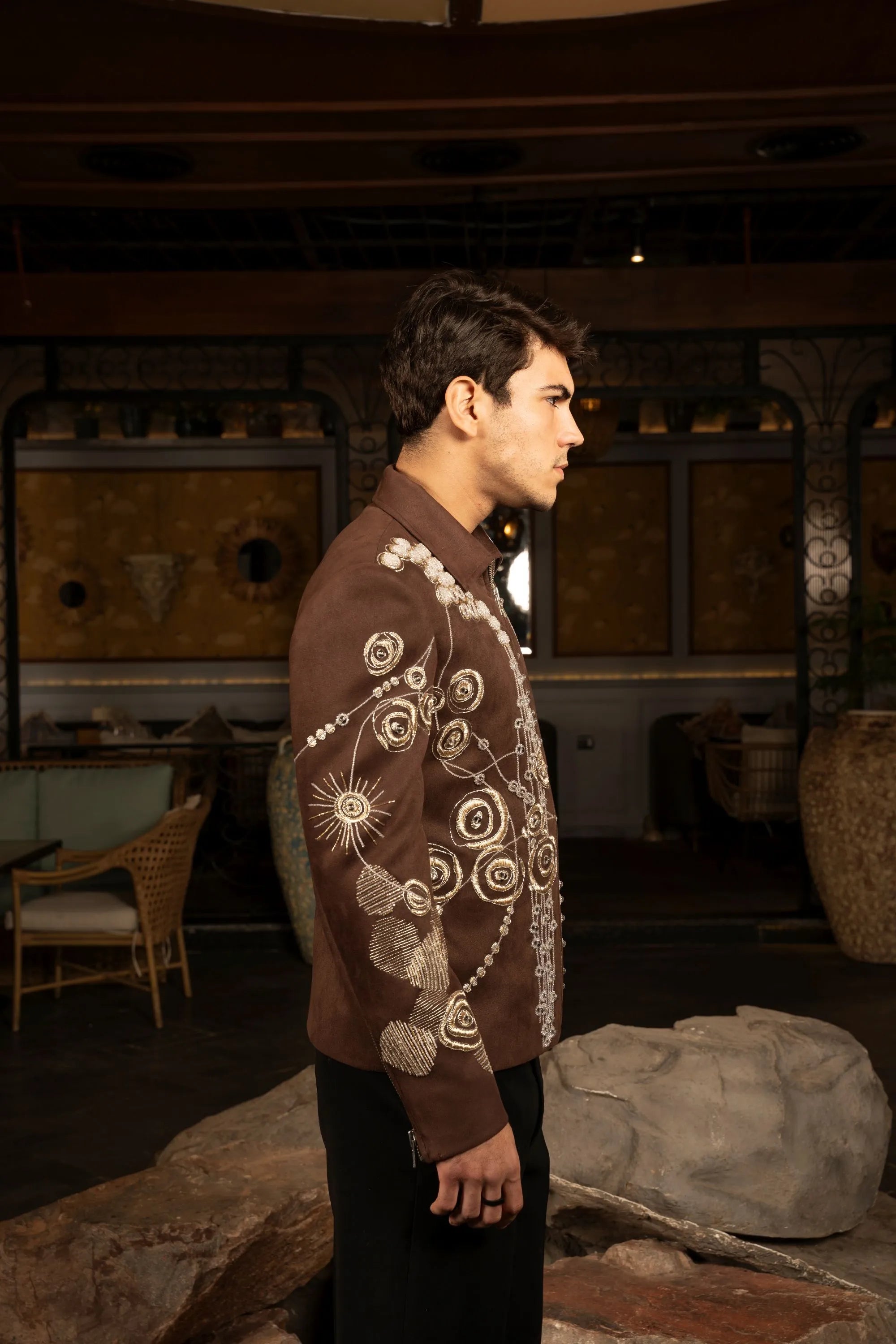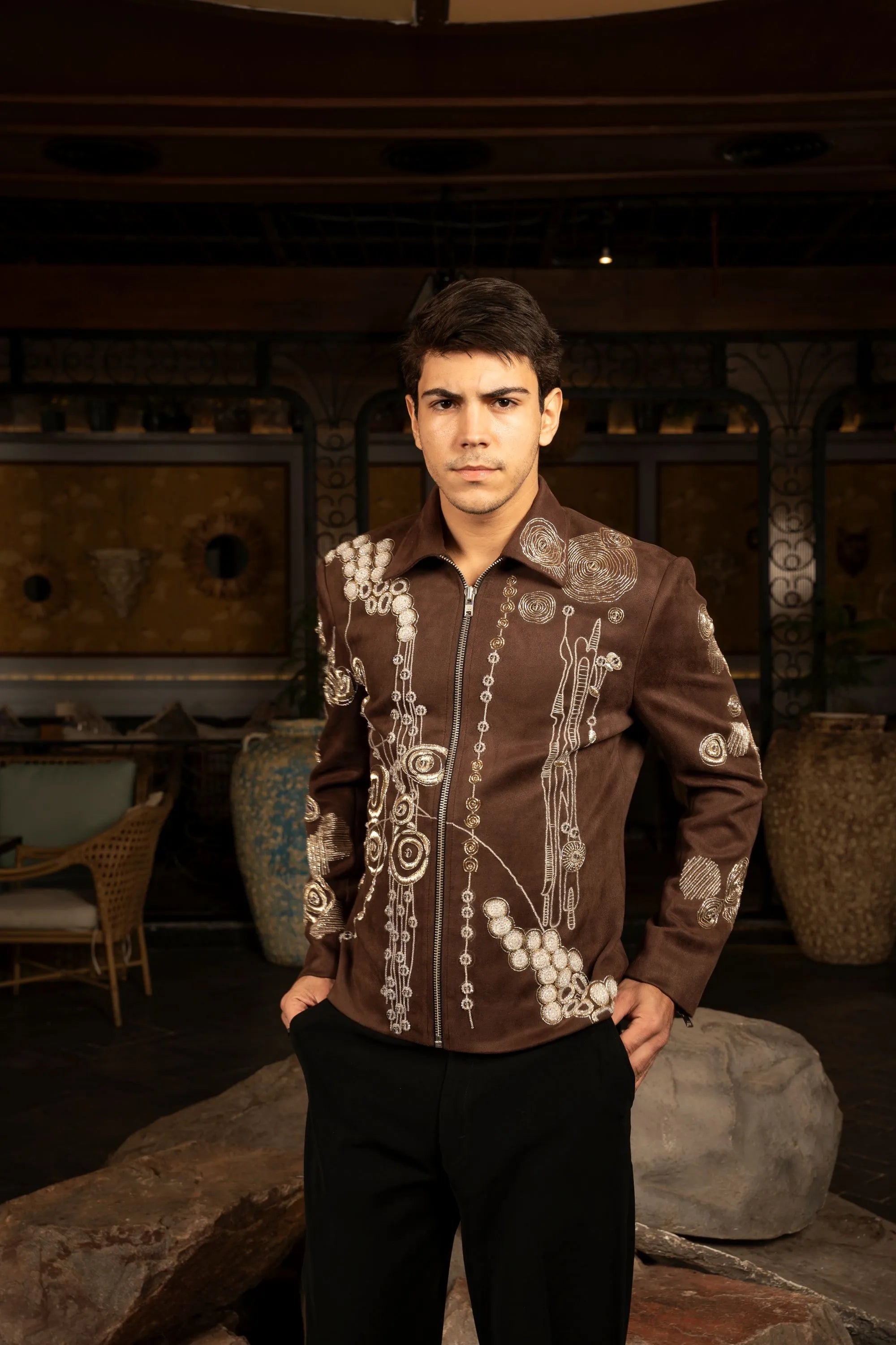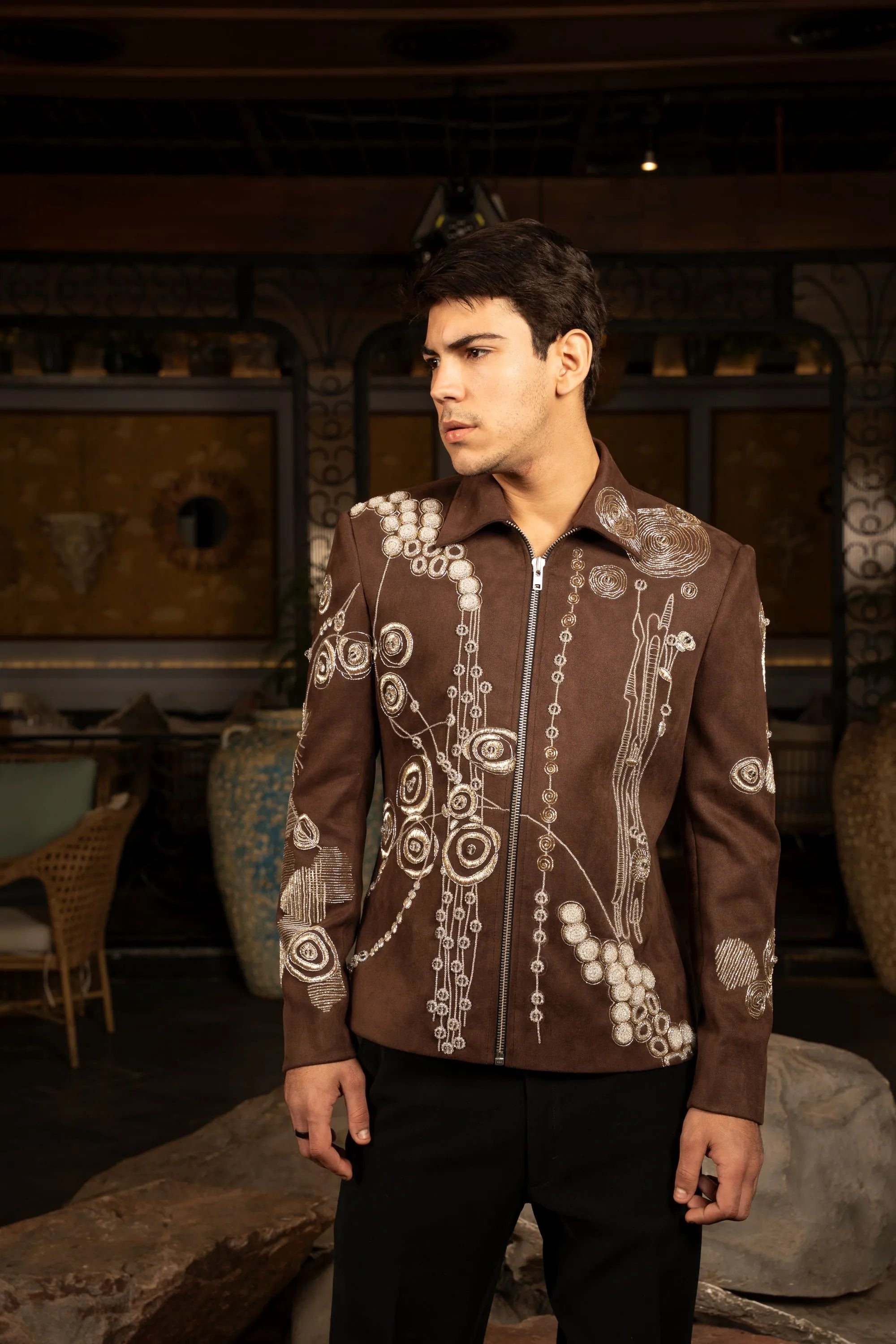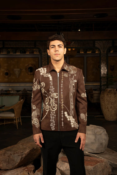 Light Magna fabric jacket in brown, featuring grey abstract hand embroidery for a refined yet contemporary statement.