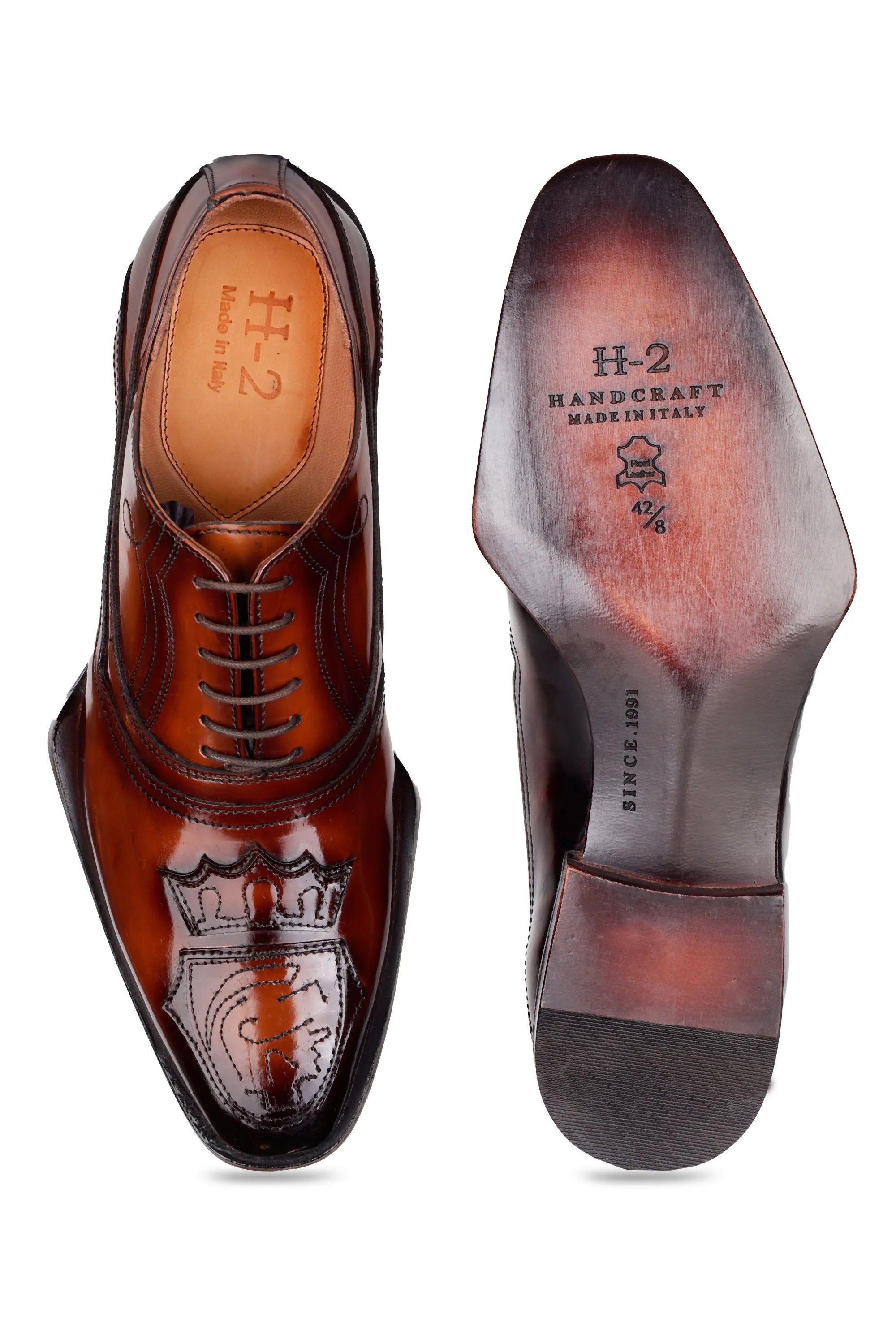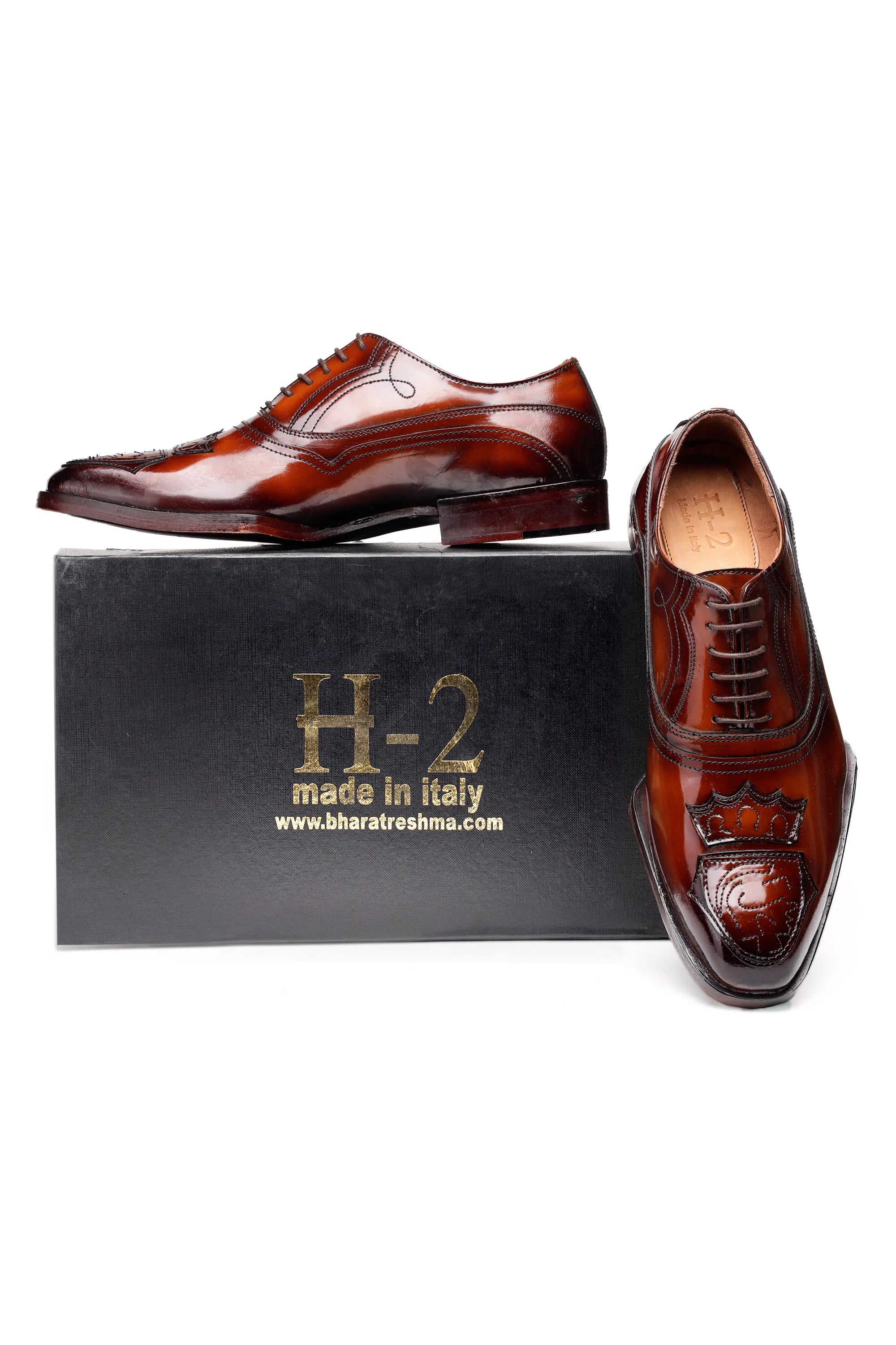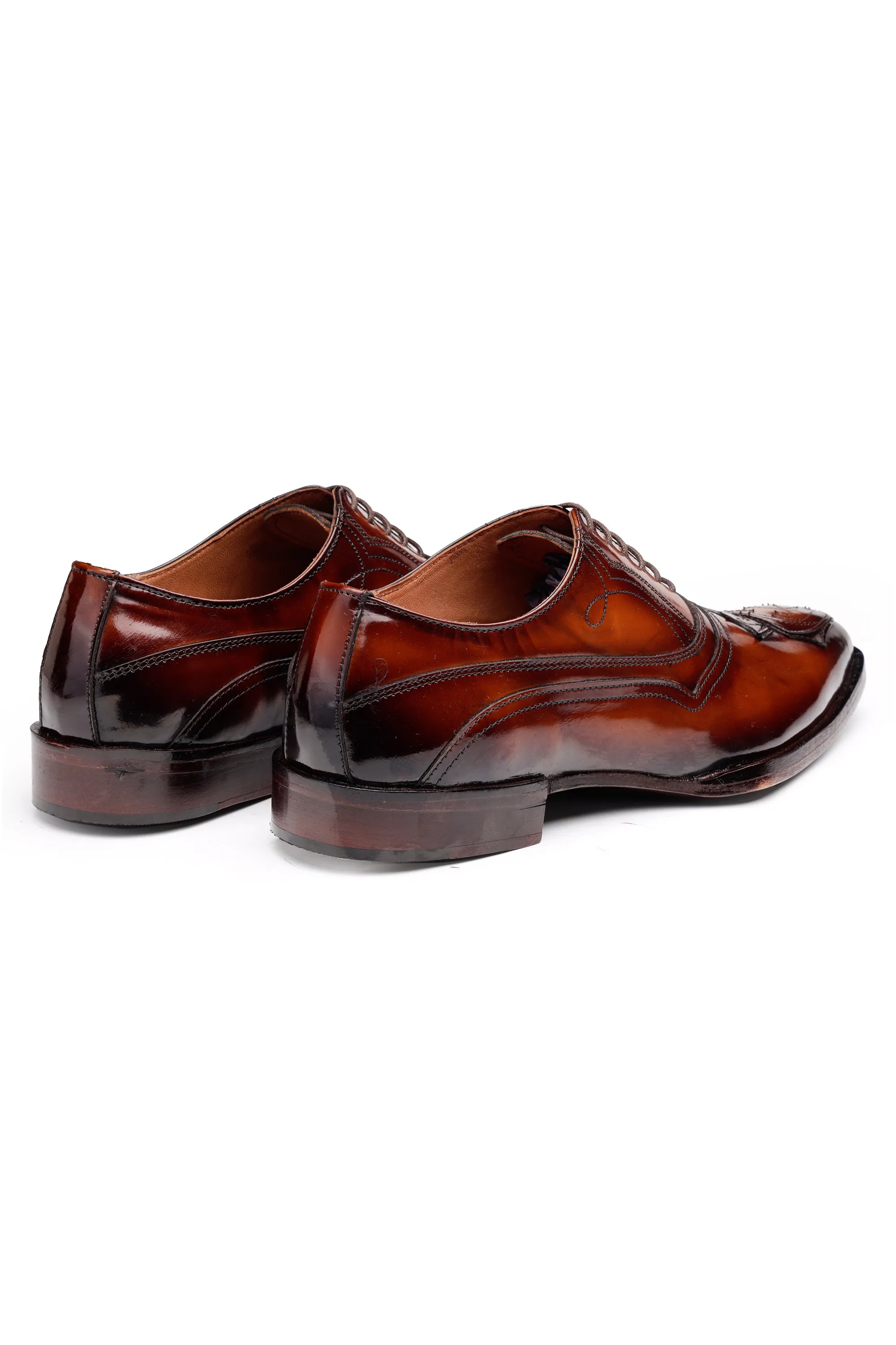 Italian handcrafted brown leather oxford shoes with luxury crest patch work and wooden finish sole. Premium shine, hand-stitched detailing — perfect for weddings and elite formal styling.
