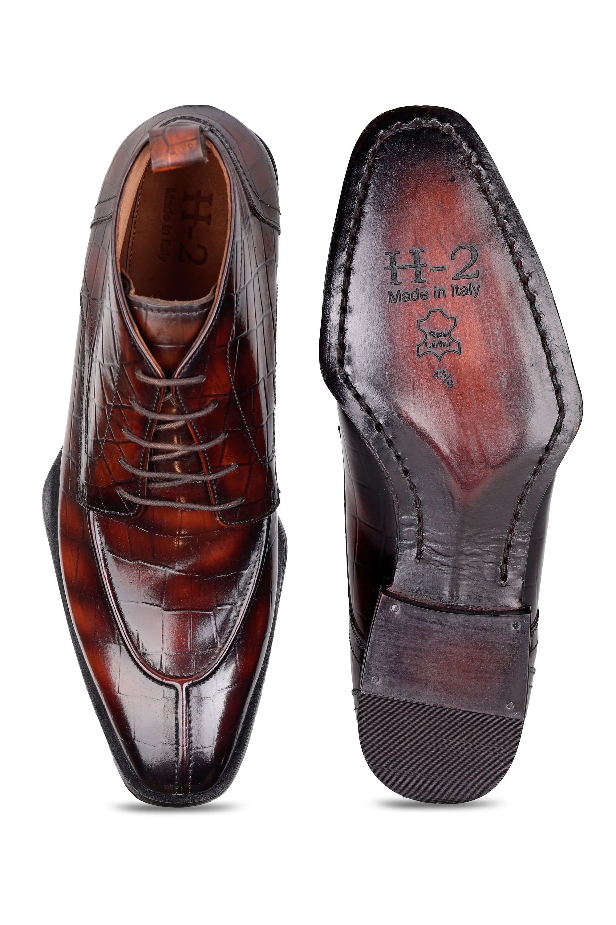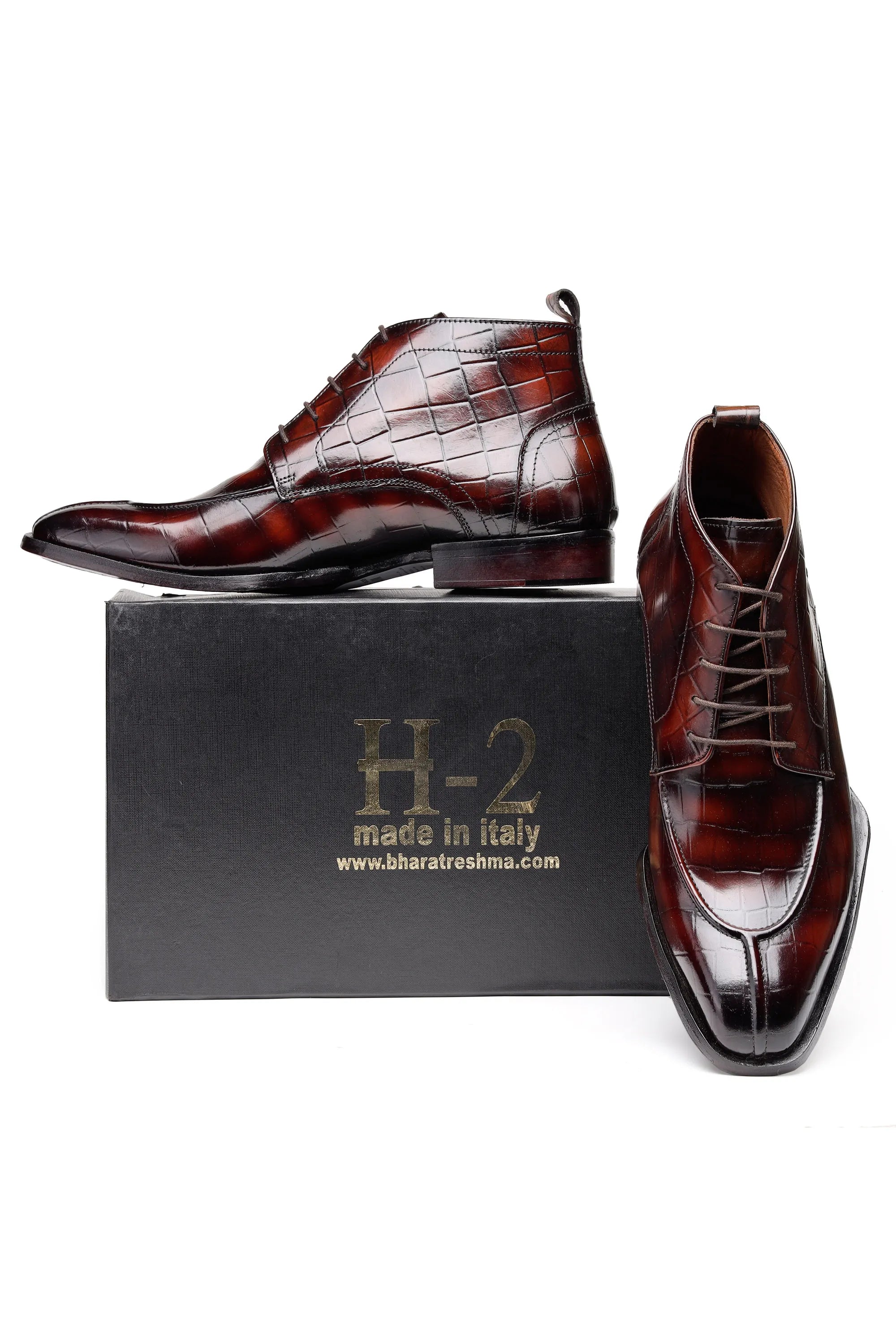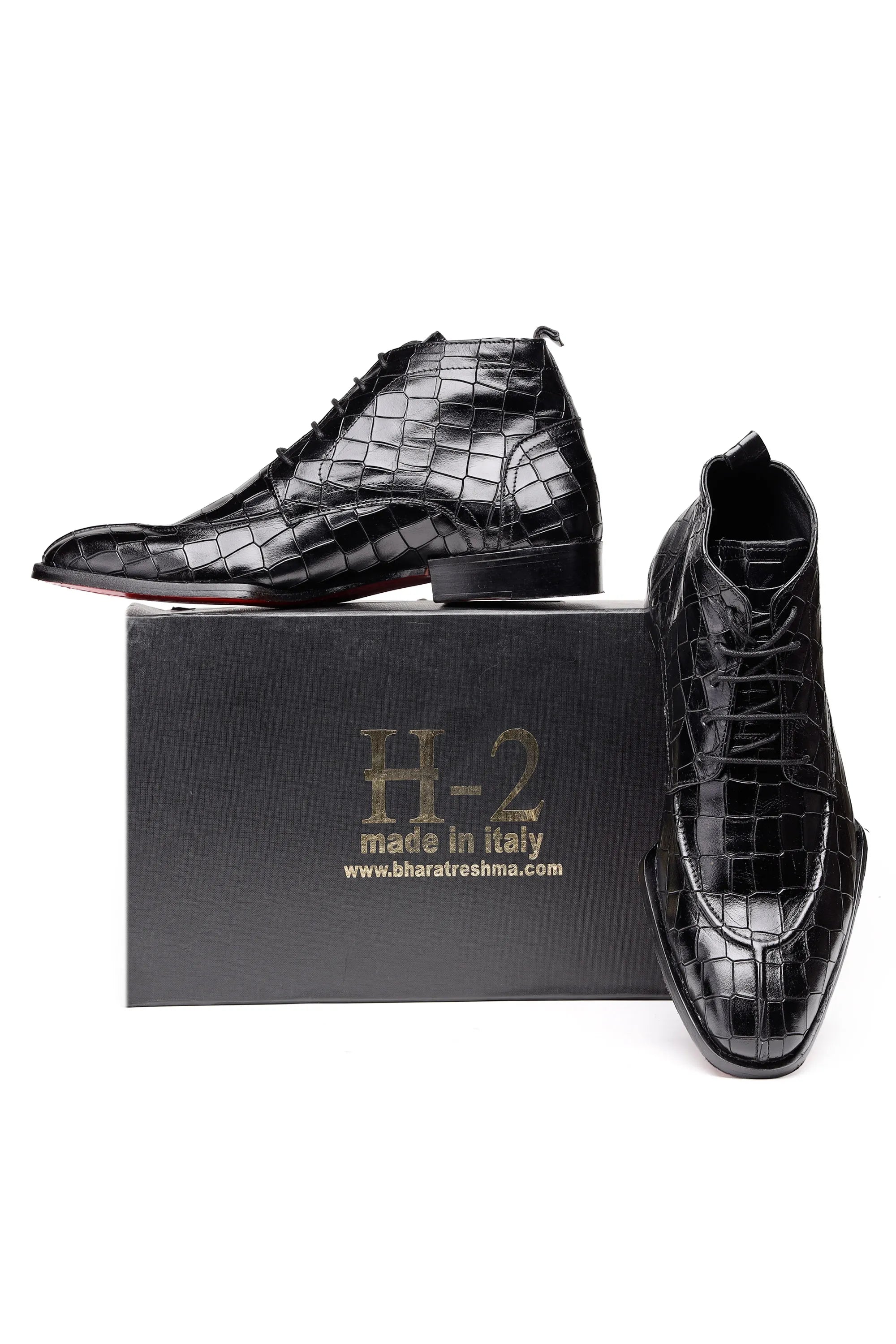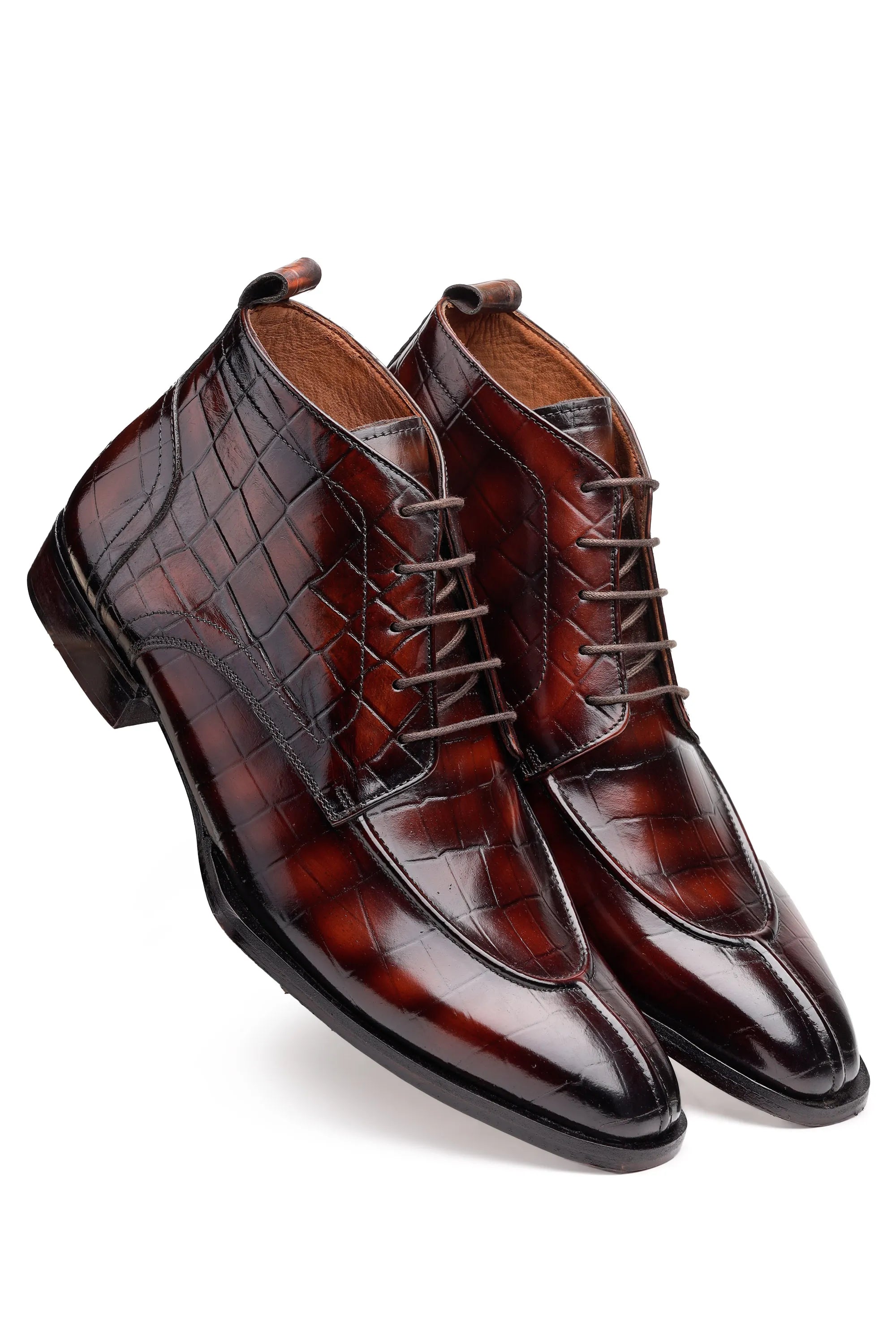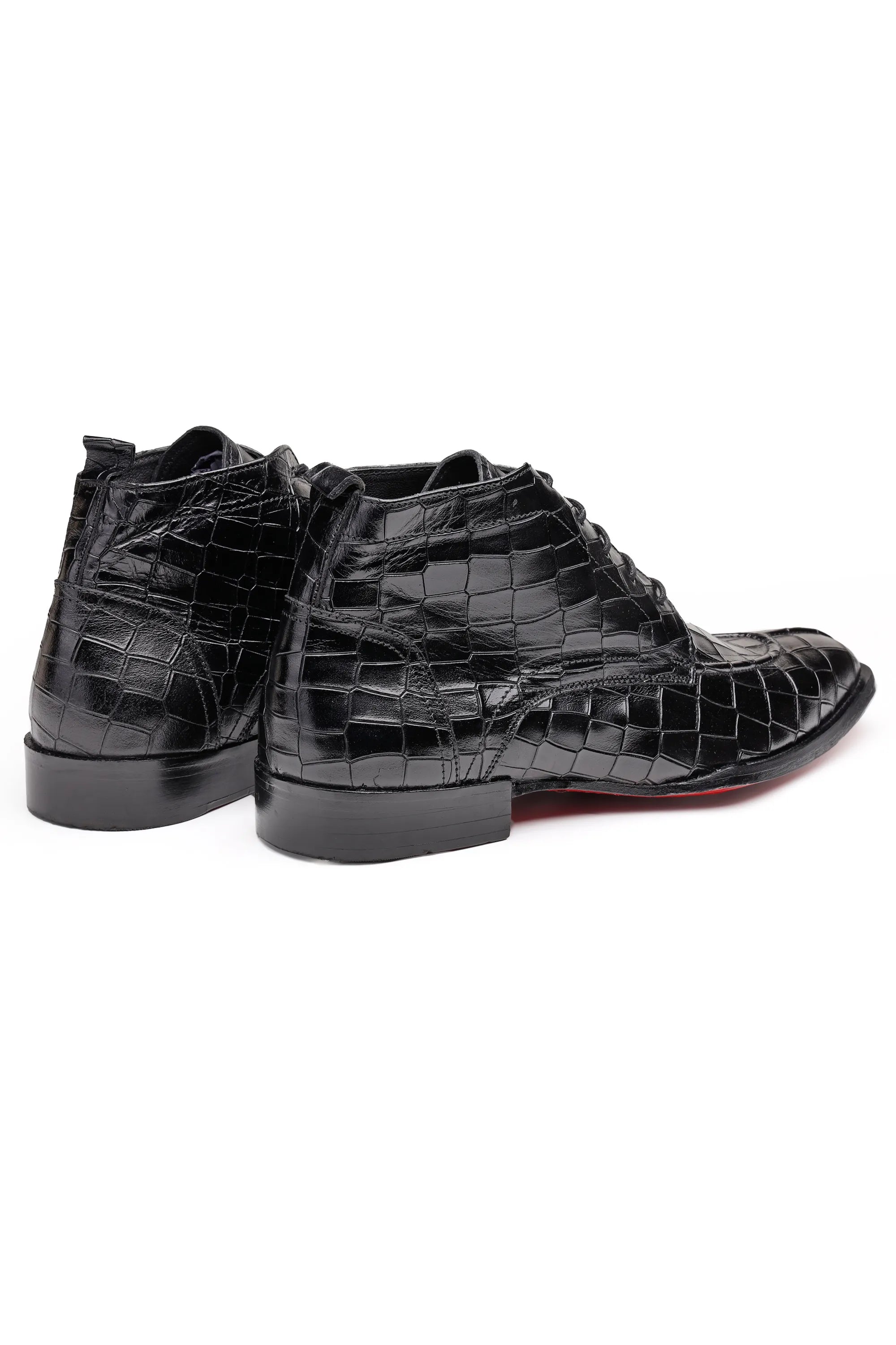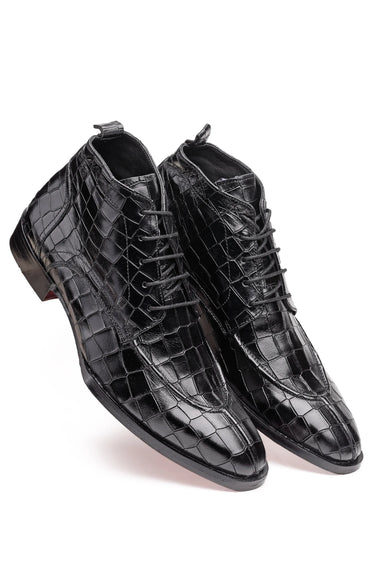 Upgrade your formal footwear collection with these men’s croc-pattern leather ankle boots, available in black and brown. Crafted from premium embossed leather, the boots feature a sleek lace-up design and ankle-length silhouette that delivers a sharp, structured look.