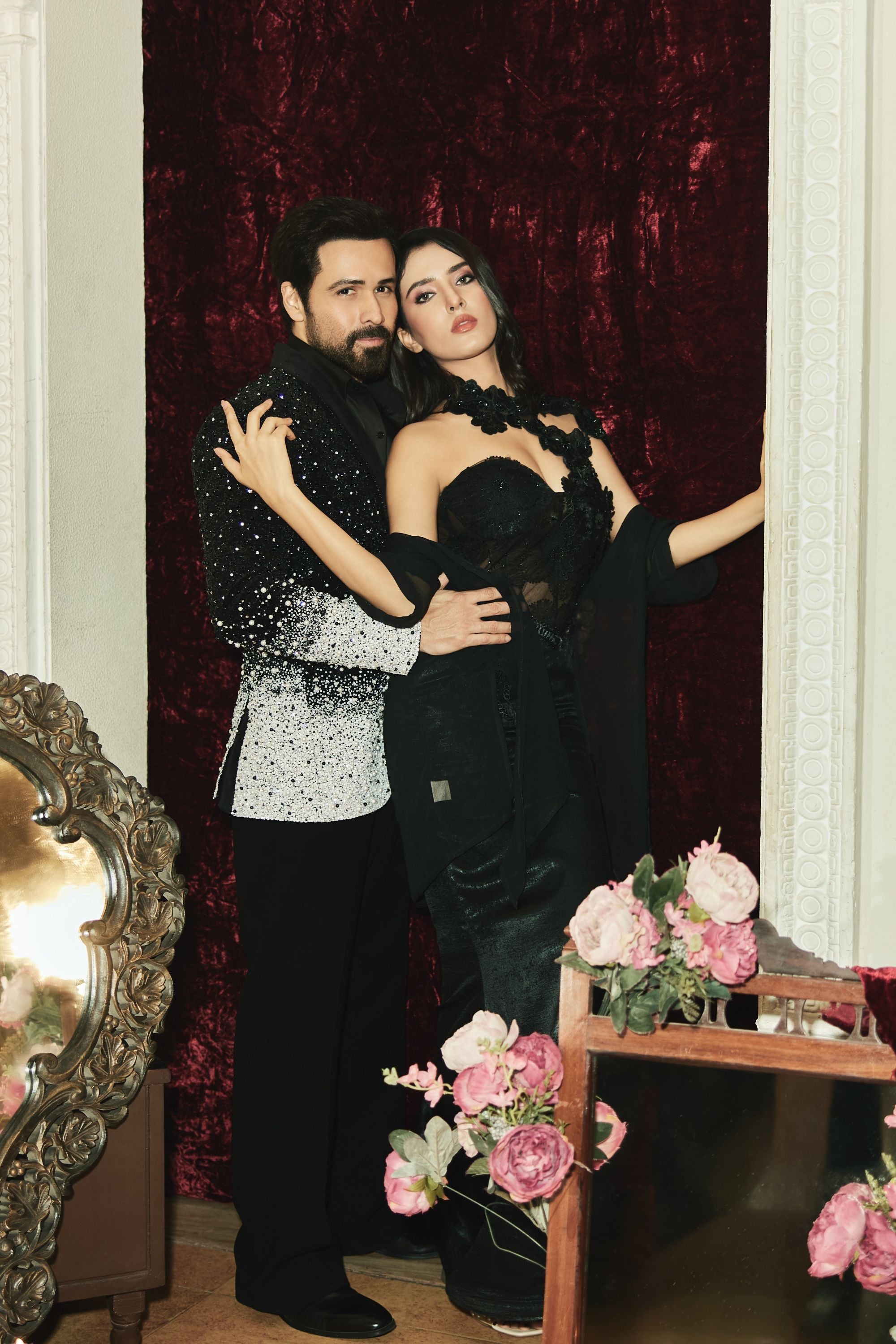 Step into evening elegance with this striking Eclipse Pearl ombré tuxedo, inspired by Emraan Hashmi’s refined style. The black-to-white gradient is elevated with intricate hand embroidery and scattered pearl detailing, creating a sophisticated modern edge. Paired with classic black trousers, this statement tuxedo is perfect for receptions, galas, and high-fashion celebrations where bold luxury meets timeless charm.