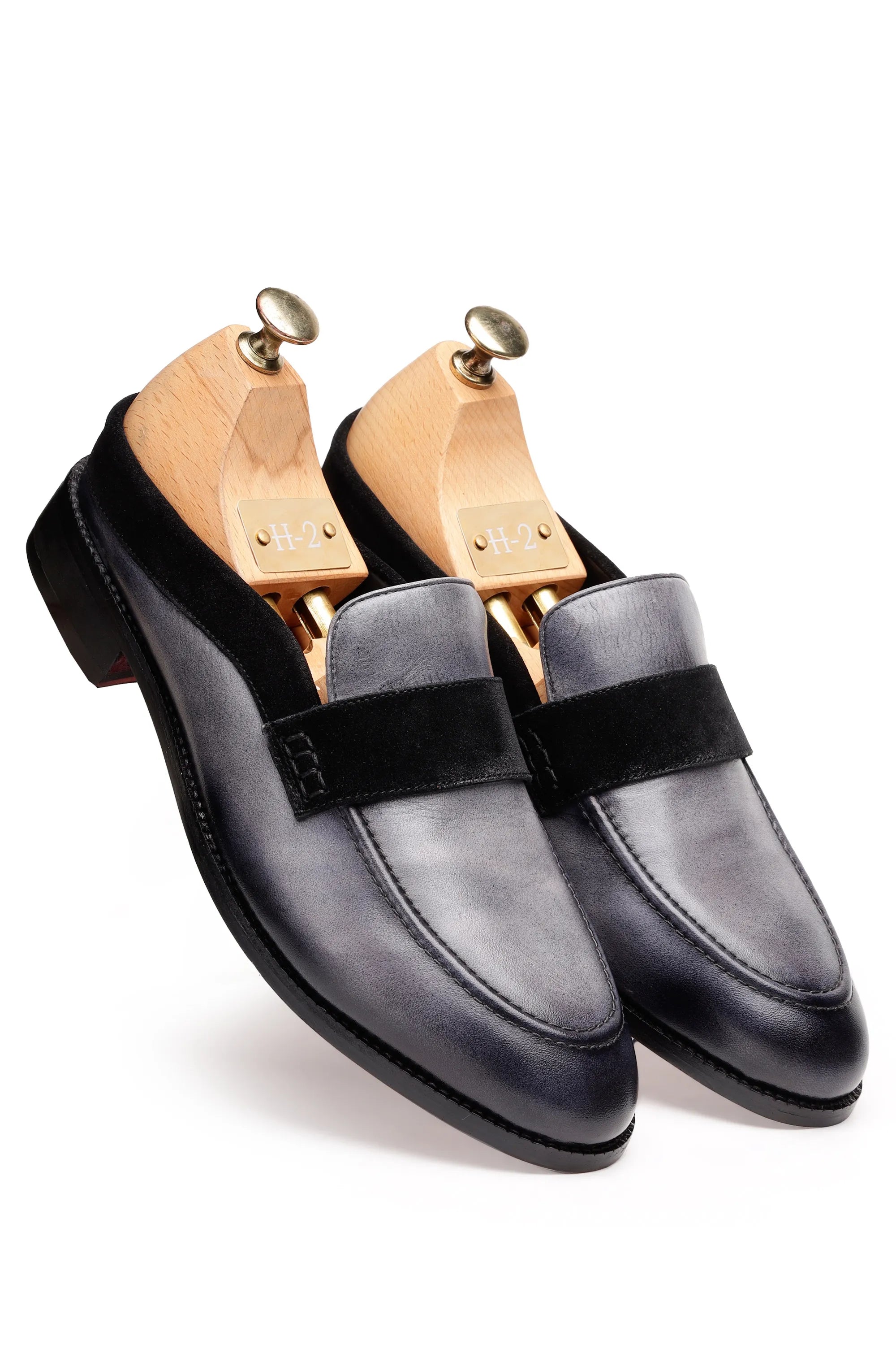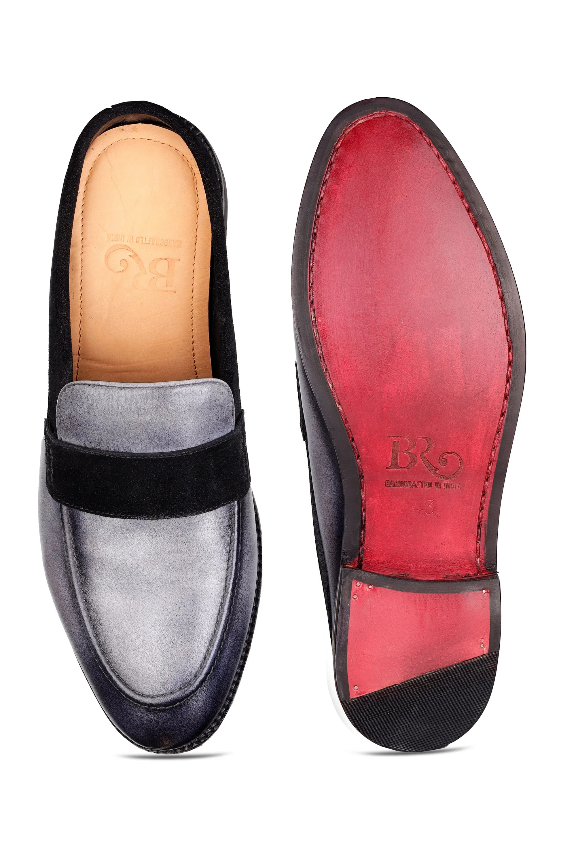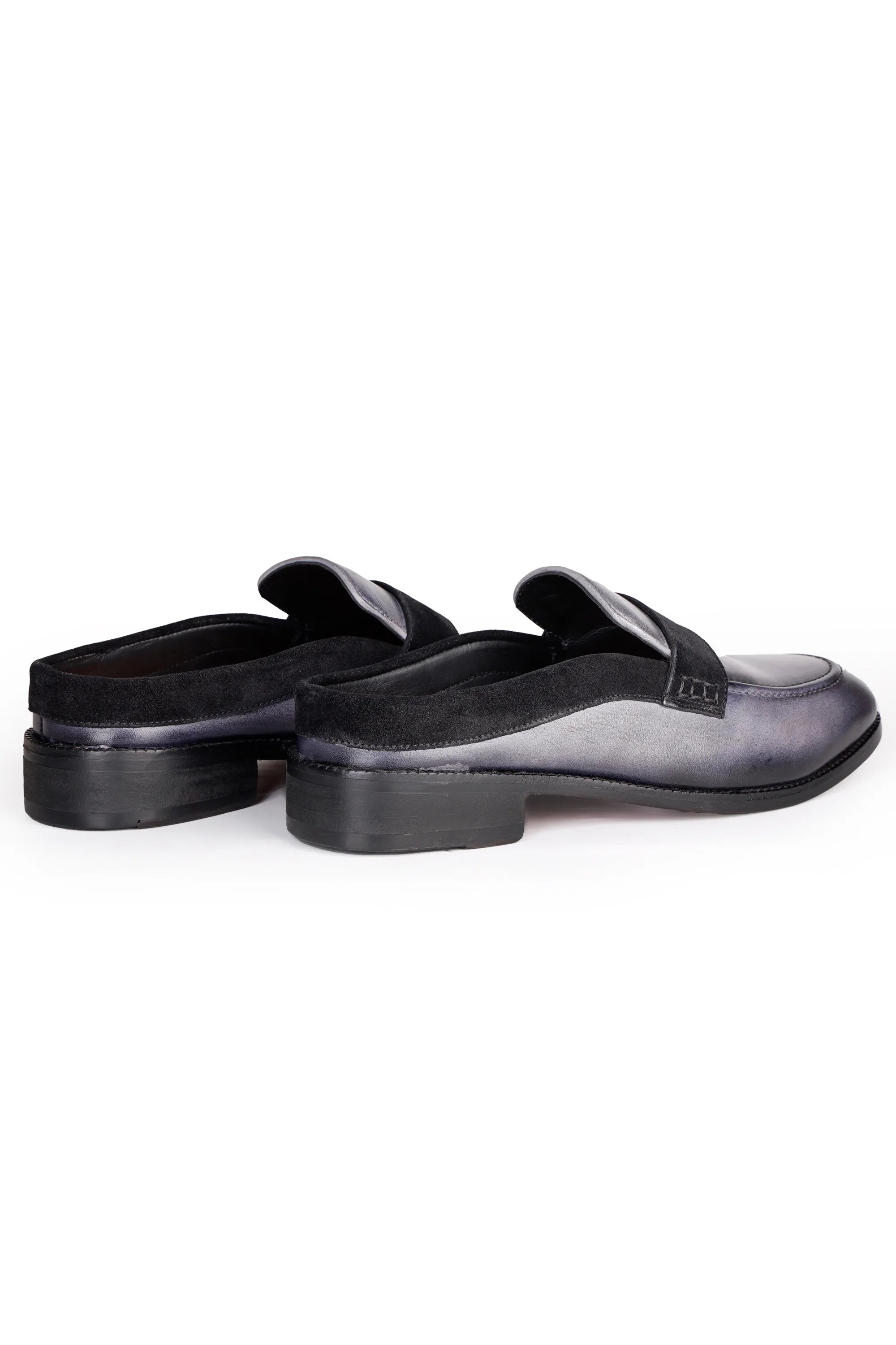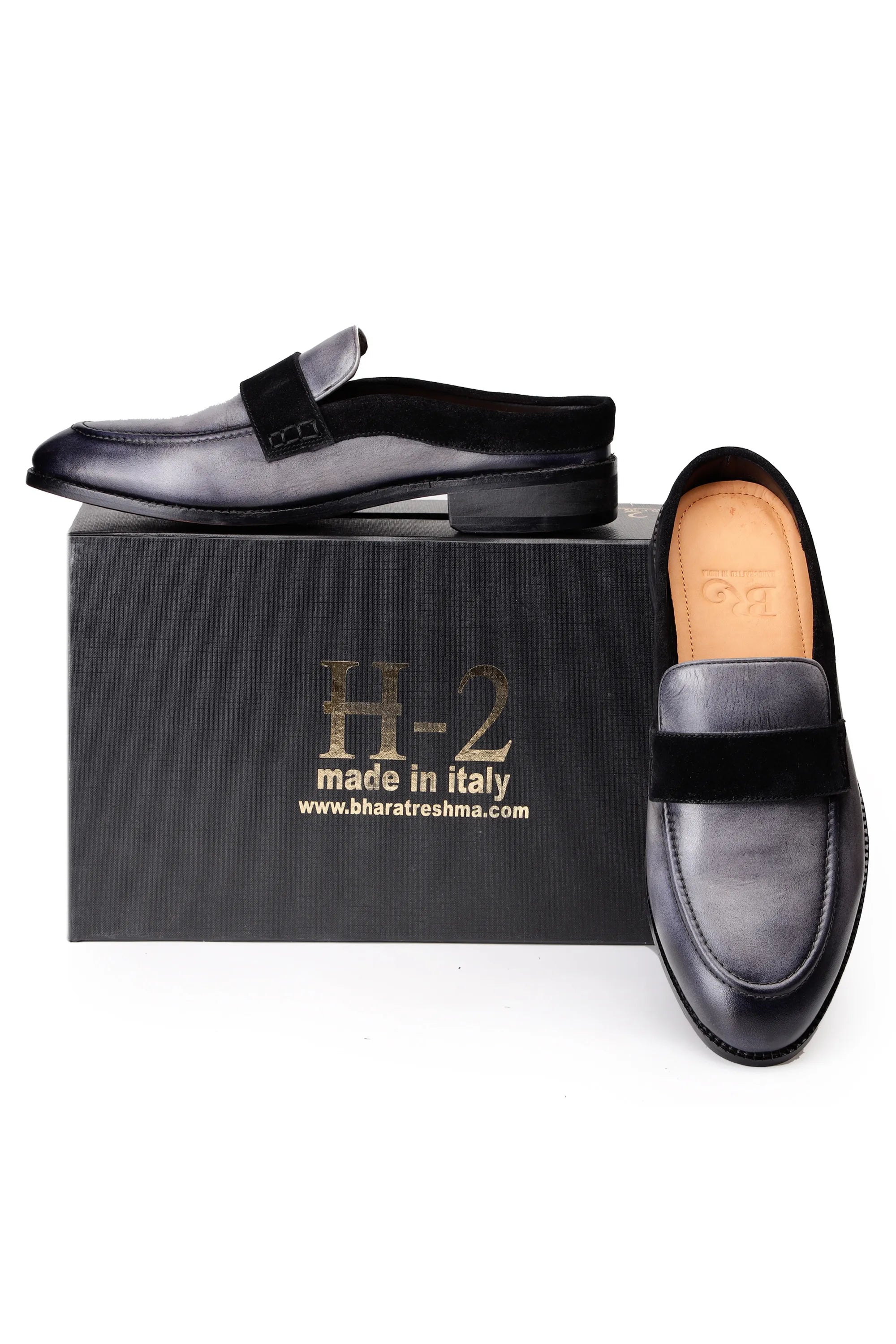 These grey leather Mules feature smooth premium leather paired with a stylish black velvet strap detailing. The sleek design and soft finish make them perfect for both formal and smart-casual looks.