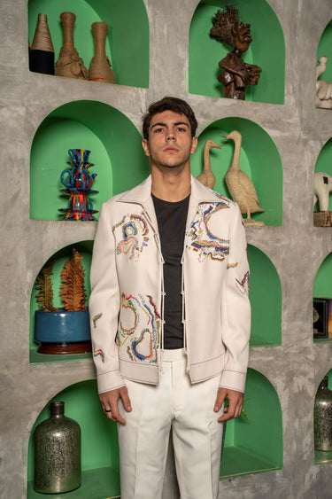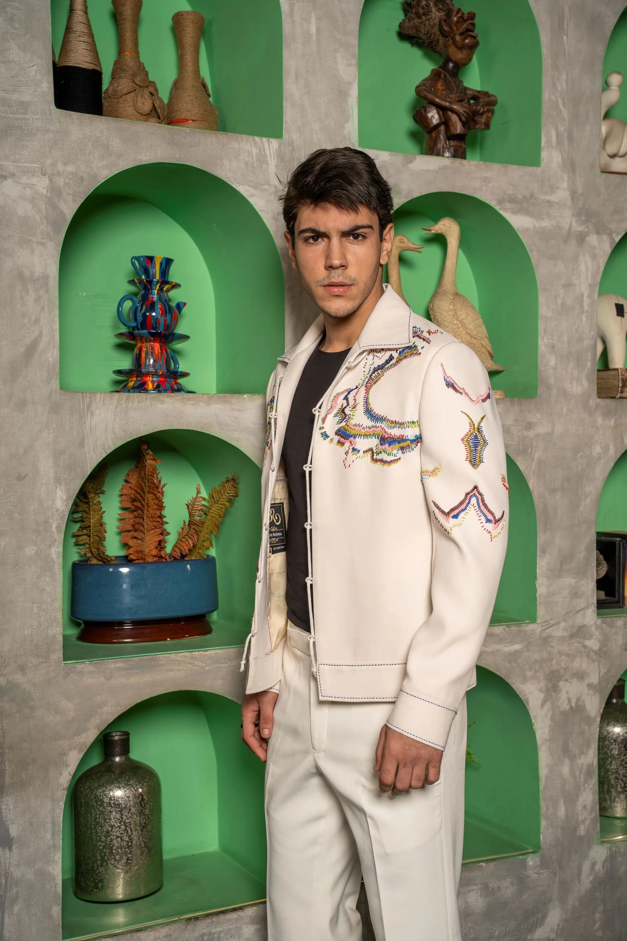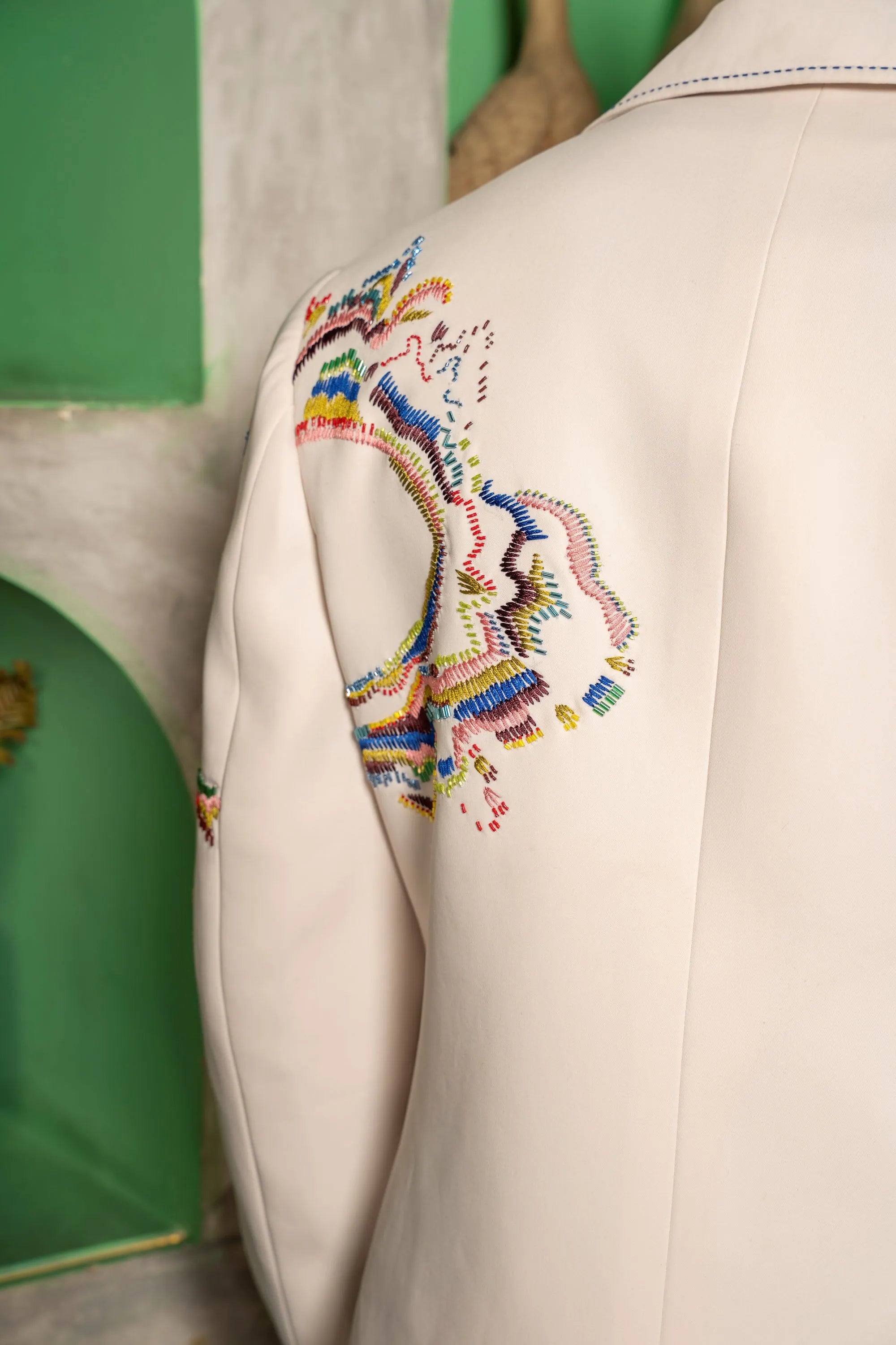 Crafted in light ivory Magna fabric, this front-open jacket features abstract stroke hand embroidery and a coordinated front style for a clean, contemporary look.