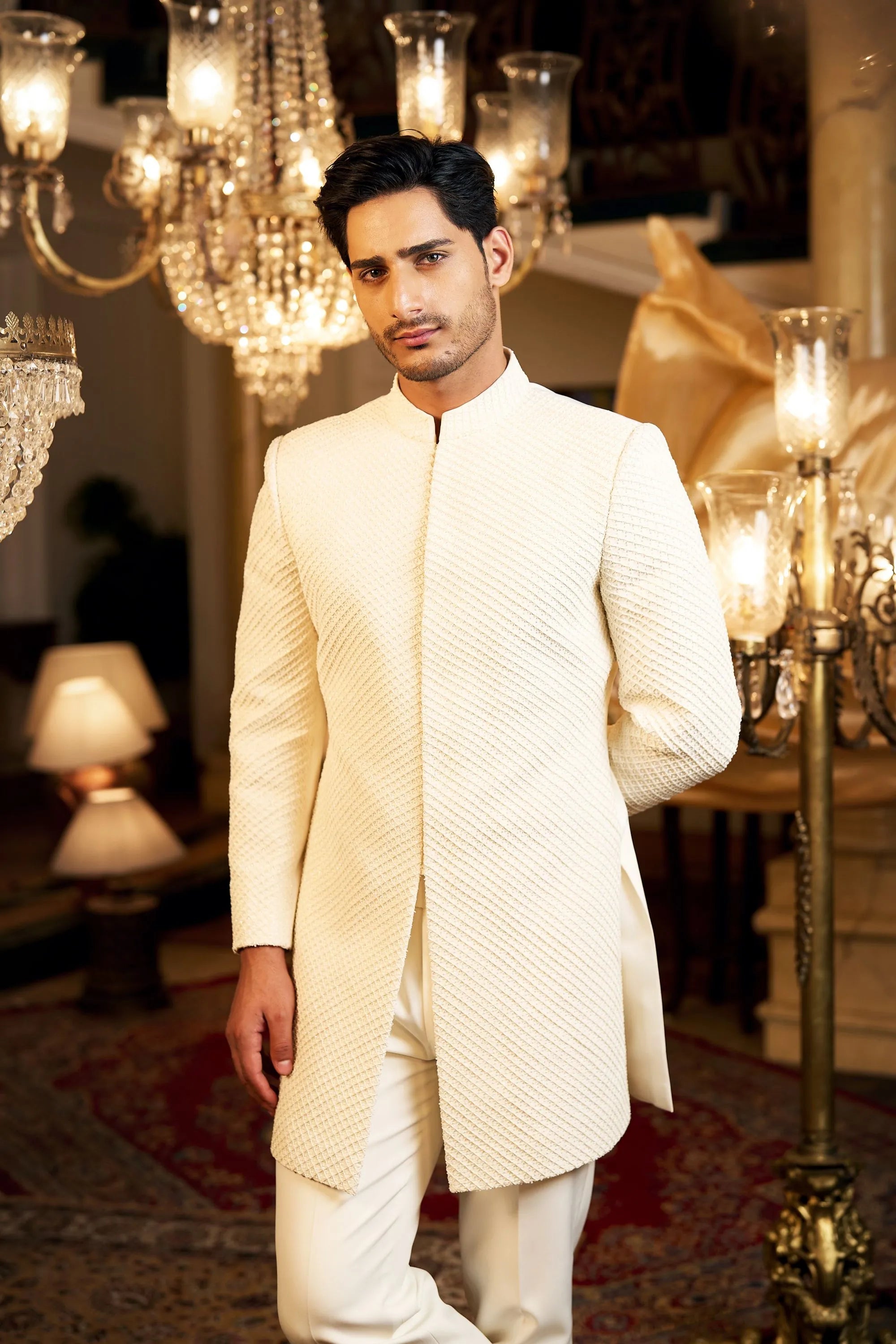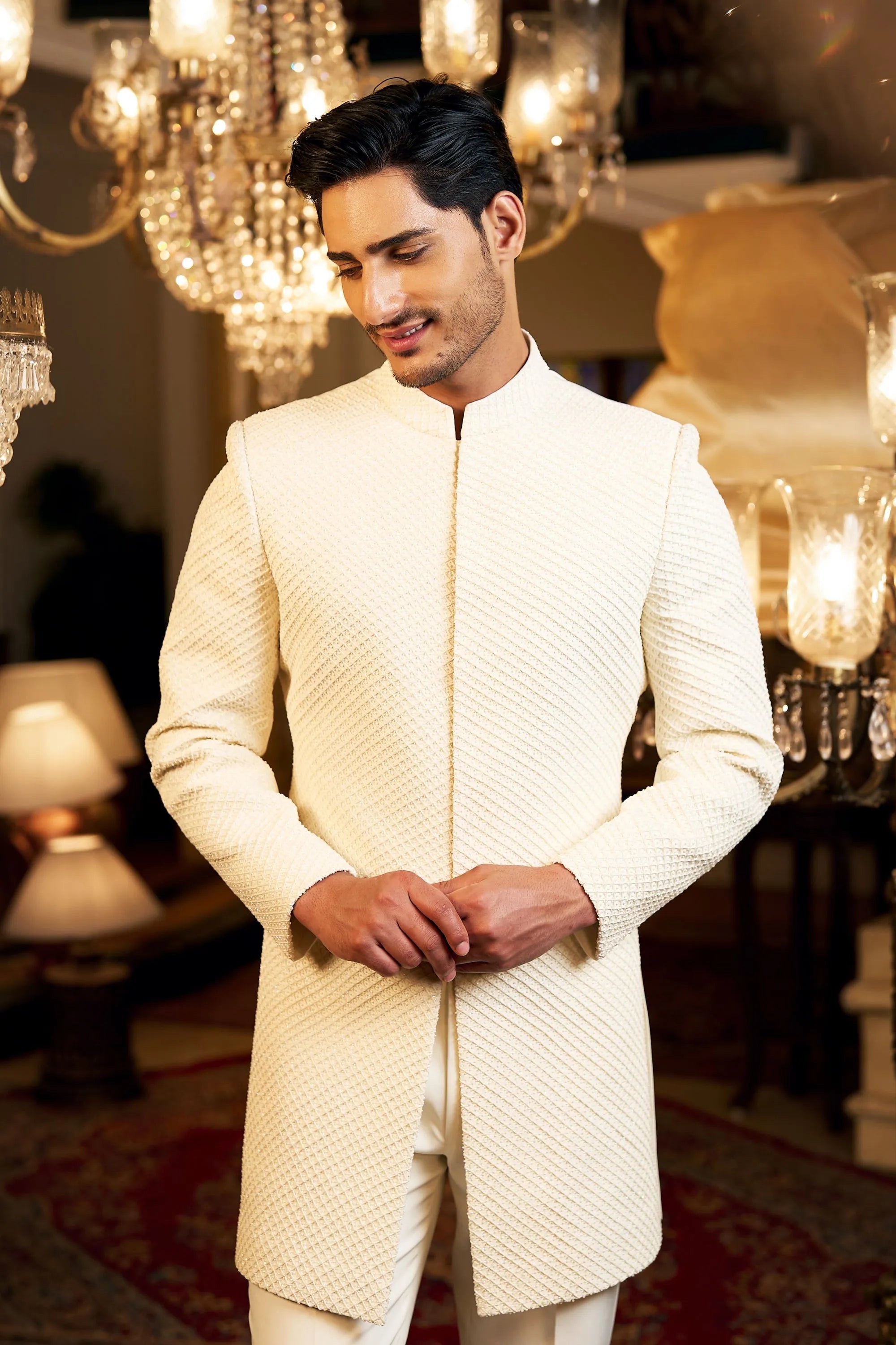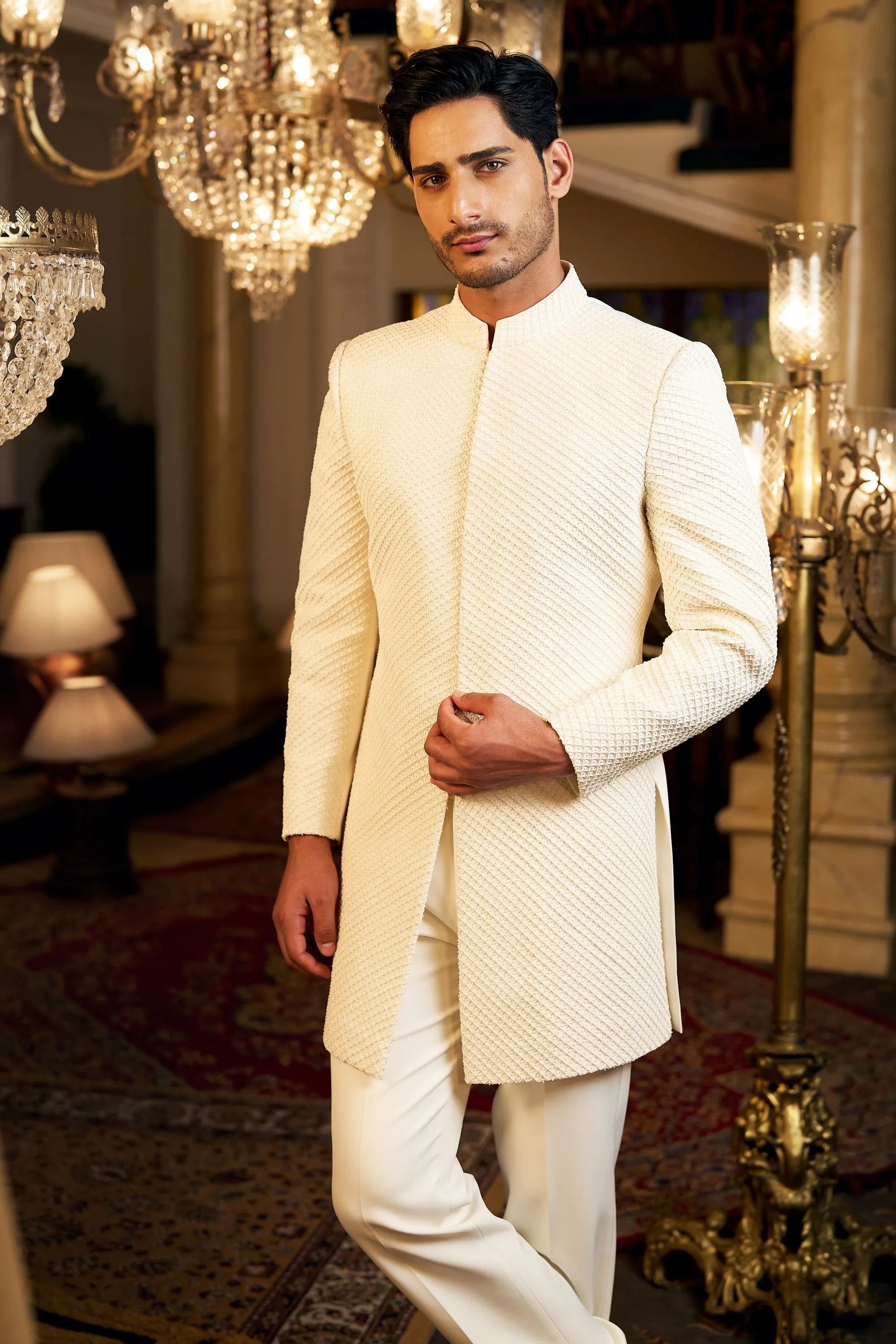 Crafted in a specially created pintuck fabric, this ivory Indo-western features delicate hand embroidery that lends a refined pearl-like finish. Classic yet unique, it brings timeless elegance with a modern artisanal touch.
