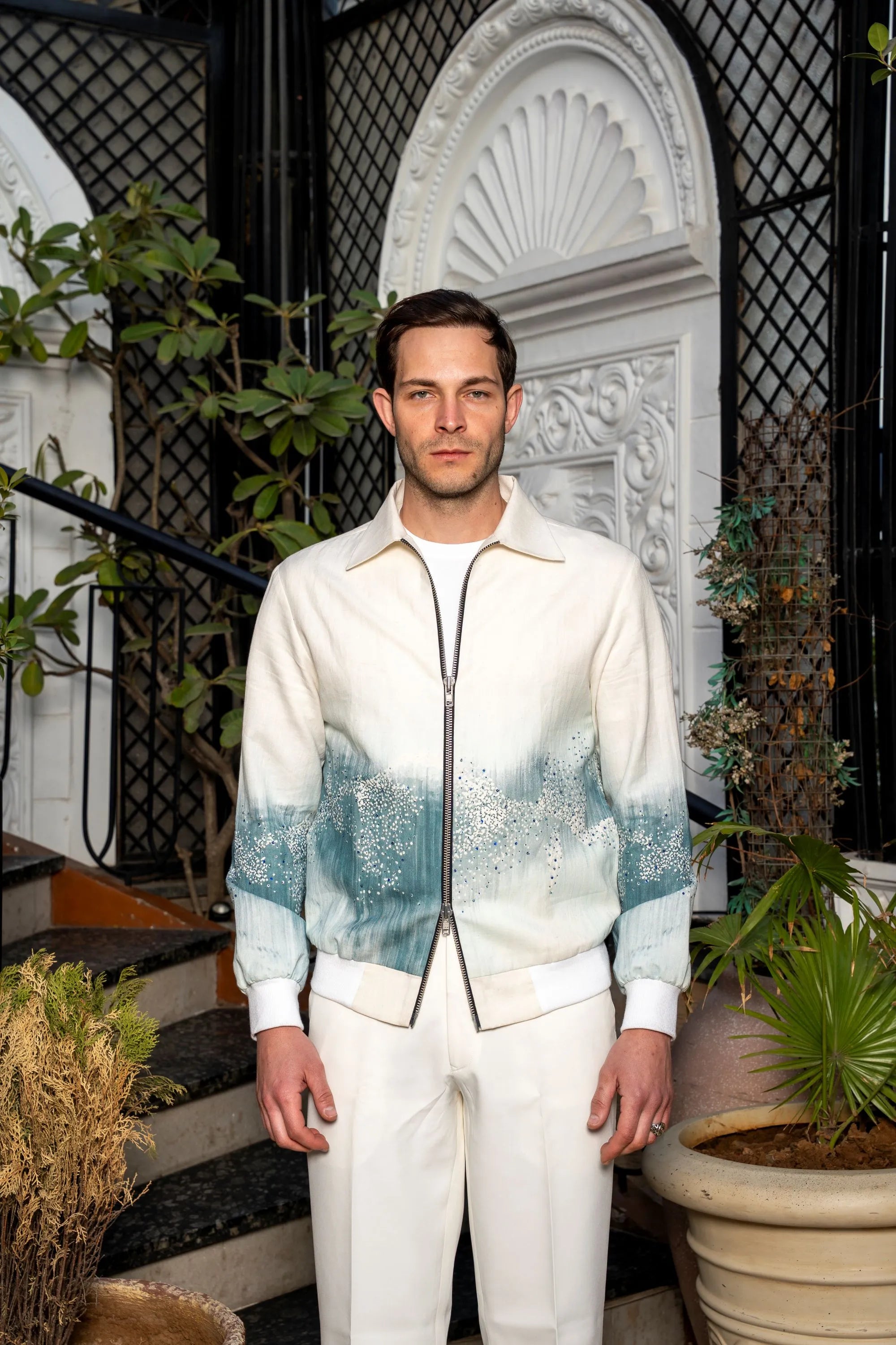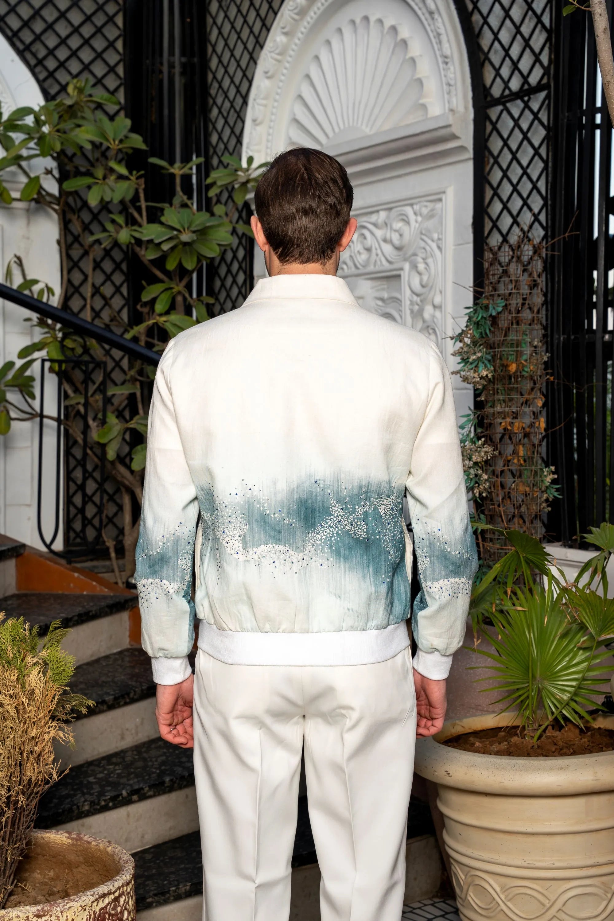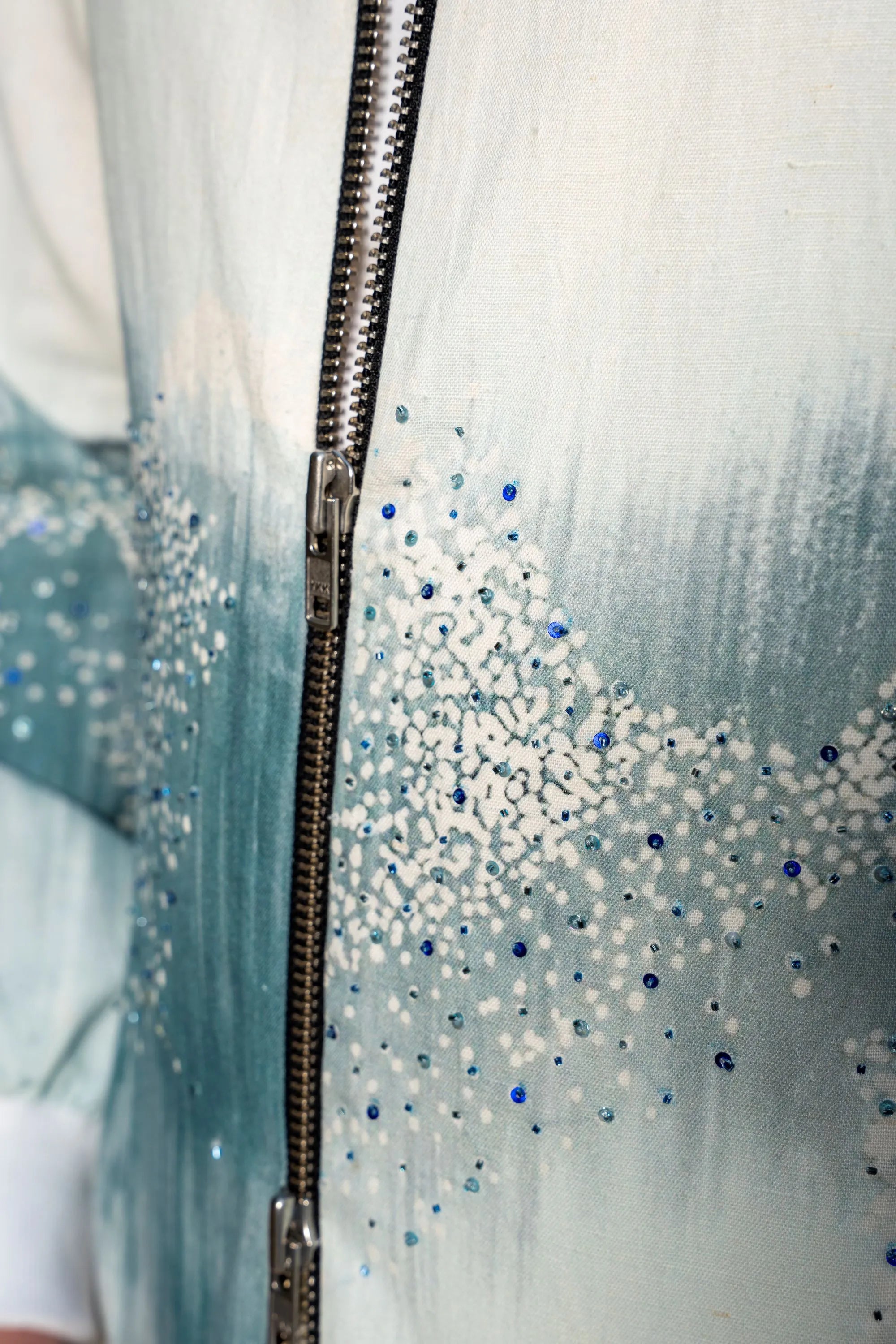 Exclusive ivory linen jacket with a blue water–inspired digital print, elevated with subtle hand embroidery to add a refined 3D effect.