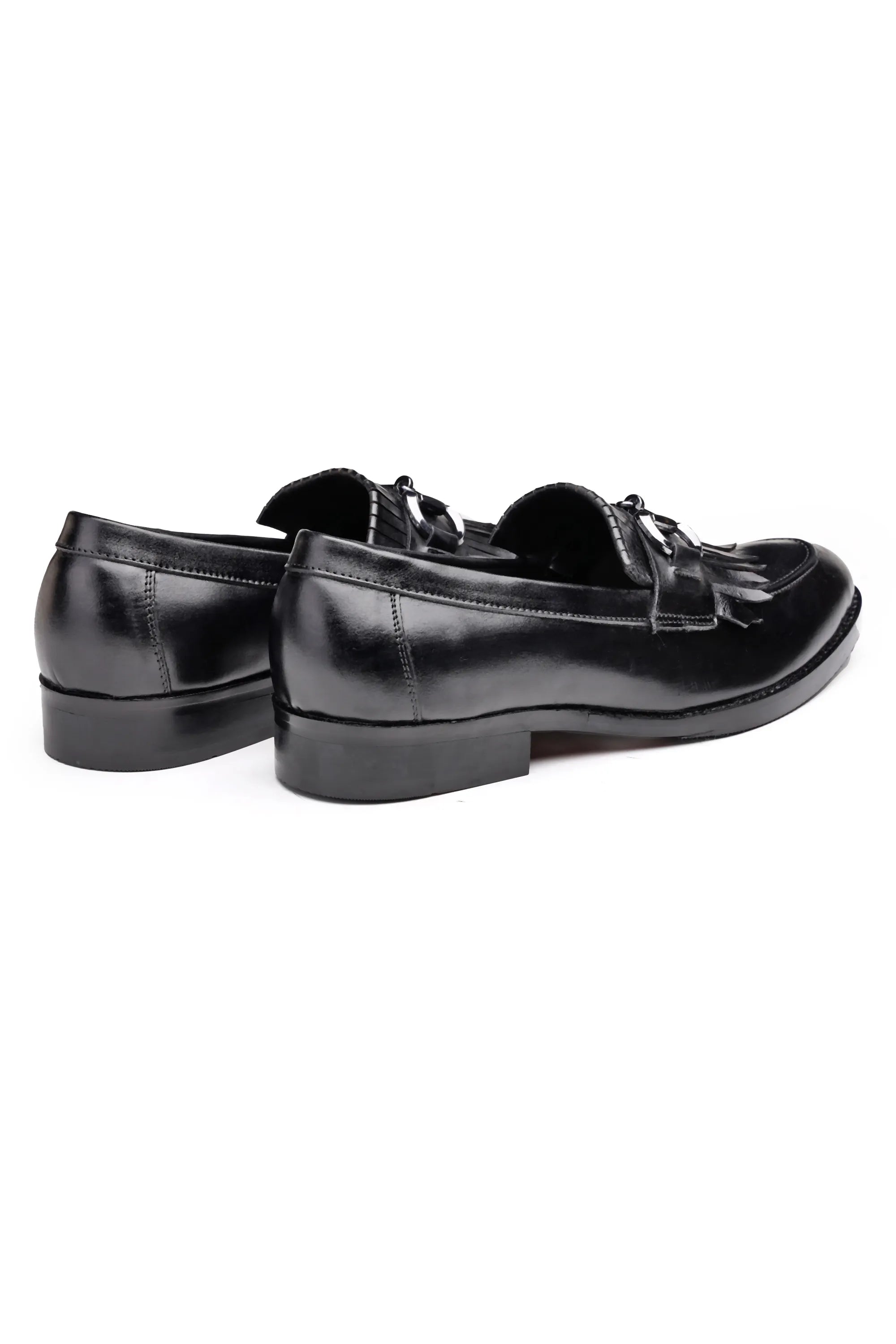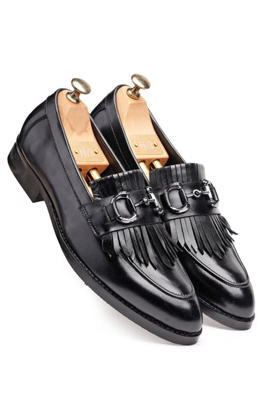 xperience premium craftsmanship with these Leather Horsebit Loafers for Men, available in Black and Brown. Designed with elegant fringe tassel detailing and a signature metal horsebit buckle, this pair blends classic charm with modern luxury. The polished leather finish enhances its bold, refined look, making it an ideal choice for formal, semi-formal, festive, and party wear.