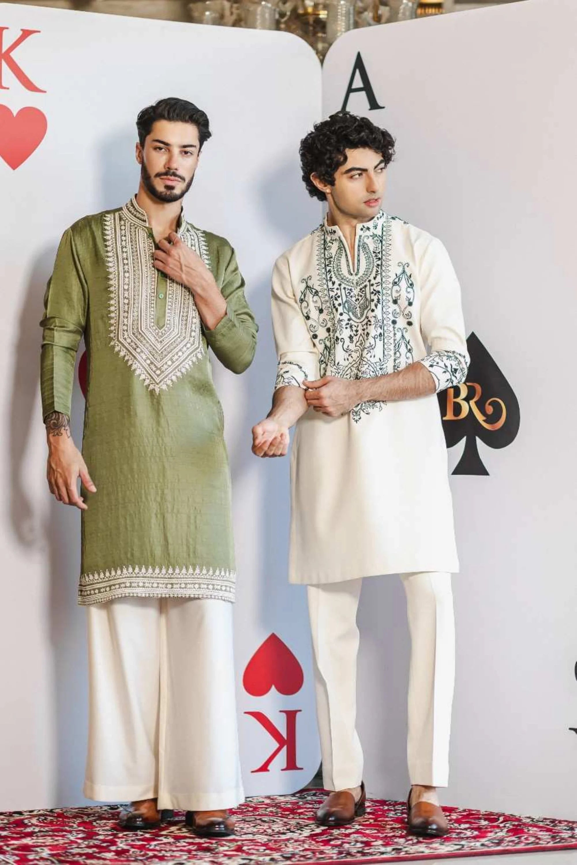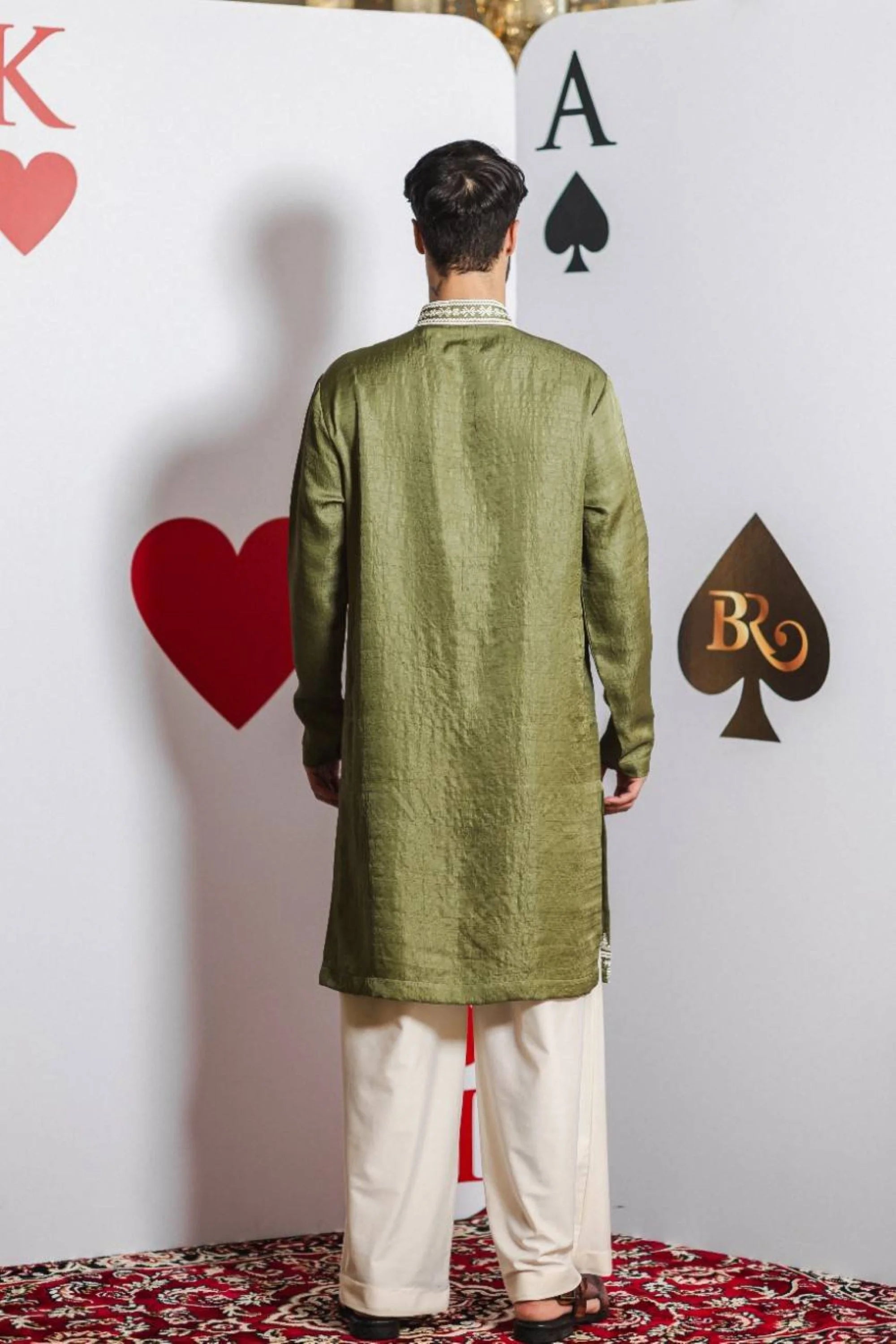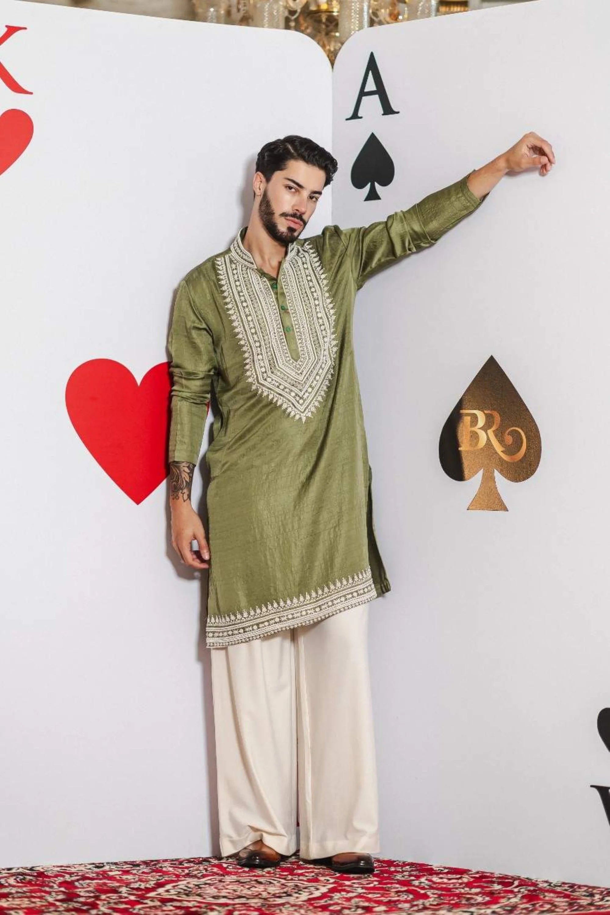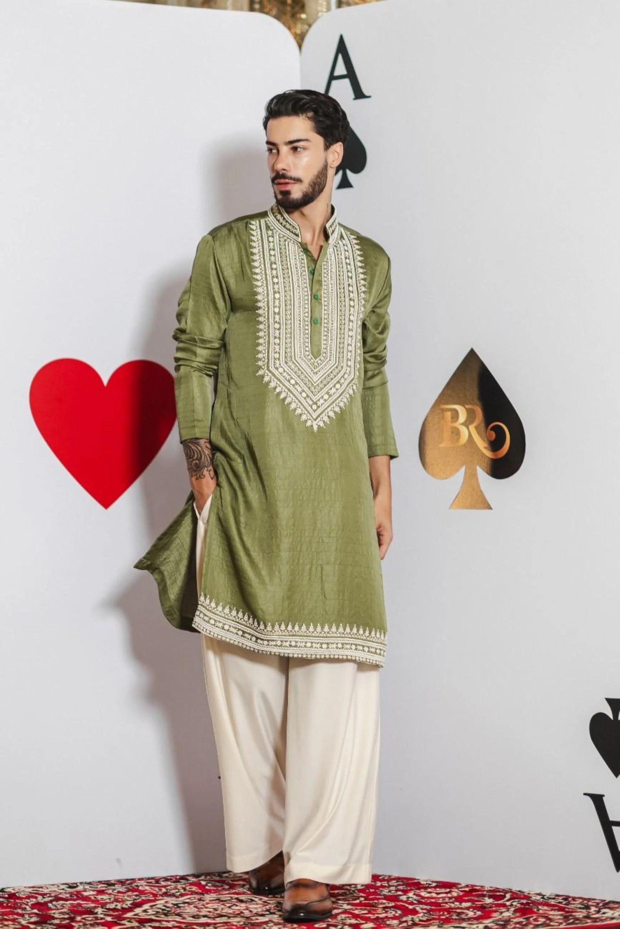 Celebrate festive elegance with the Limerick Glow Kurta Set. Crafted from luxurious limerick green silk satin, this kurta is adorned with delicate white hand embroidery, adding a refined charm to your ensemble. Paired with flowing ivory pants, it creates a graceful and stylish look perfect for Diwali, weddings, and other festive occasions.