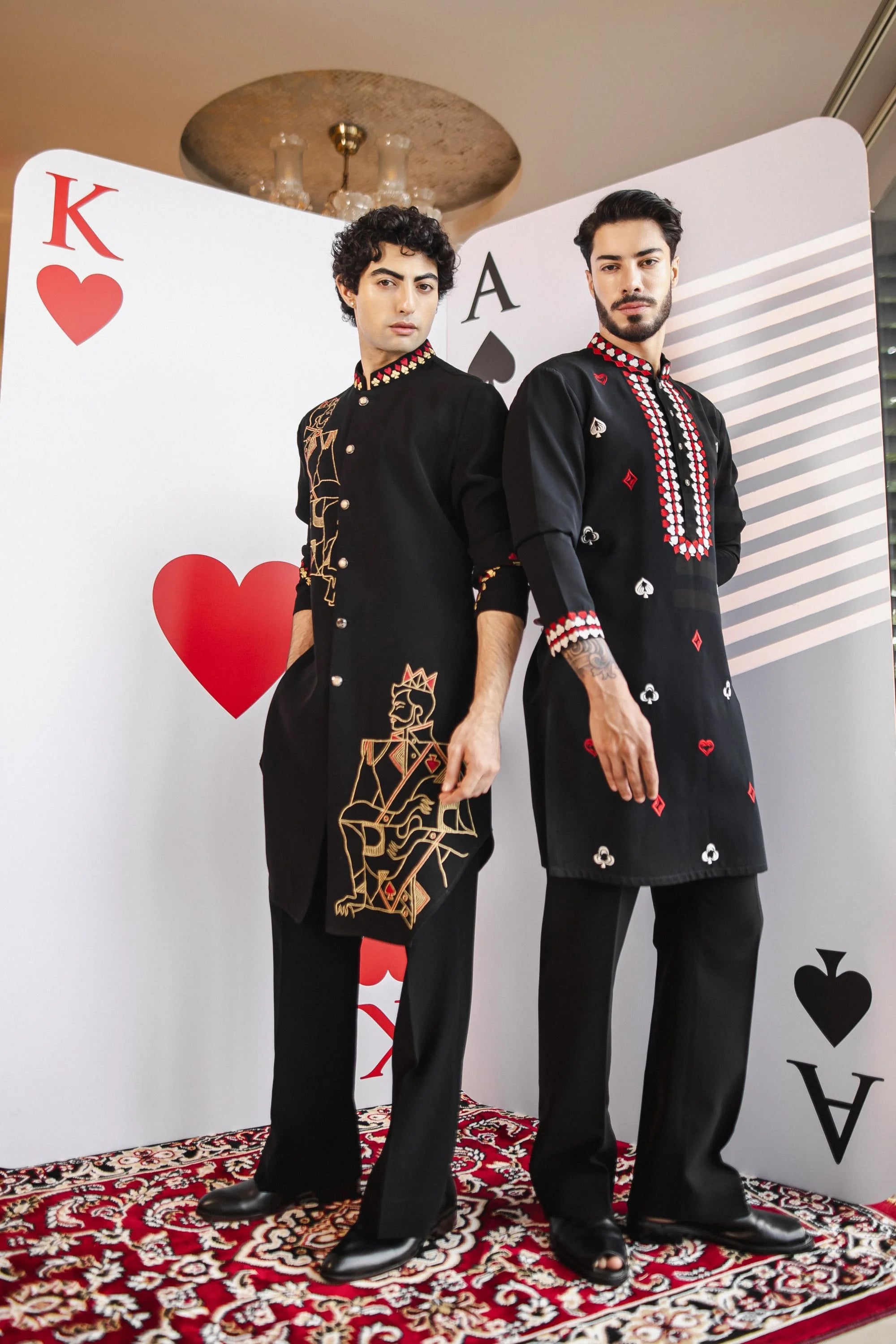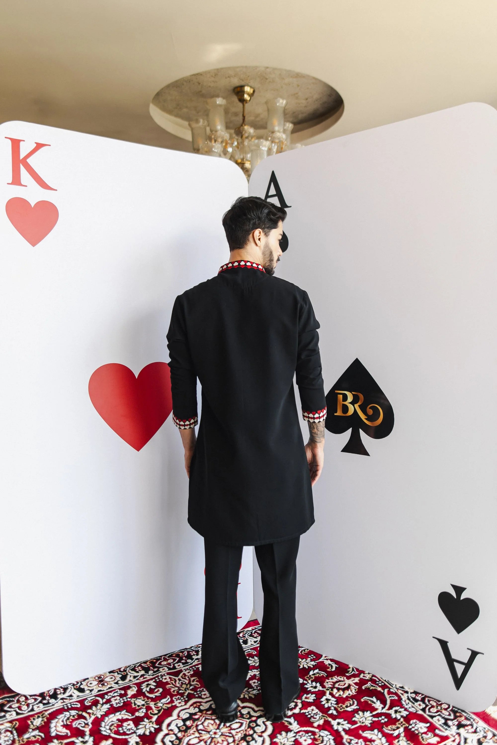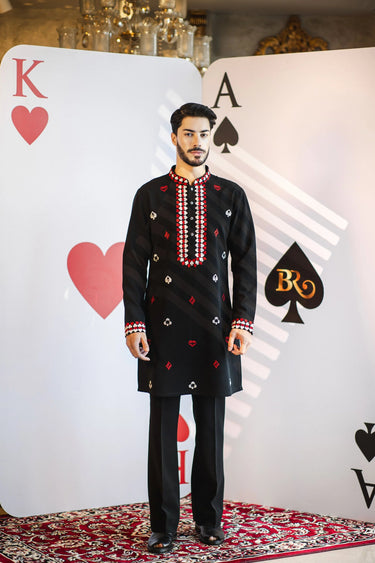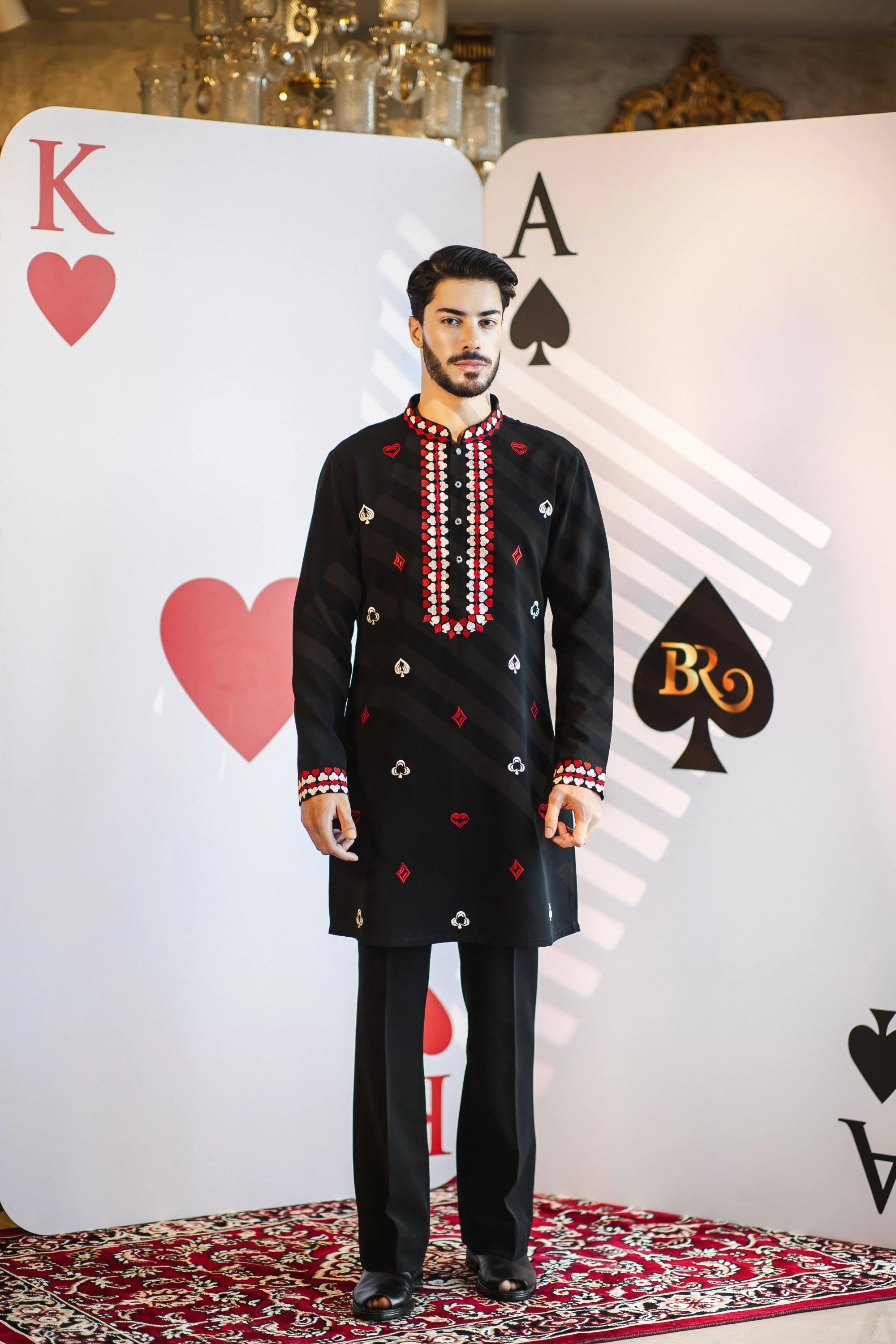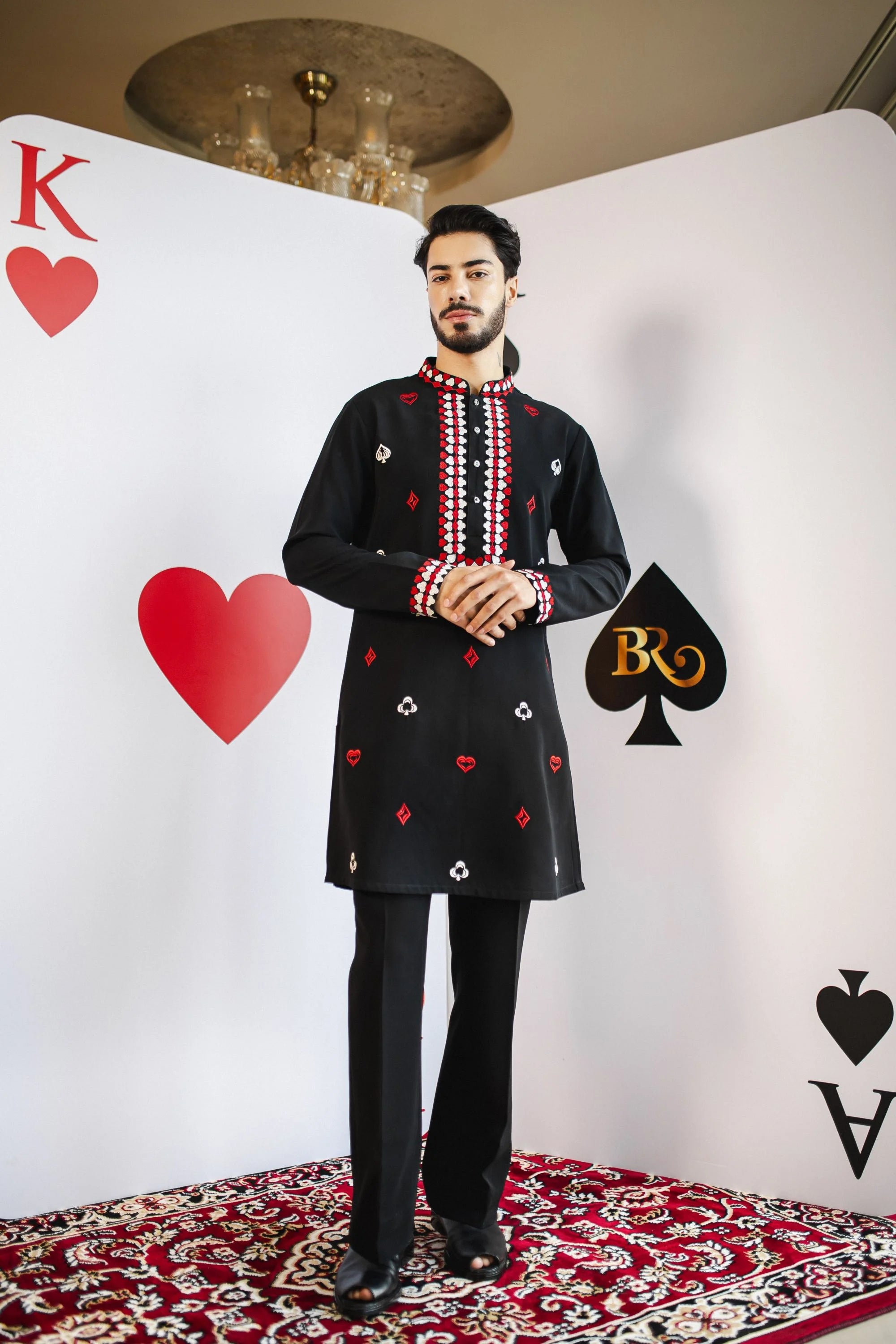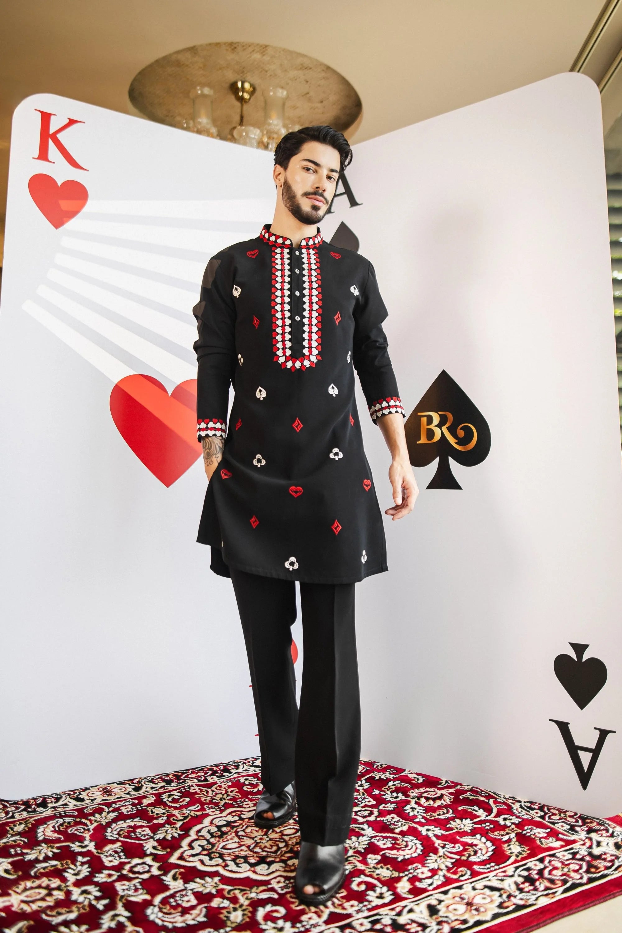 Lucky Card Black Kurta – Magna Fabric with Red & White Embroidery - Bharat Reshma Lucky Card Black Kurta – Magna Fabric with Red & White Embroidery - Bharat Reshma