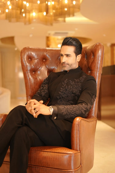 Men’s Black Meghna Bandhgala with Resham Floral Work