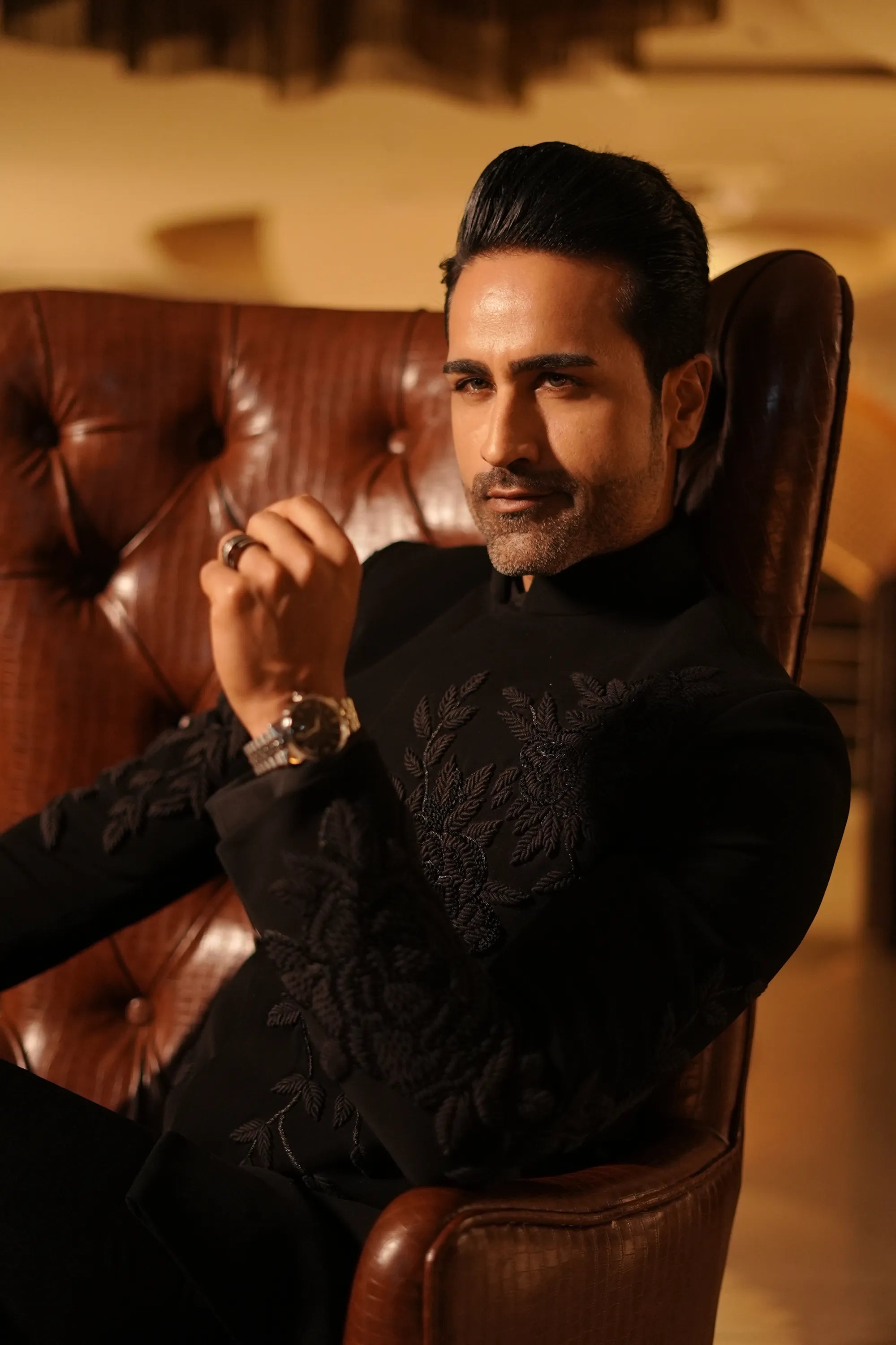 This elegant men’s Bandhgala is crafted from rich black Meghna fabric, featuring intricate resham French knot floral and leaf embroidery. Designed with a sharp, structured silhouette, it comes with a matching pant and a clean hook closure. Perfect for receptions, sangeet nights, and contemporary celebrations.