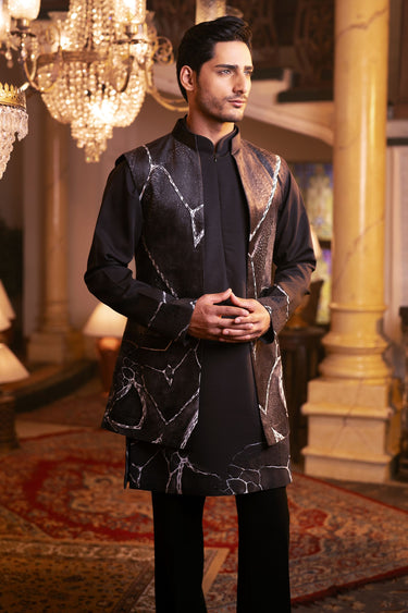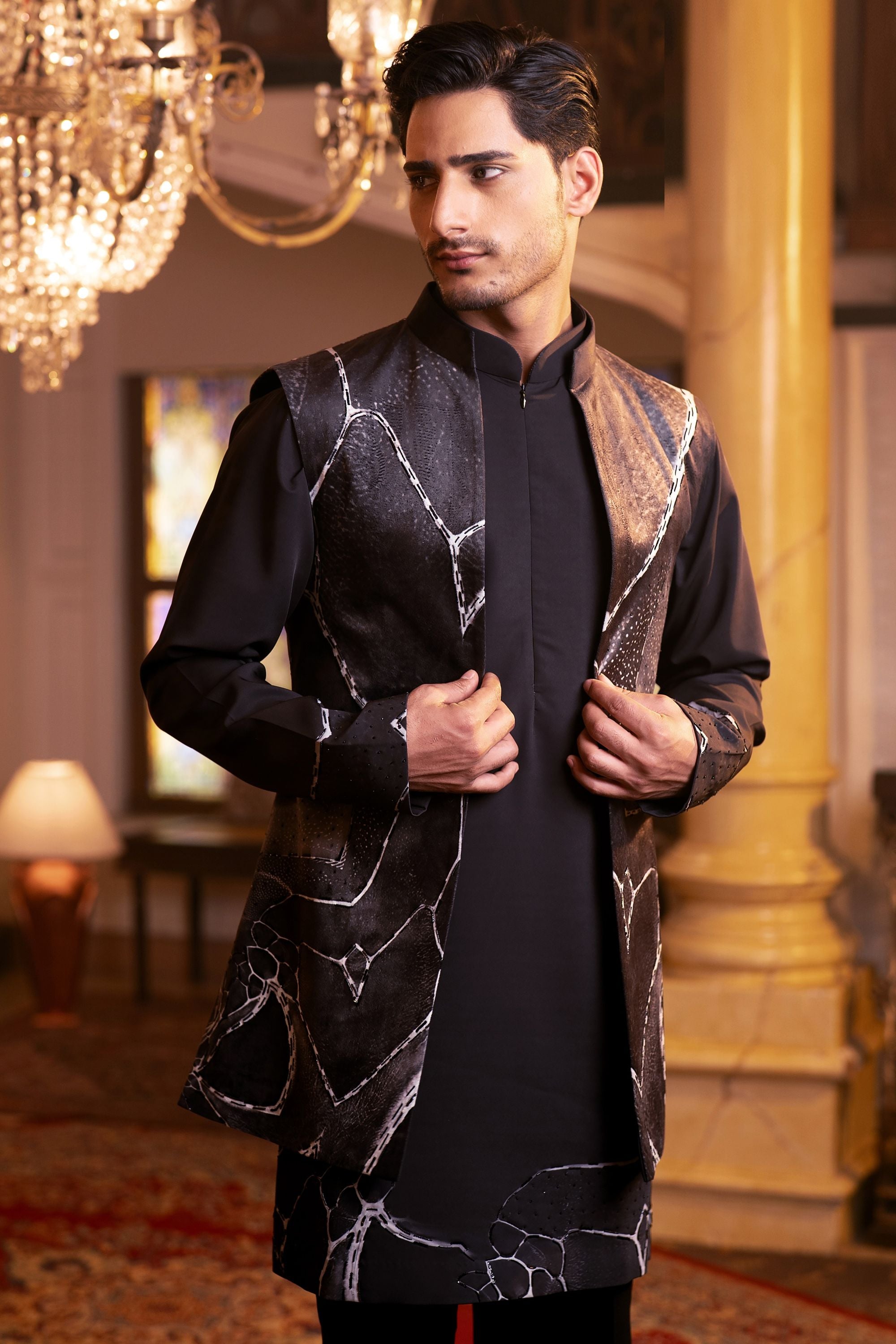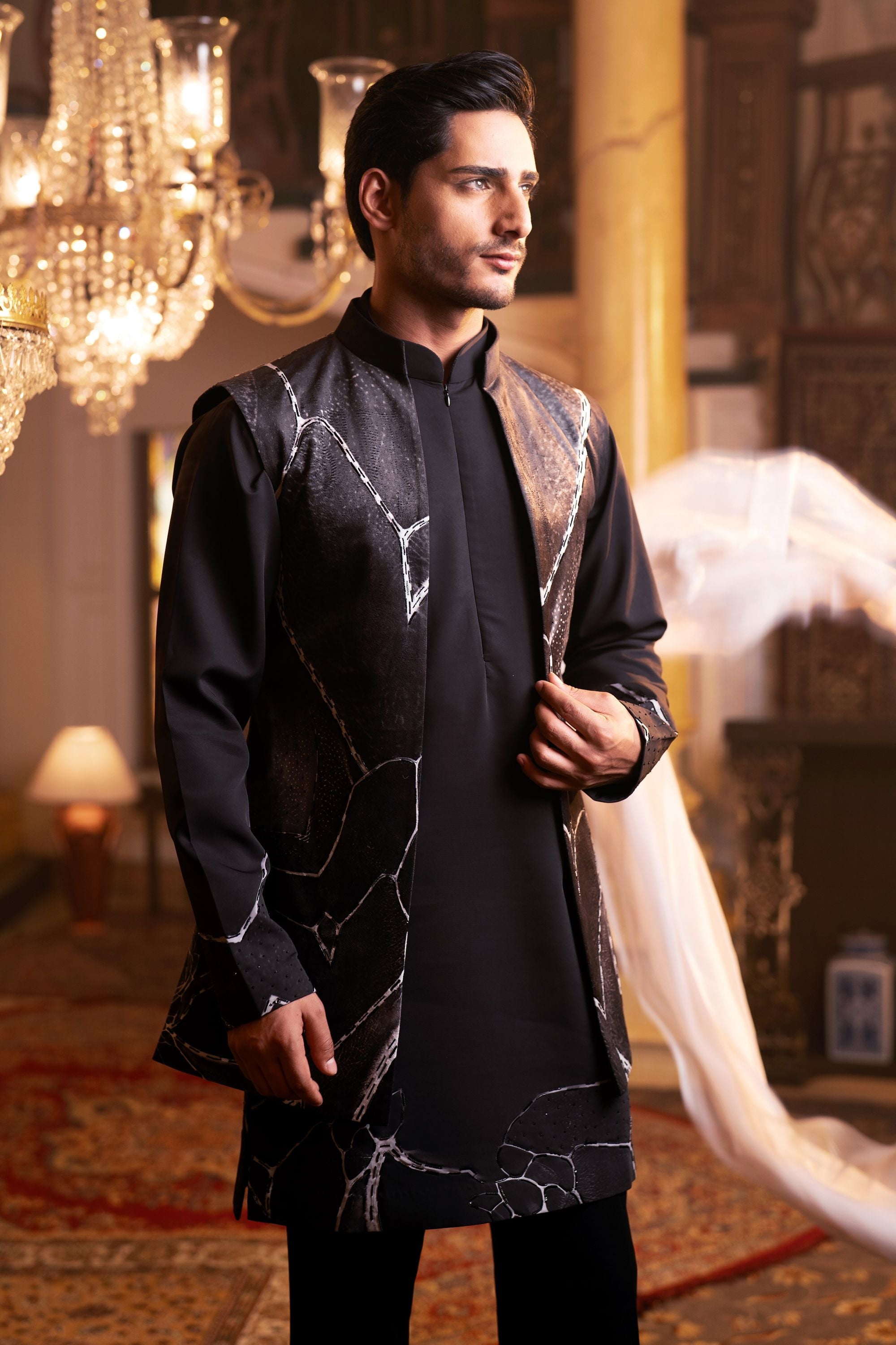 Elevate your festive style with this premium men’s black satin kurta set, crafted with modern detailing and timeless elegance. The kurta features high-quality digital print, exquisite hand cut-dana embroidery, and a convenient zip closure at the neck for ease and comfort.