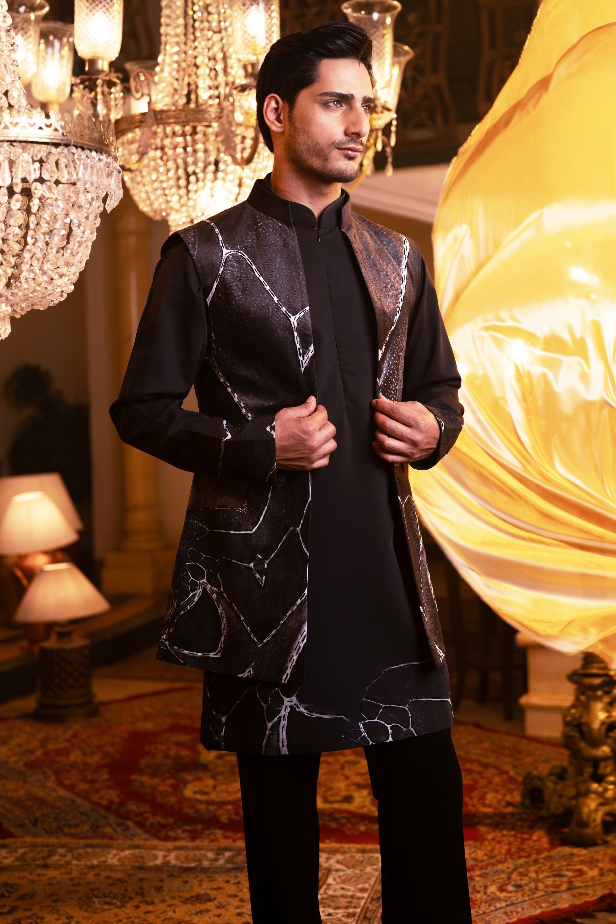 Paired with a coordinated digital-print waistcoat in soft sweat fabric and tailored pants, this 3-piece ensemble delivers a sharp, classic, and polished look. Perfect for weddings, sangeet nights, receptions, and festive celebrations, this outfit blends comfort, luxury, and standout craftsmanship—making it a must-have for the modern man.