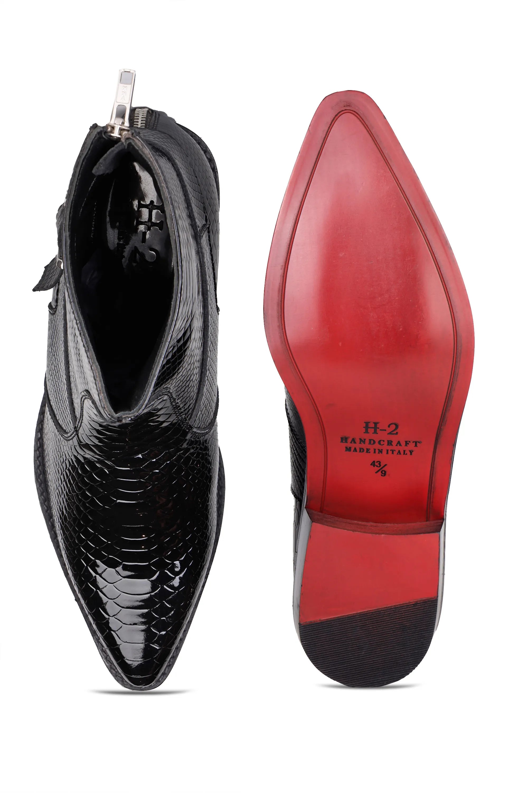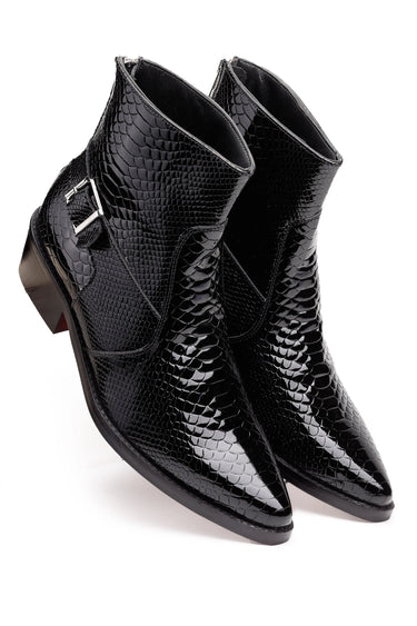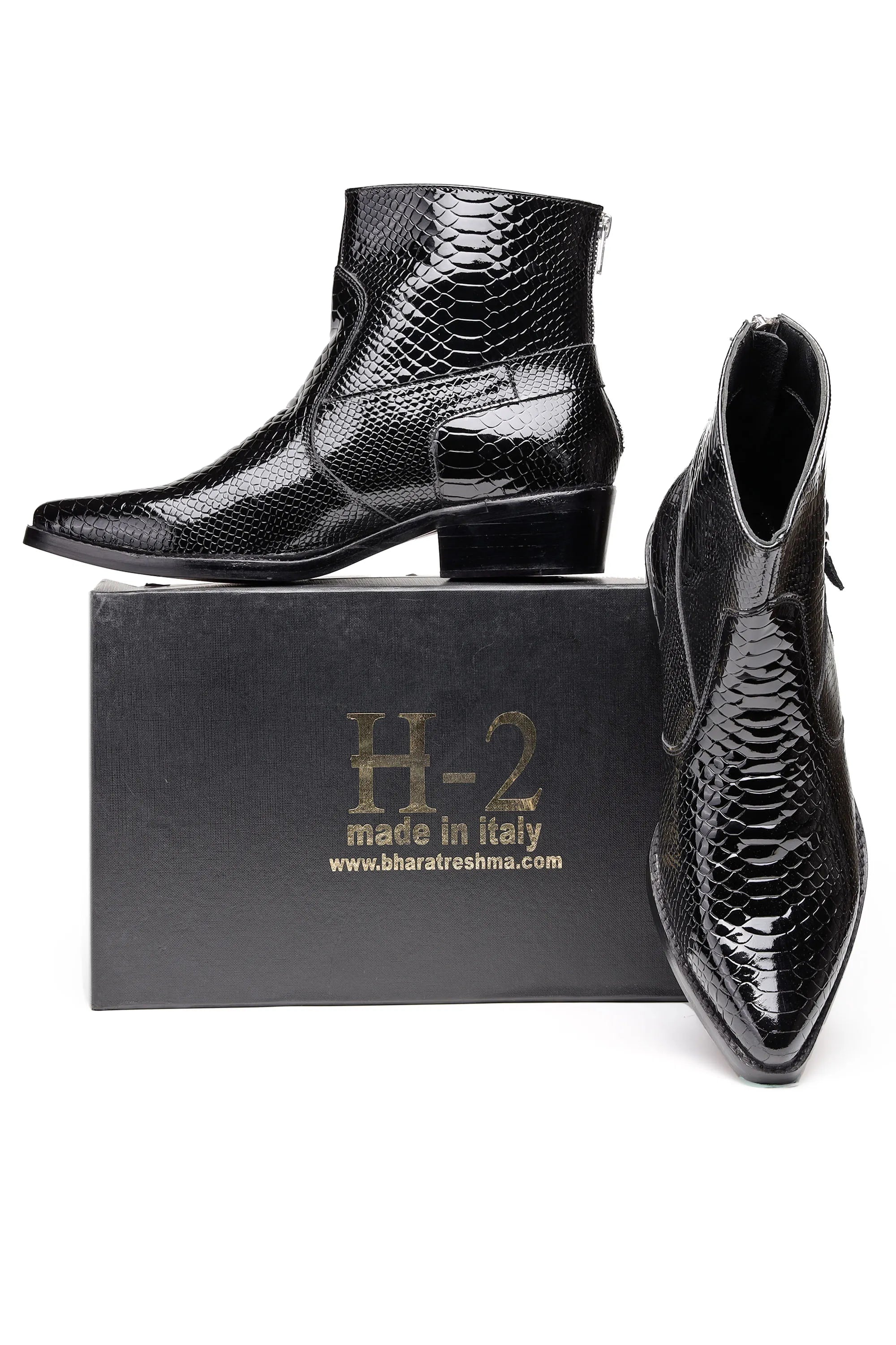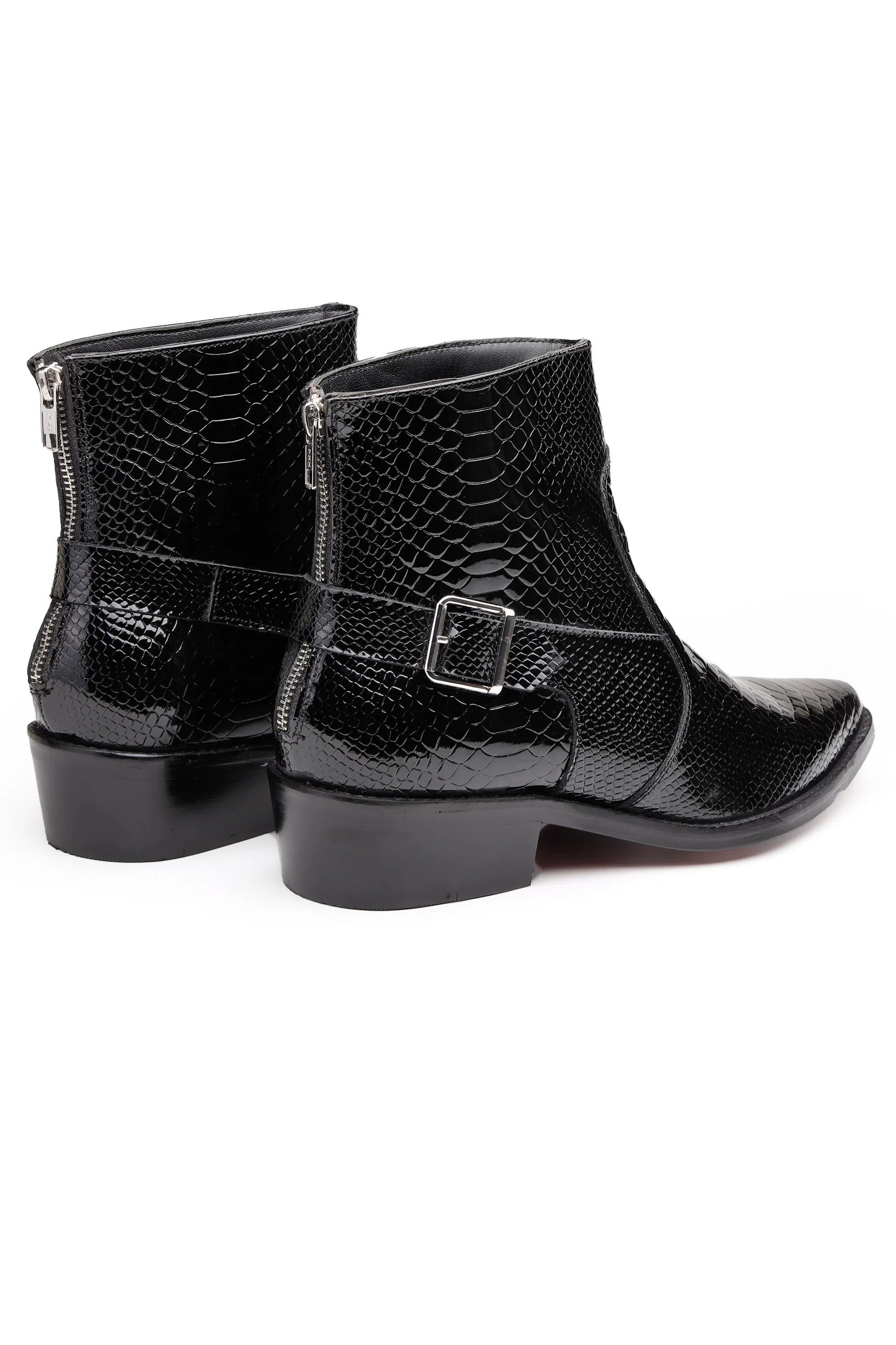 Men’s heeled ankle boots crafted in premium exotic-embossed leather with a snakeskin or crocodile texture. The pointed toe, polished finish, and raised heel create a bold formal look, while the side-zip design ensures easy wear. Perfect for weddings, evening wear, and statement formal styling.