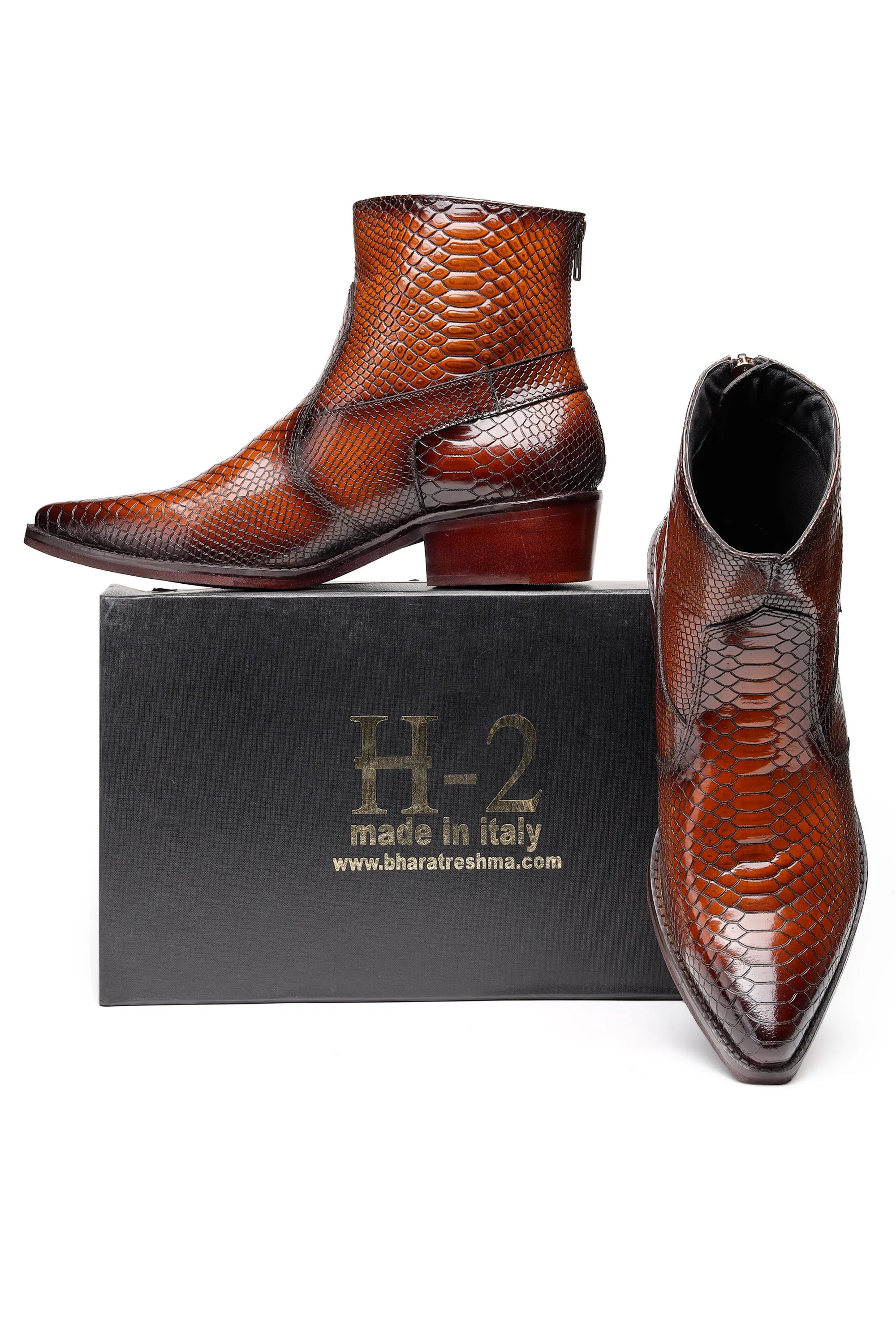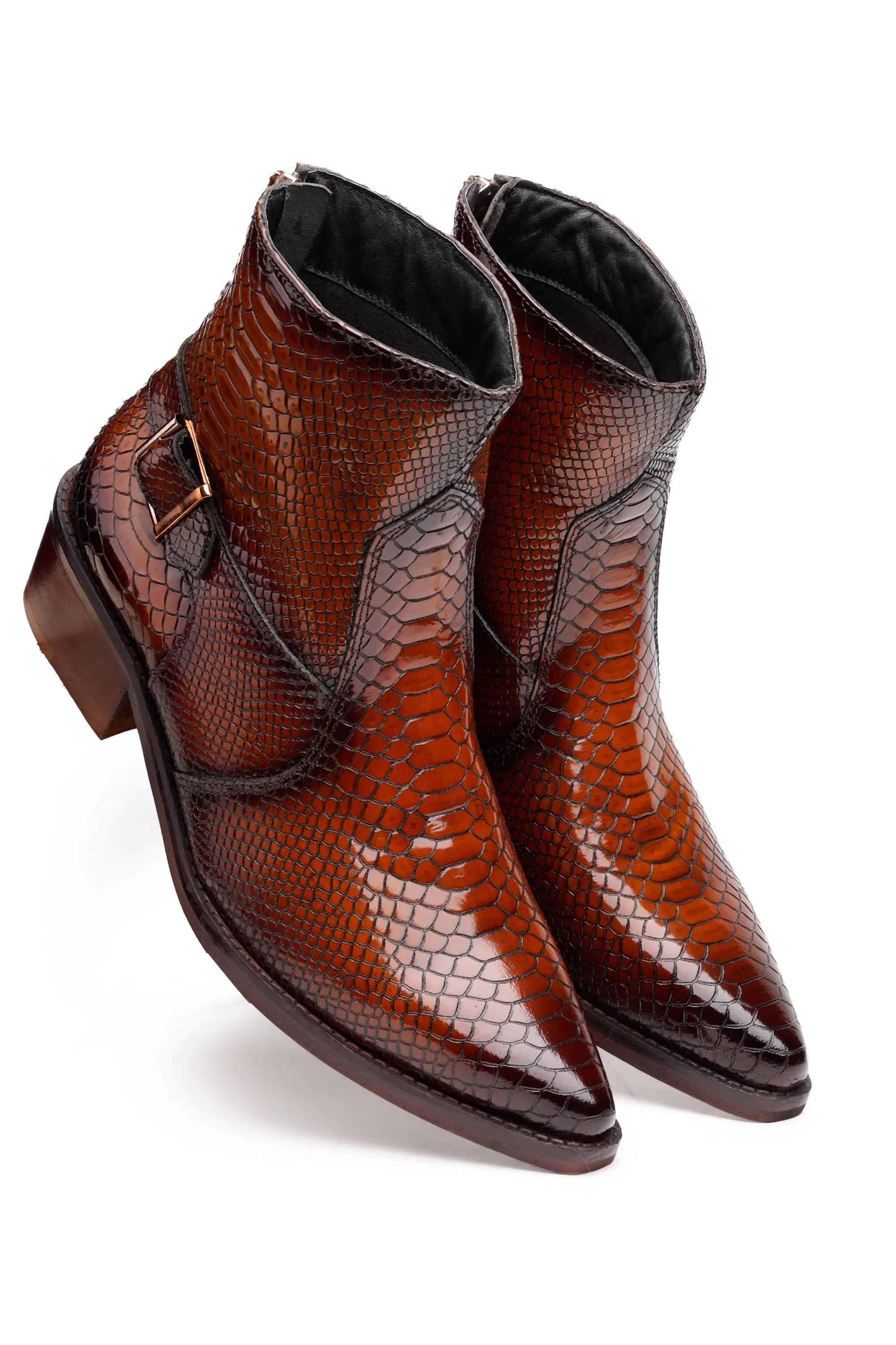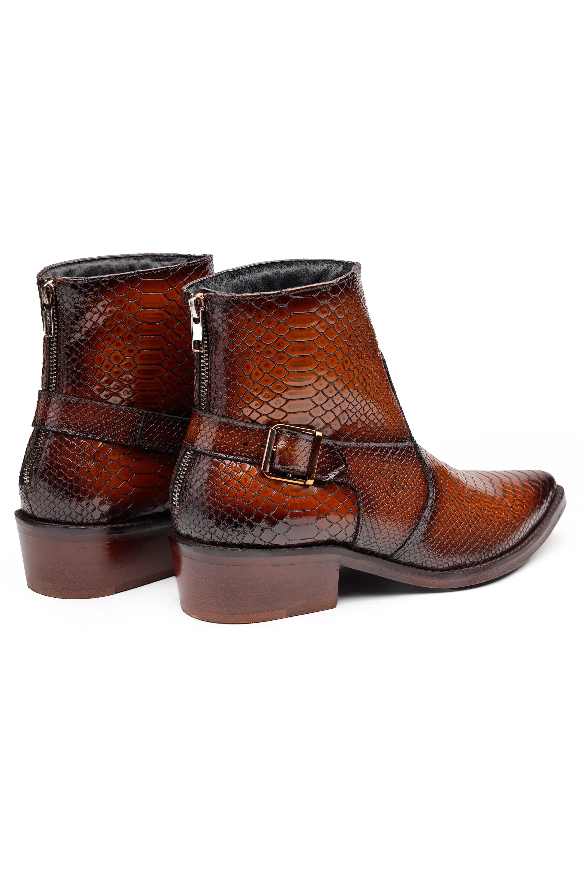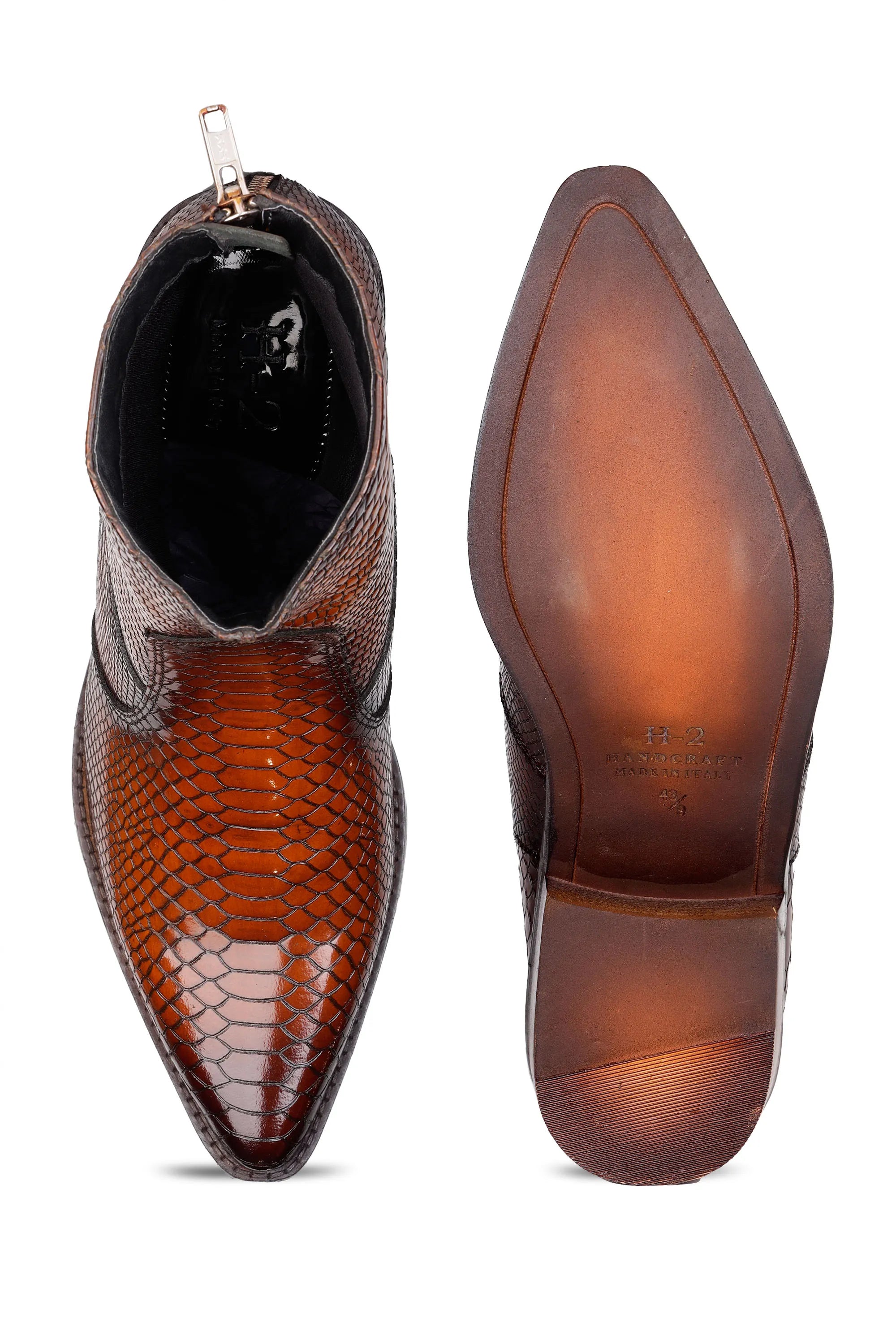 Men’s heeled ankle boots crafted in premium exotic-embossed leather with a snakeskin or crocodile texture. The pointed toe, polished finish, and raised heel create a bold formal look, while the side-zip design ensures easy wear. Perfect for weddings, evening wear, and statement formal styling.