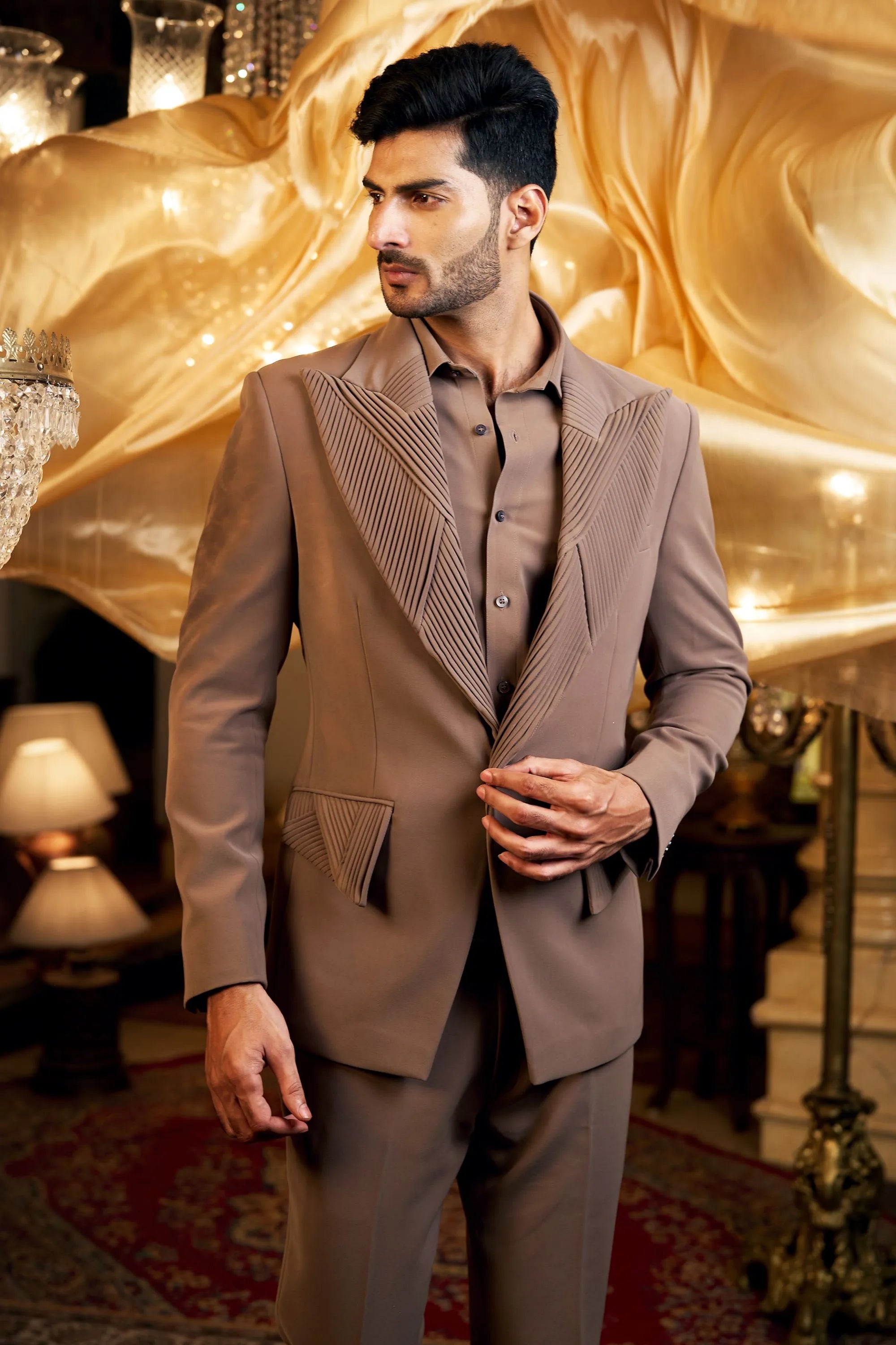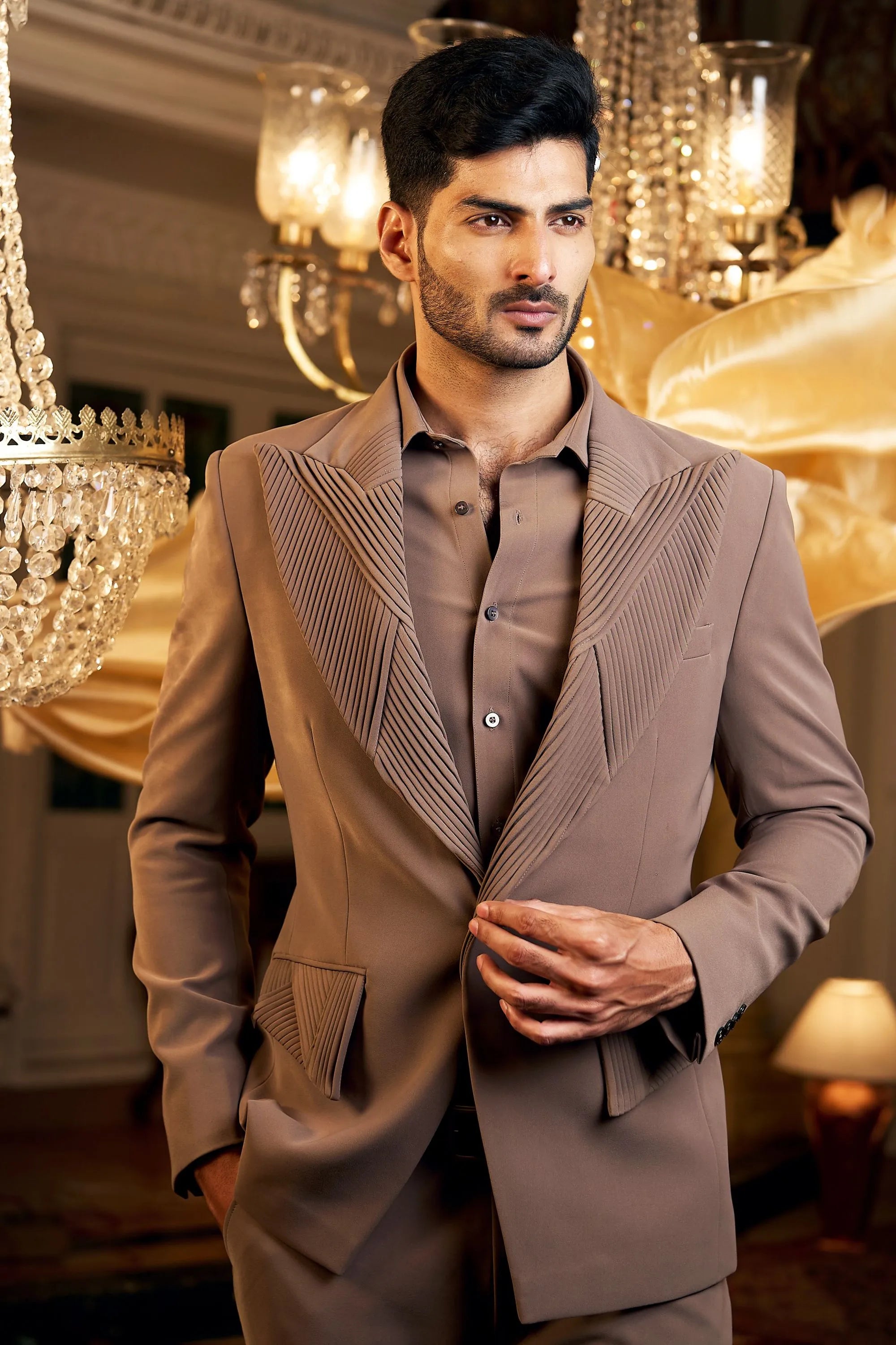 Crafted in premium Italian suiting fabric, this mocha brown suit features a structured 3D fabric-manipulated lapel and uniquely detailed pockets. Designed in a refined monochrome palette with matching pants and shirt, it delivers a modern, high-fashion statement.
