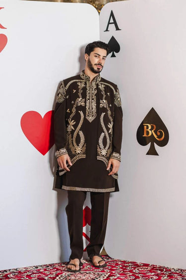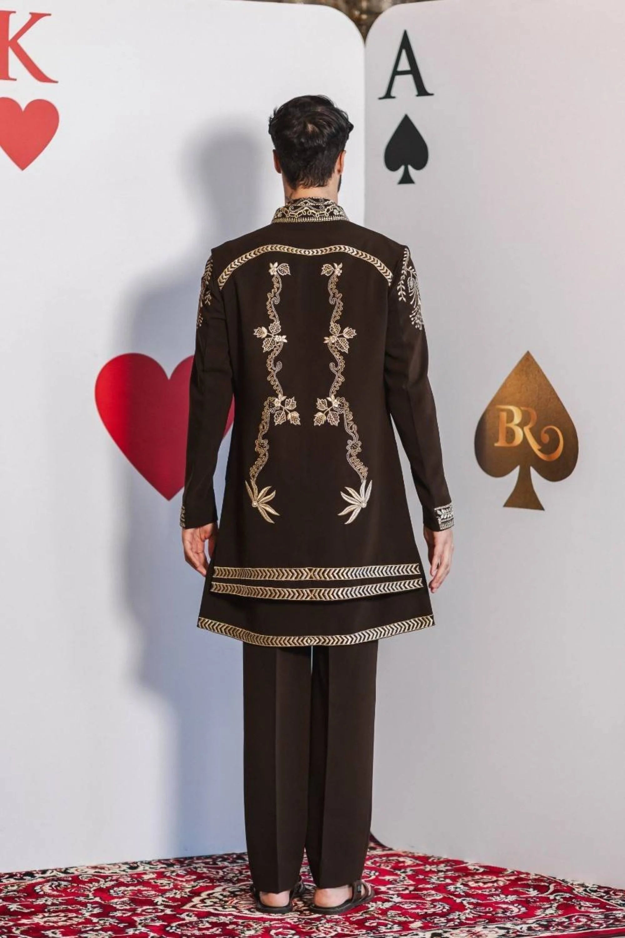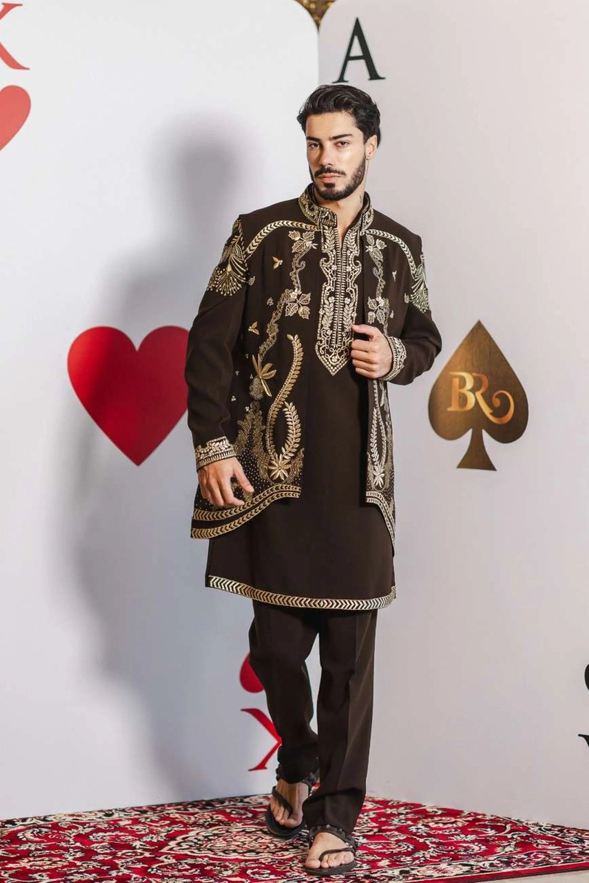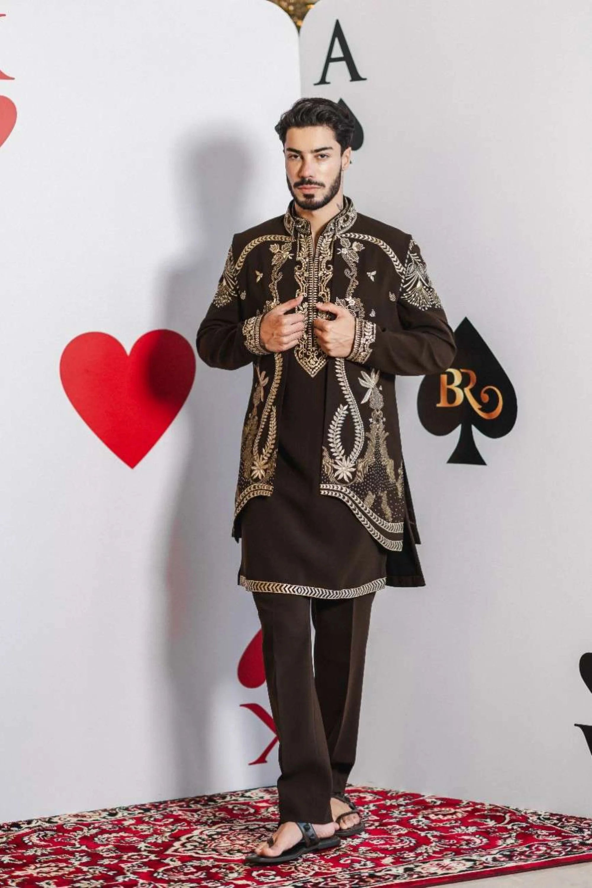 Elevate your festive wardrobe with the Monochrome Tide Bundi Kurta Set. This Brown sleeveless front-open jacket is paired with a matching kurta and trousers, featuring intricate grey and white thread embroidery in a symmetrical design. The wave-cut hem and detailed embroidery across both jacket and kurta create a cohesive, contemporary-traditional look. Crafted from Magna fabric with a slim fit, this set is perfect for Diwali, weddings, and special occasions.
