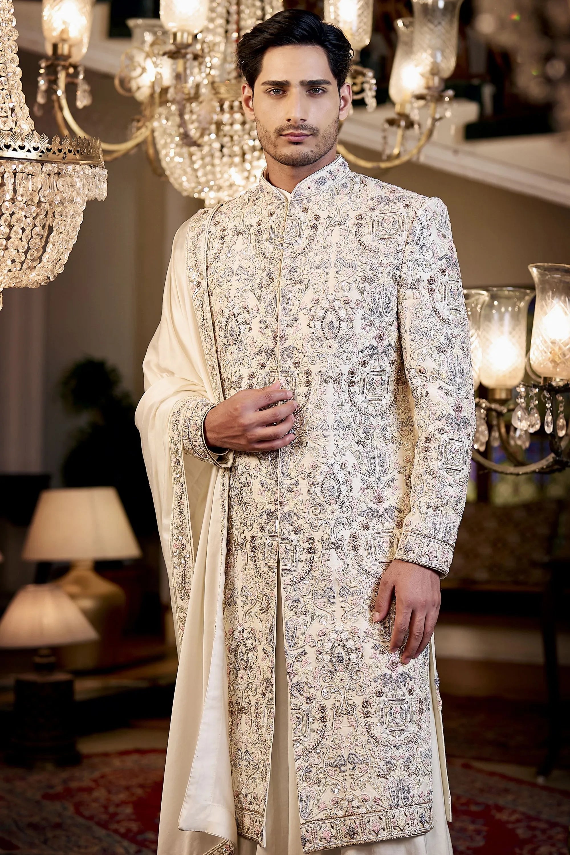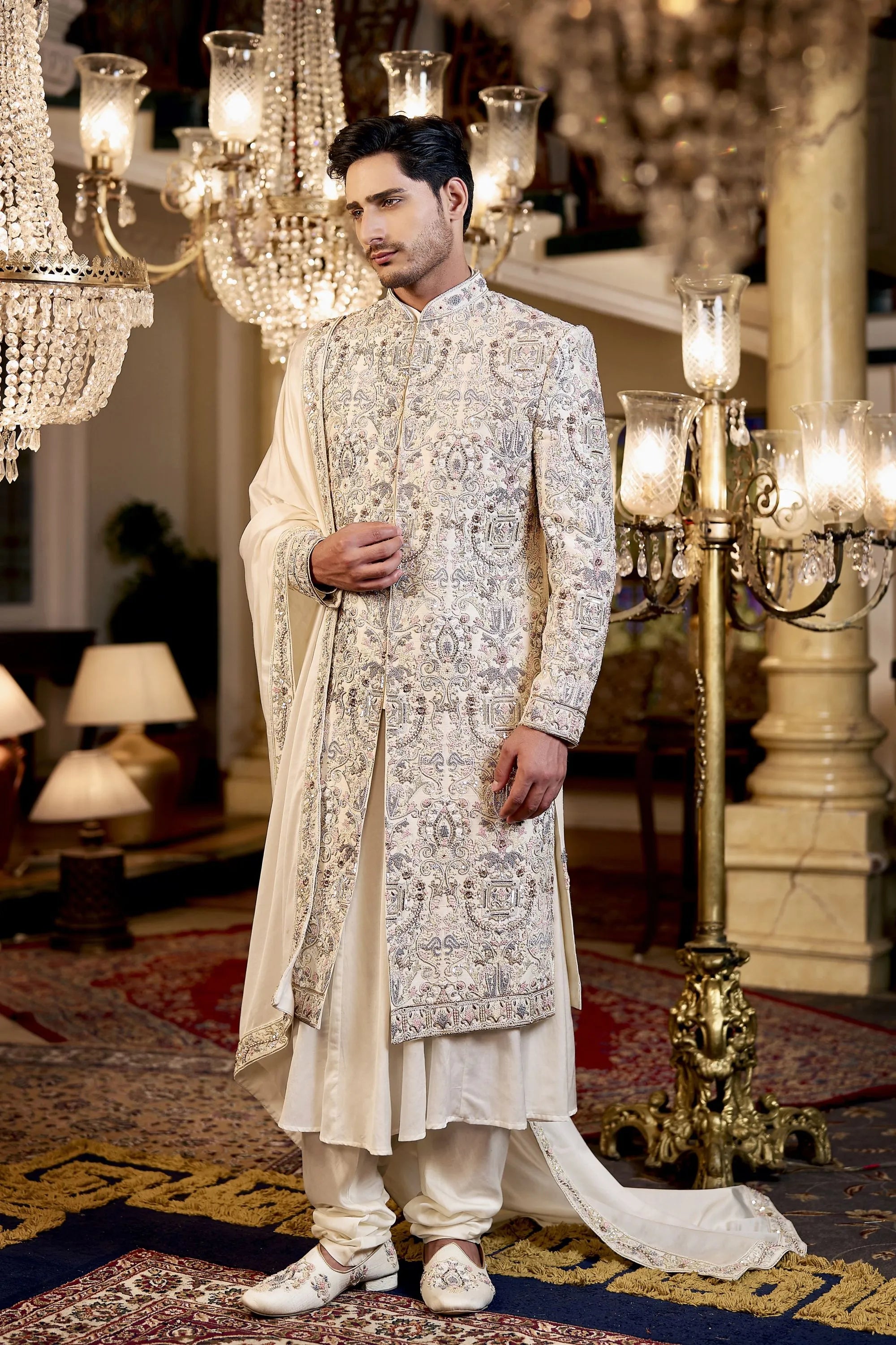 Crafted on an off-white raw silk base, this sherwani features multicolour digital print with delicate hand embroidery. Paired with a kali kurta, printed-border stole and churidar, it delivers a regal and vibrant festive look—perfect for weddings and celebrations.