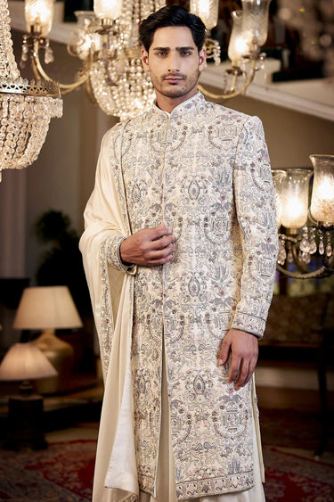 Off-White Raw Silk Sherwani with Digital Print & Hand Embroidery