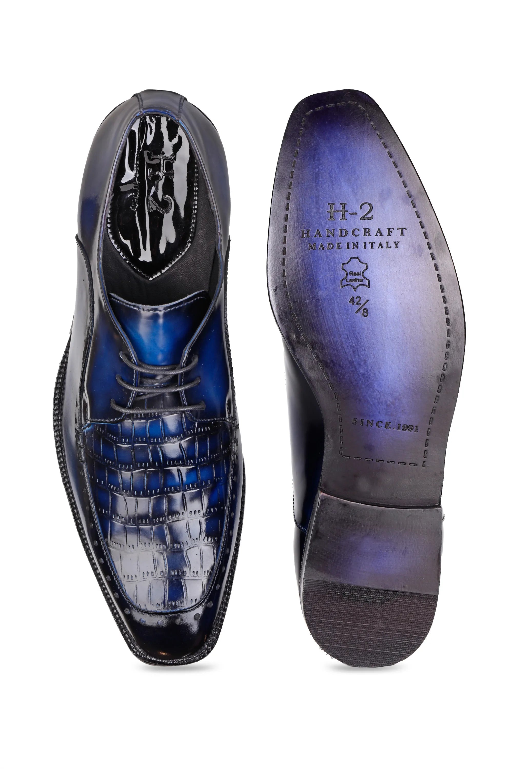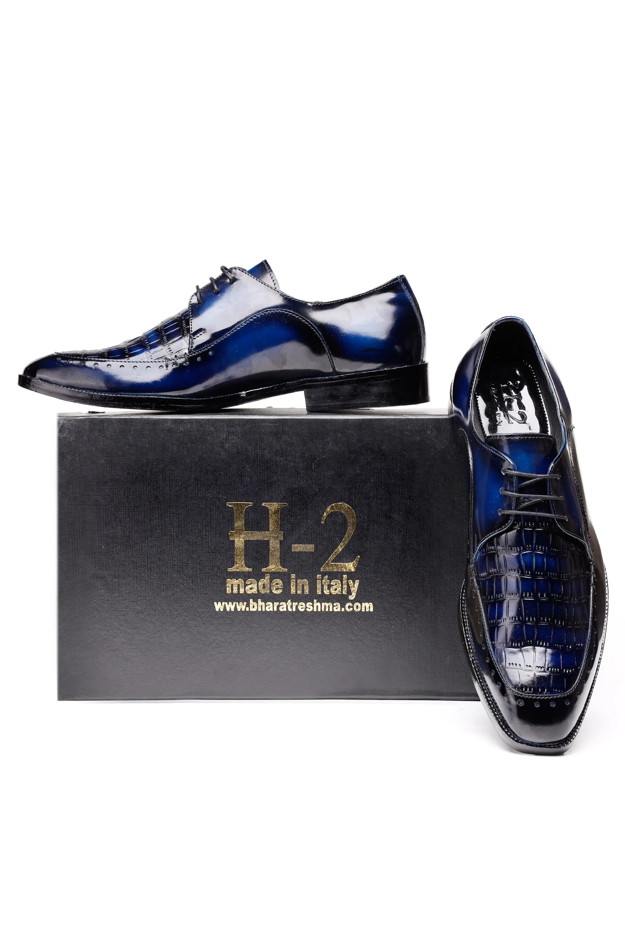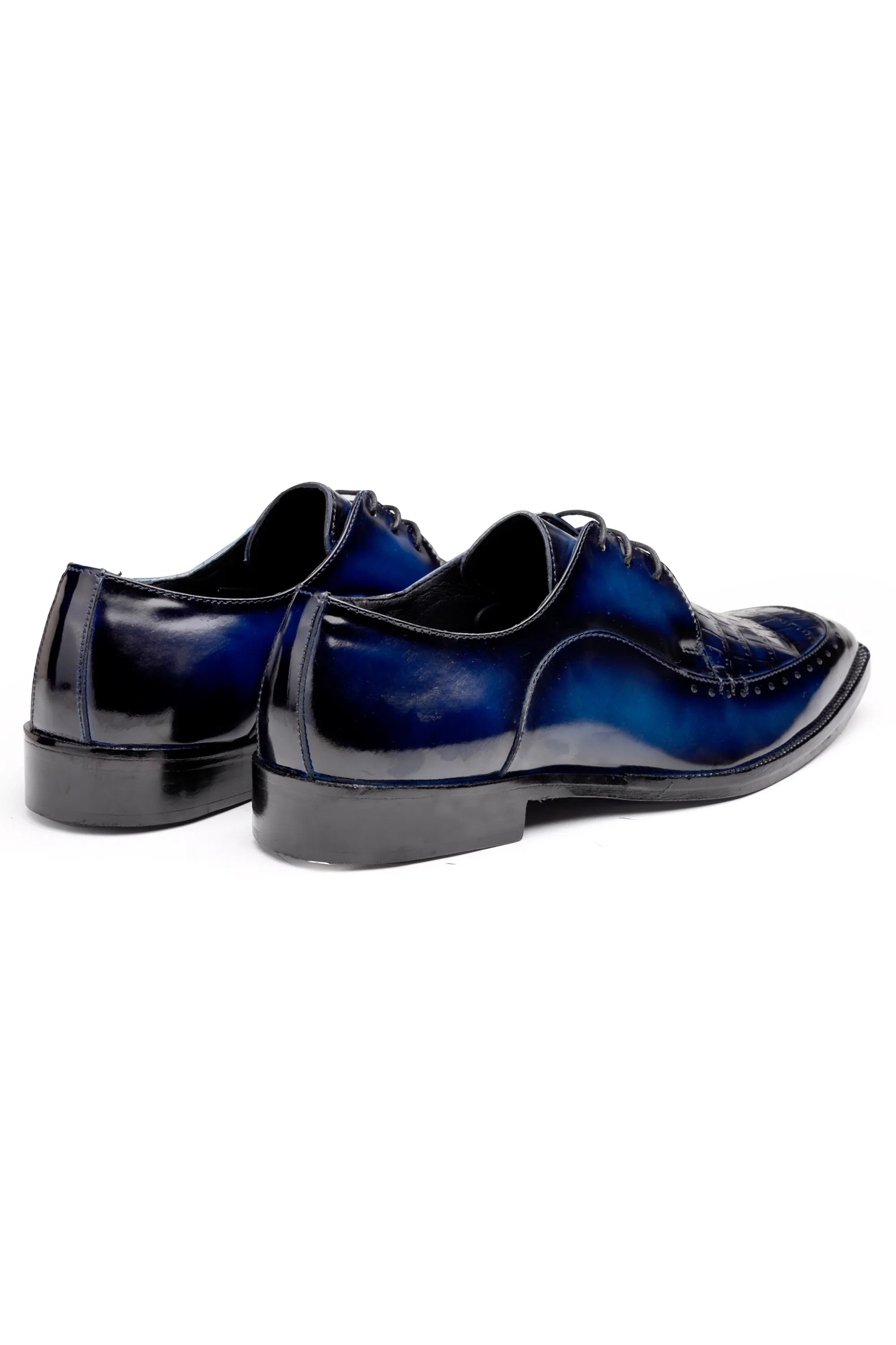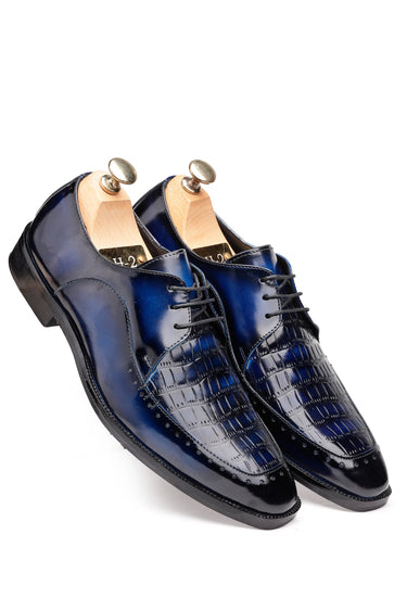 Crafted in a luxurious patina finish, these Derby shoes — available in both Blue and Black — are designed for men who appreciate bold elegance with refined detailing. The upper features a croc-embossed square texture that adds depth and an exotic luxury appeal, perfectly balanced by smooth glossy leather panels that bring a modern, sophisticated contrast.