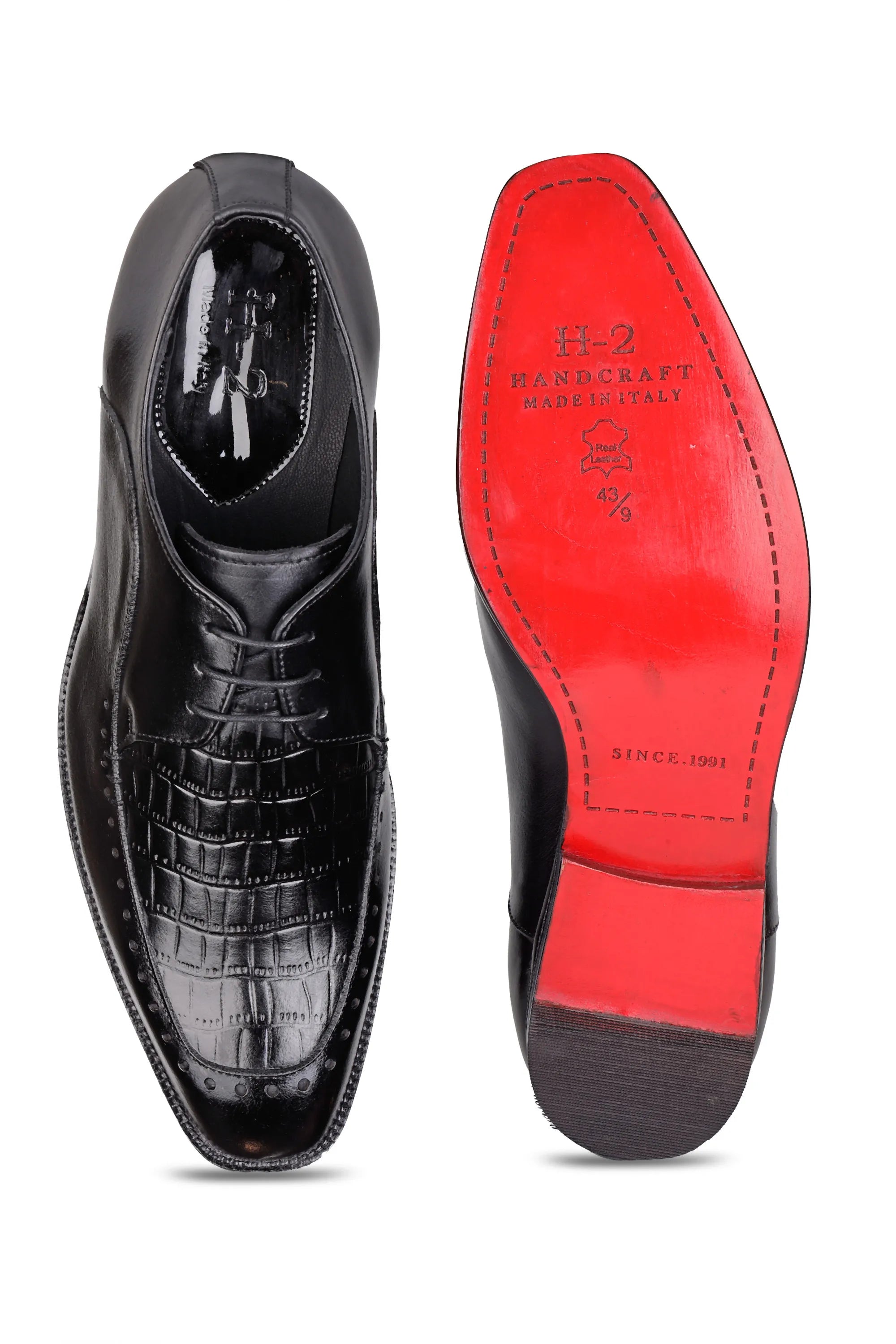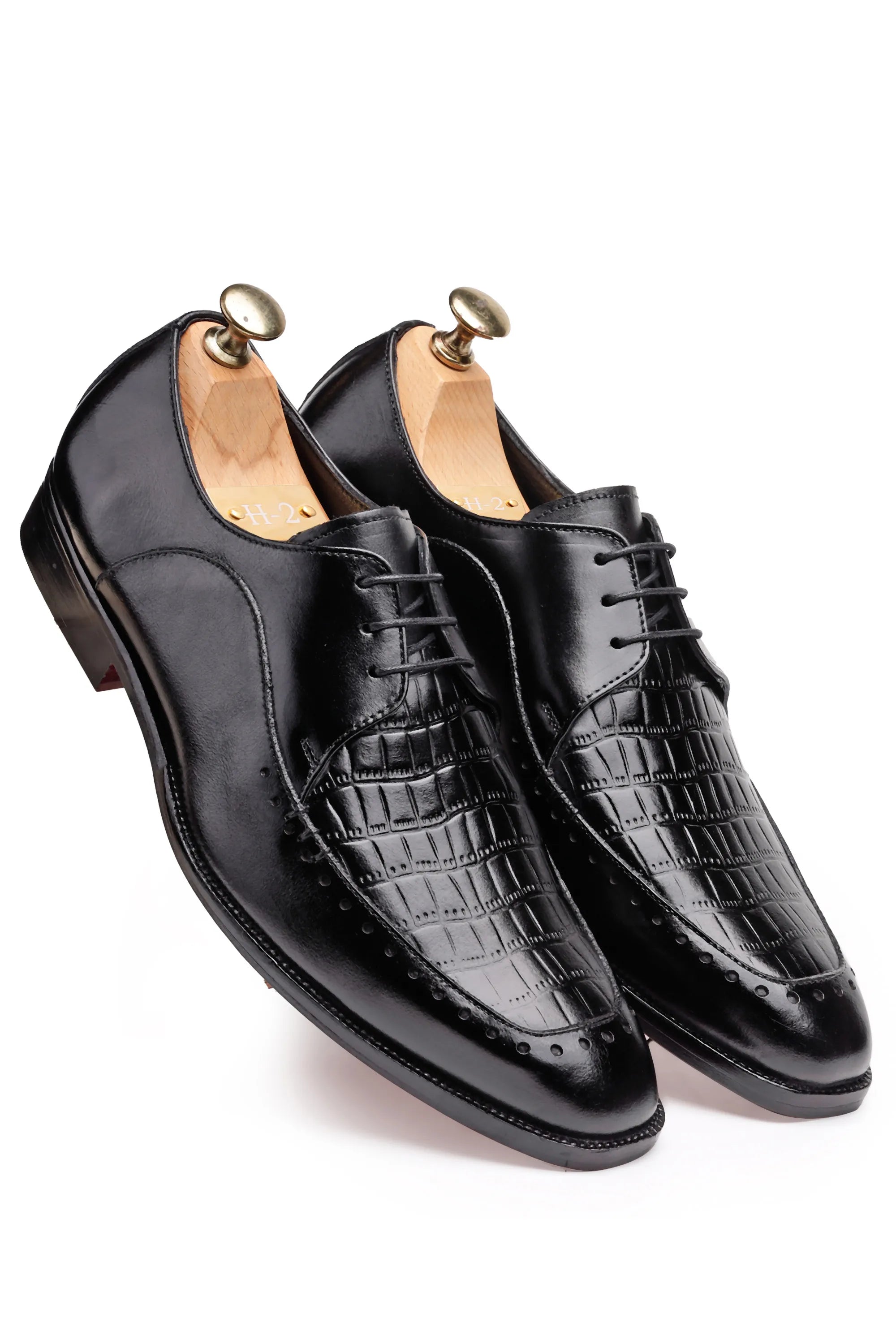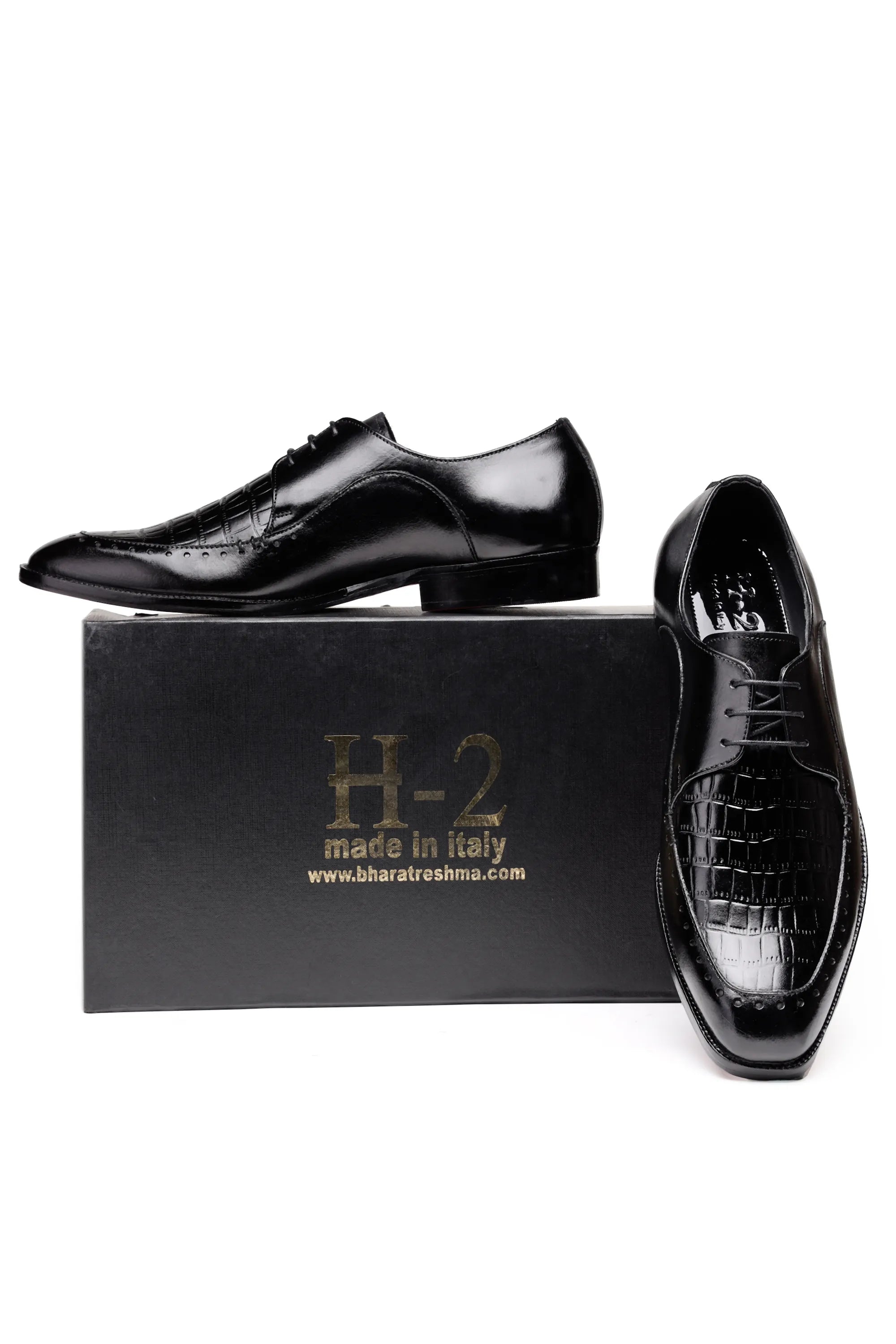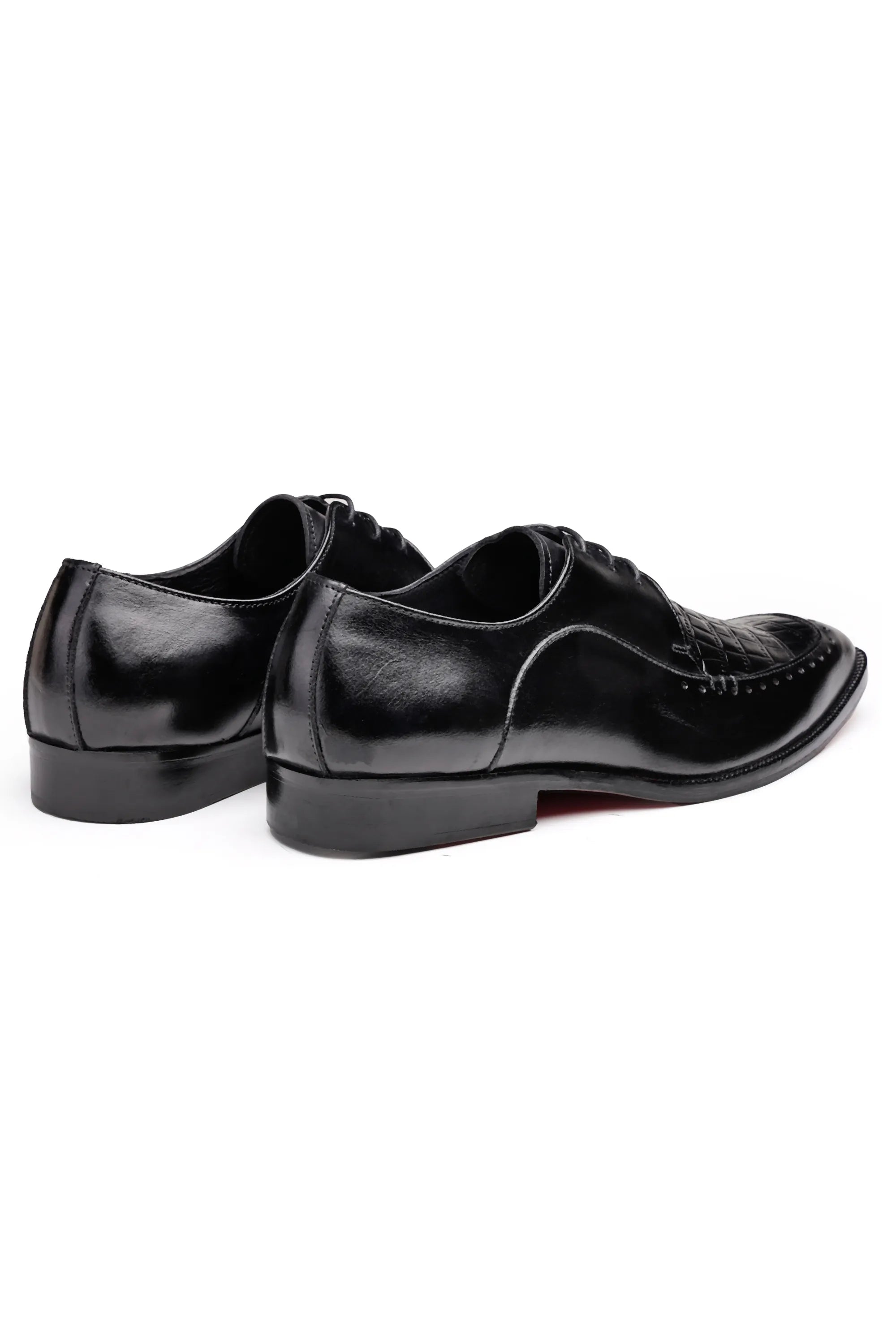 Crafted in a luxurious patina finish, these Derby shoes — available in both Blue and Black — are designed for men who appreciate bold elegance with refined detailing. The upper features a croc-embossed square texture that adds depth and an exotic luxury appeal, perfectly balanced by smooth glossy leather panels that bring a modern, sophisticated contrast.