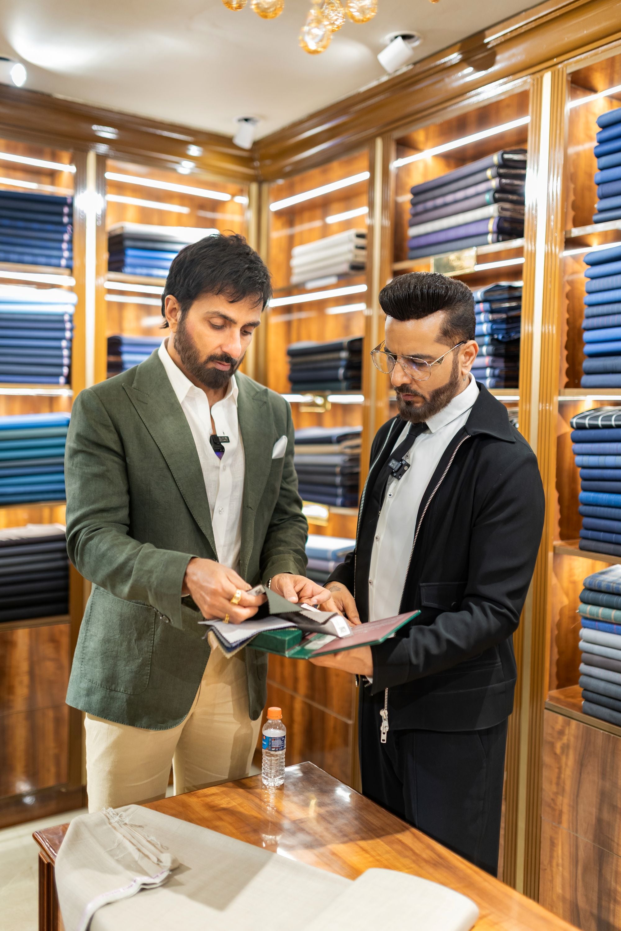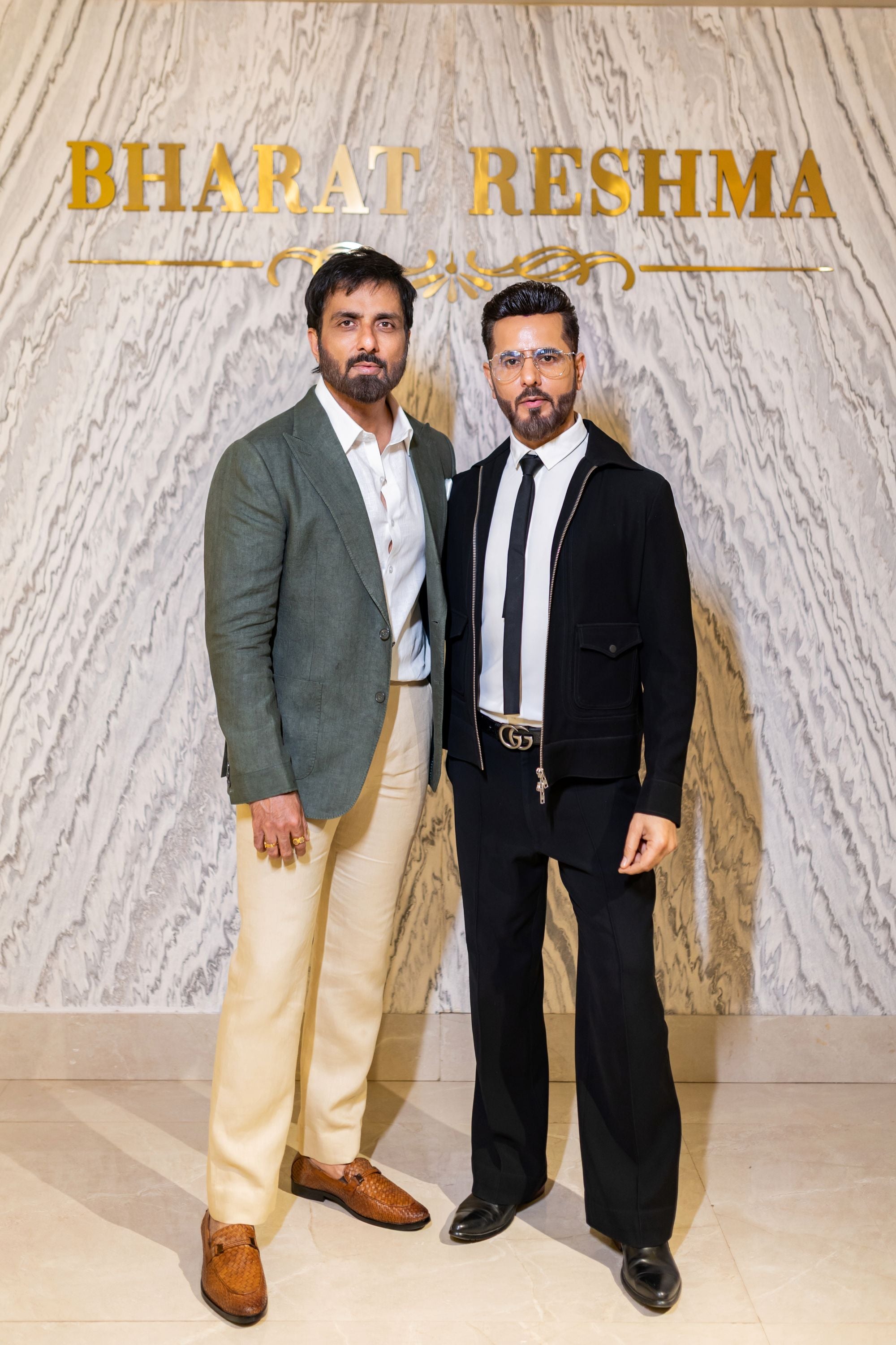 Sonu Sood redefines contemporary elegance in our signature green blazer and beige trousers. Designed to perfection, this ensemble blends subtle charm with bold confidence, making it a statement of power and poise — the true spirit of Bharat Reshma craftsmanship.