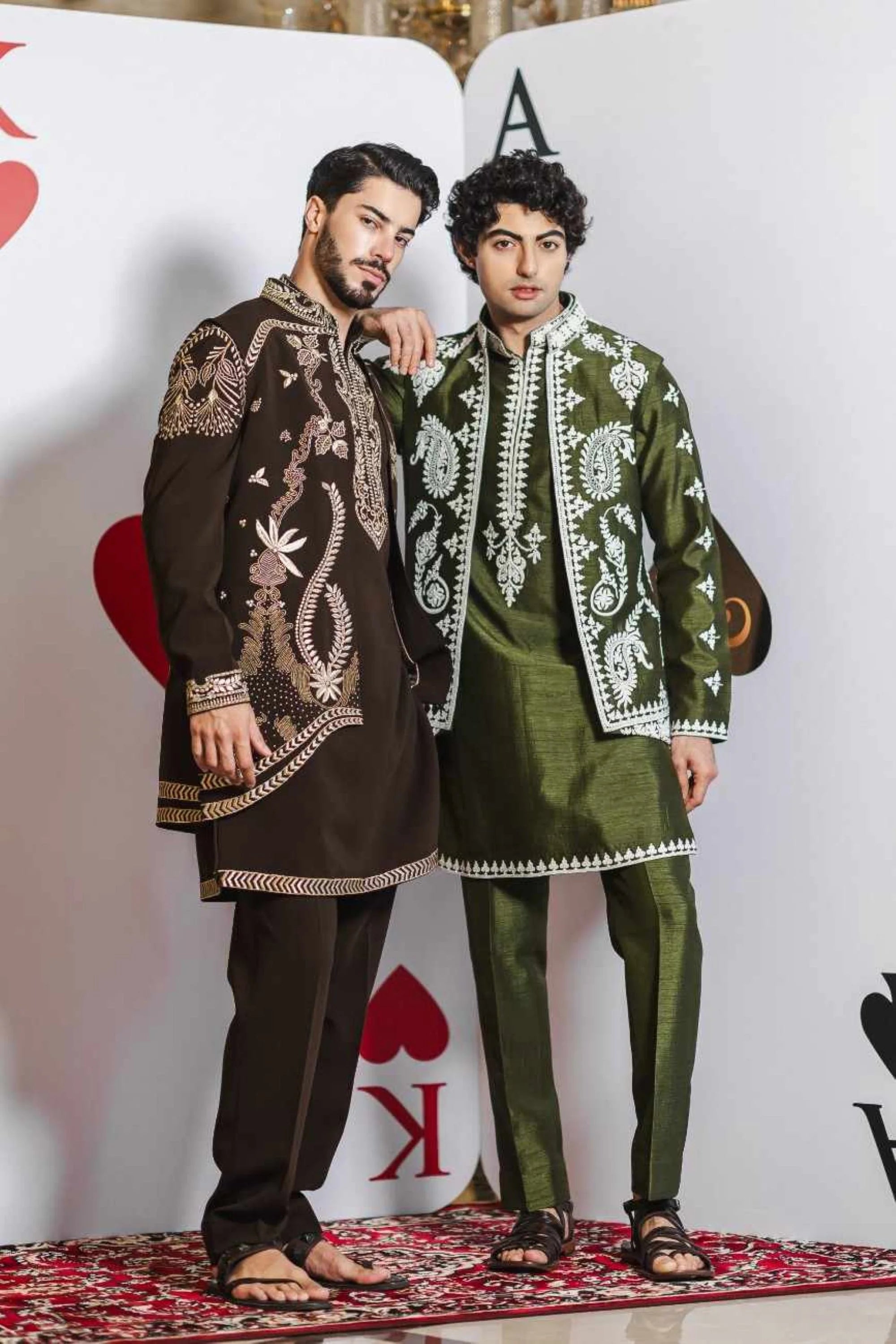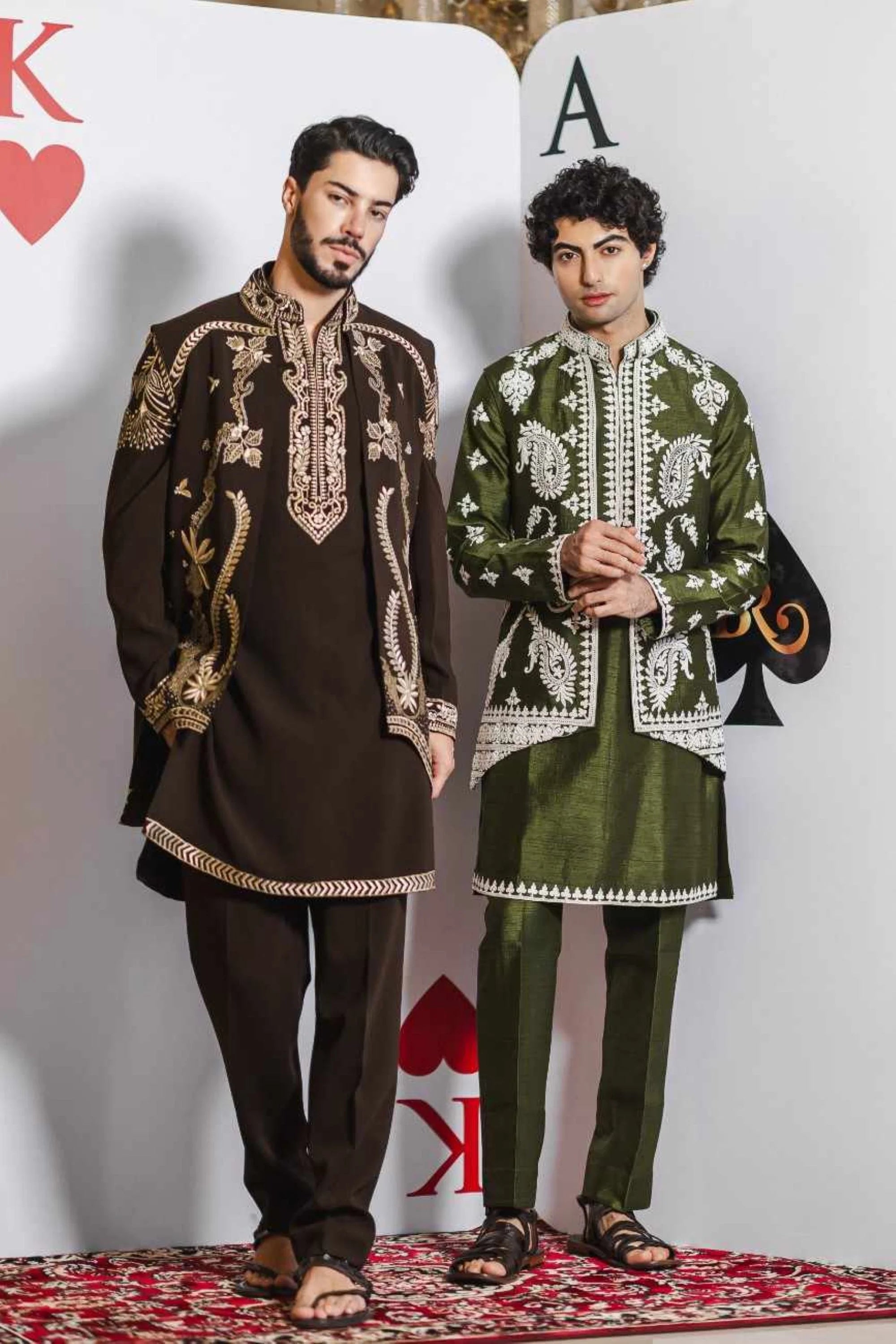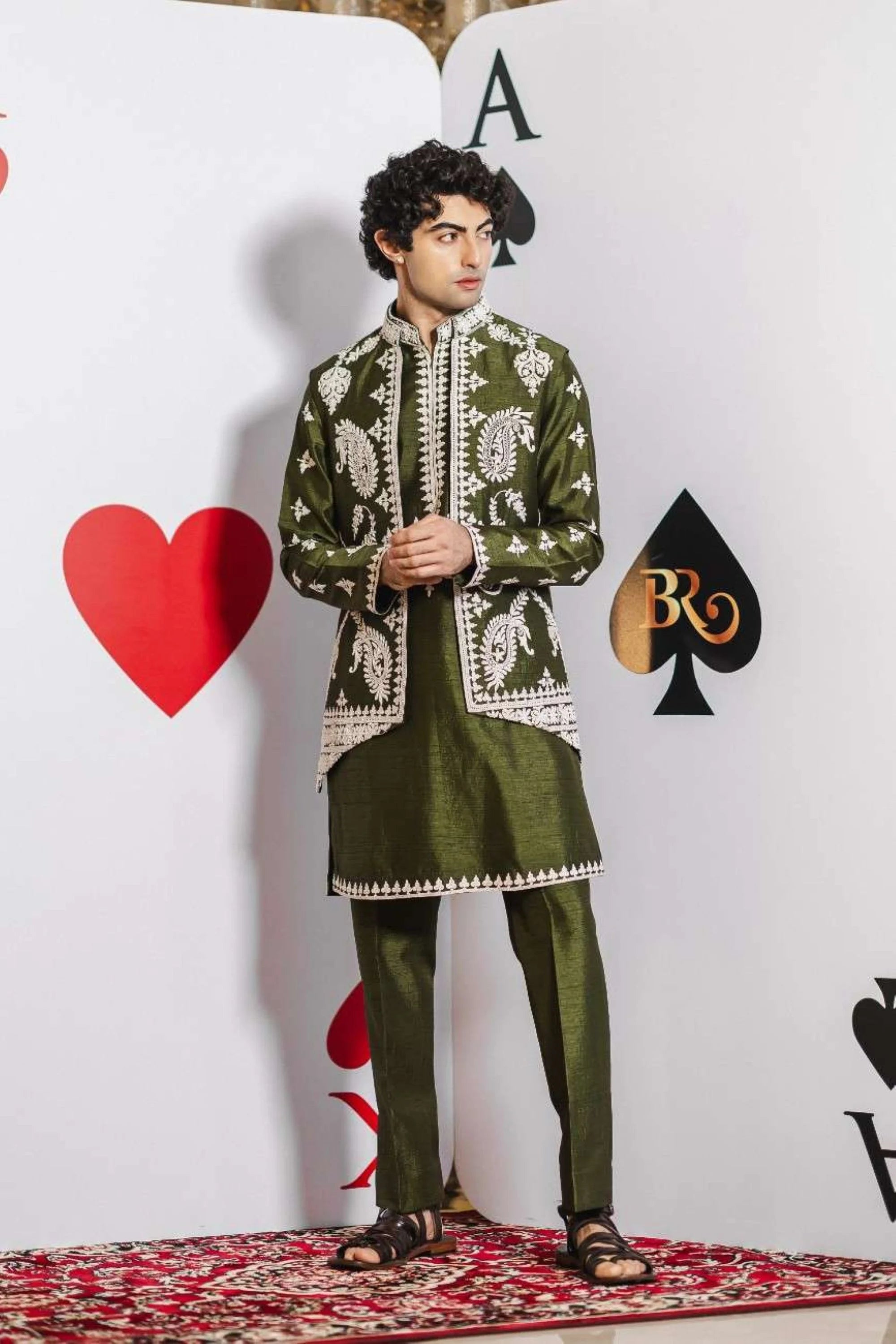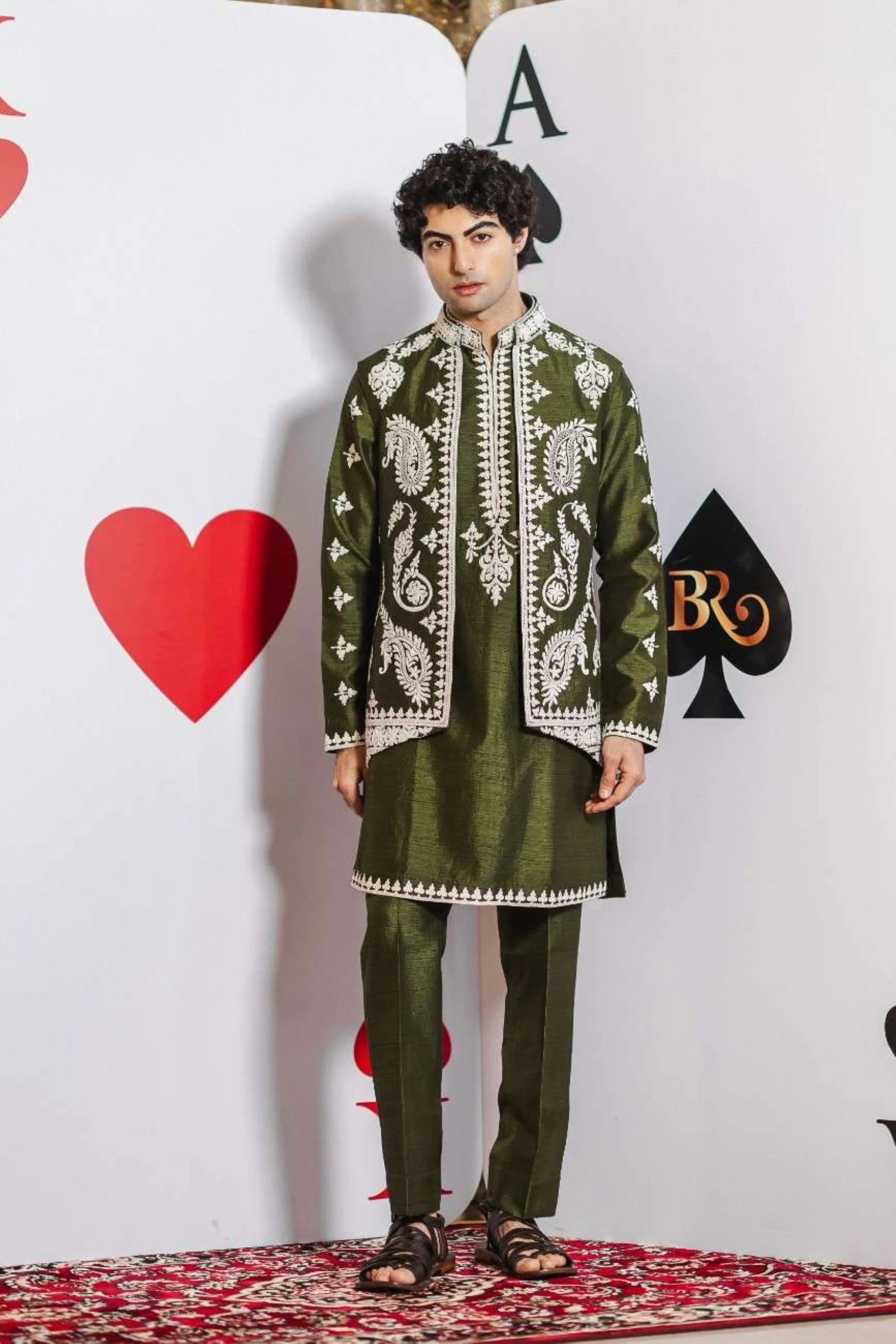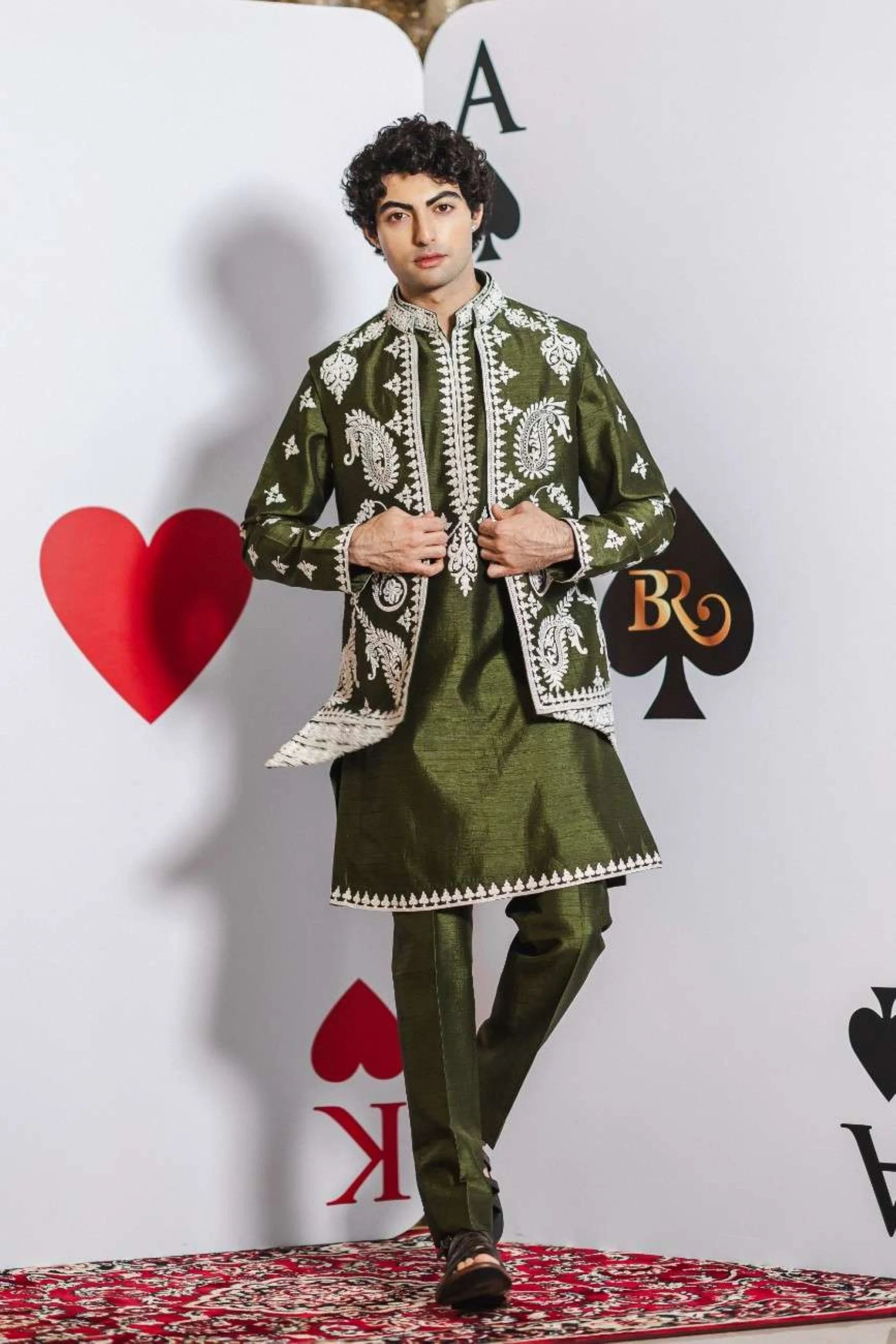 Celebrate festive elegance with the Sufi Green Bundi Set. Crafted from luxurious seaweed green silk satin, this kurta-bundi and pants set features intricate white dori embroidery enhanced with delicate handwork, creating a perfect balance of sophistication and artisanal charm. Ideal for weddings, Diwali, and special occasions, it combines traditional craftsmanship with modern festive style.