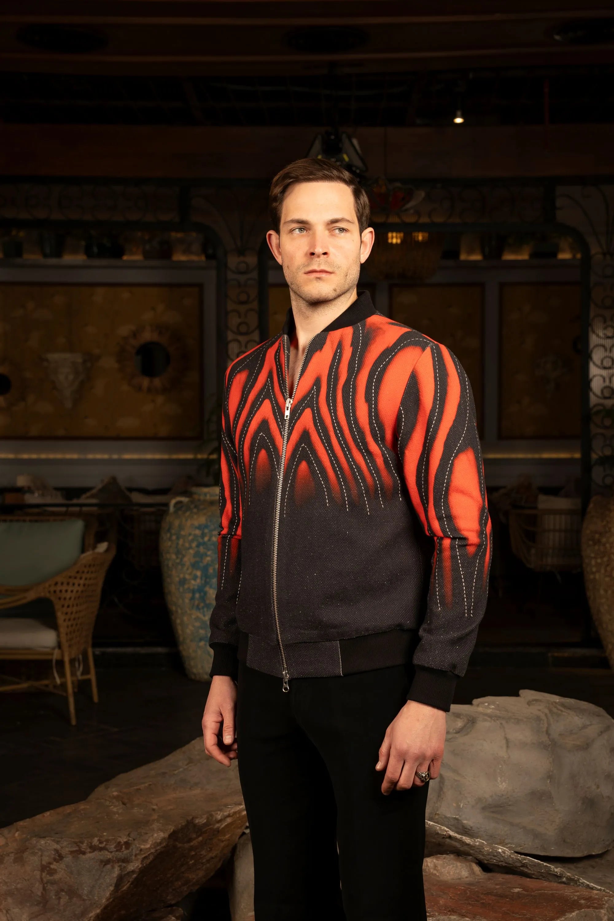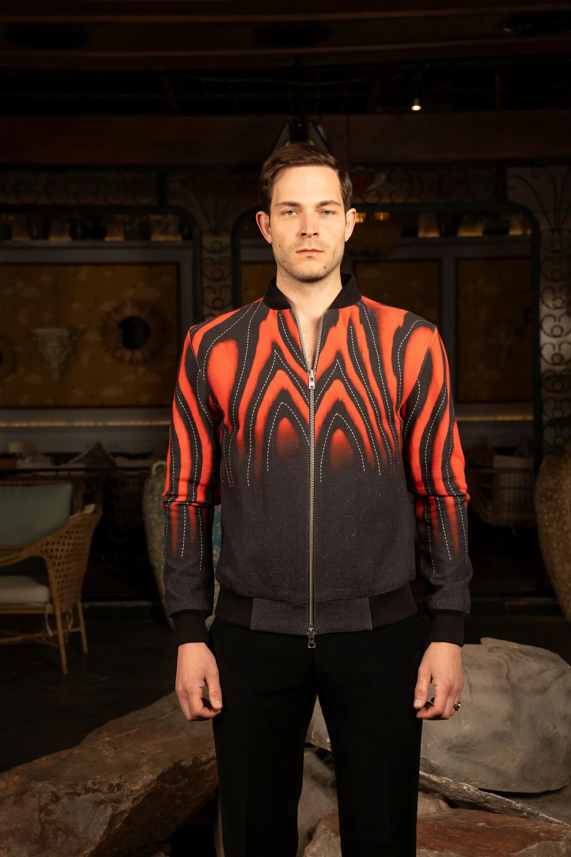 Exclusive digital print jacket featuring a ribbed design and a striking sunset-to-dawn gradient effect for a bold, contemporary statement.