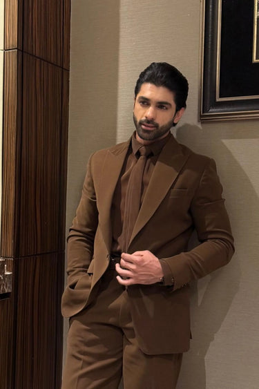 A refined expression of modern elegance, this signature Brown 2-Piece Suit is crafted from premium Meghna fabric and worn by Taha Shah Badussha.