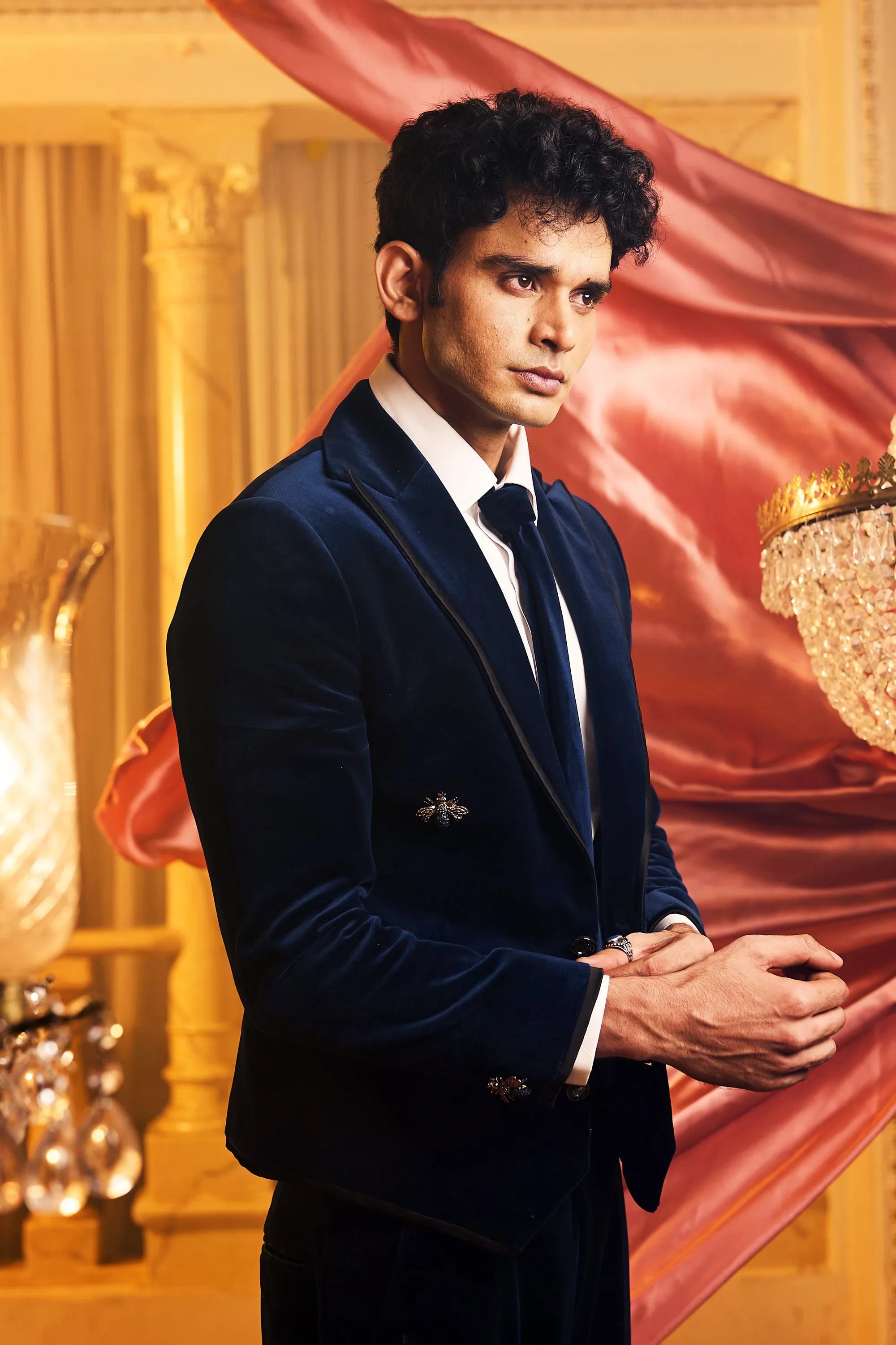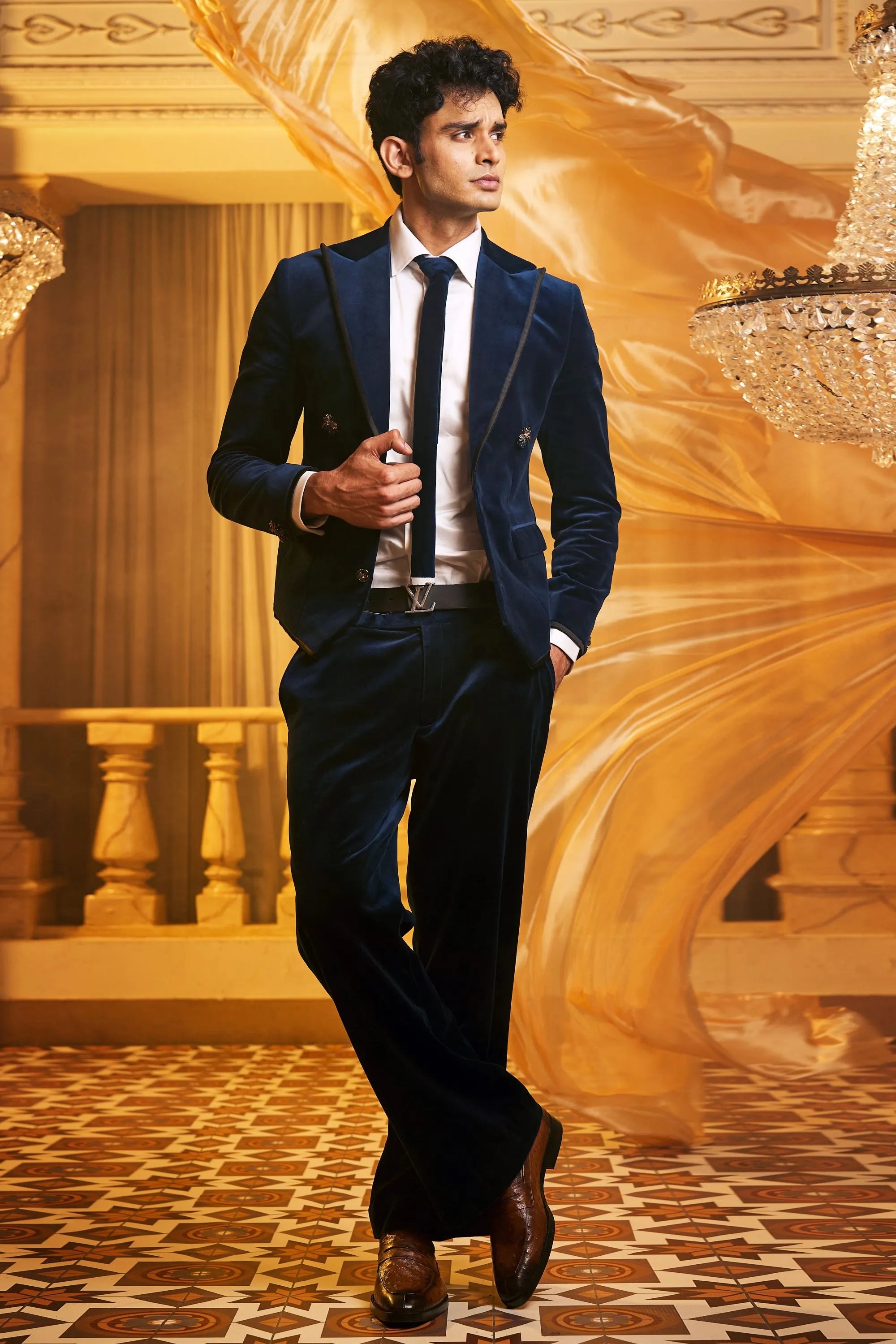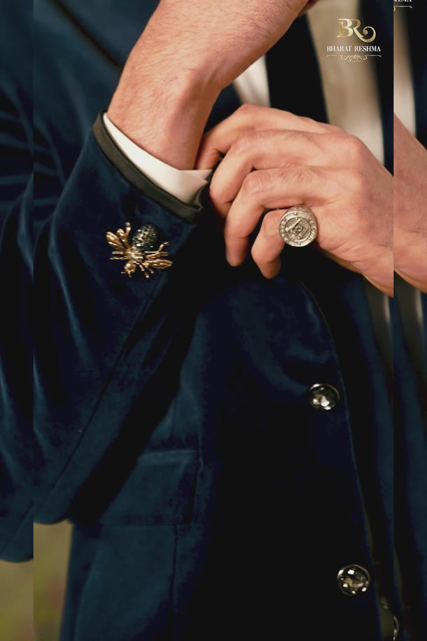 This teal blue silk velvet Tuxedo features refined satin detailing on the lapel, giving it a sleek semi-formal appeal. Perfect for evening gatherings, it blends rich texture with modern sophistication.